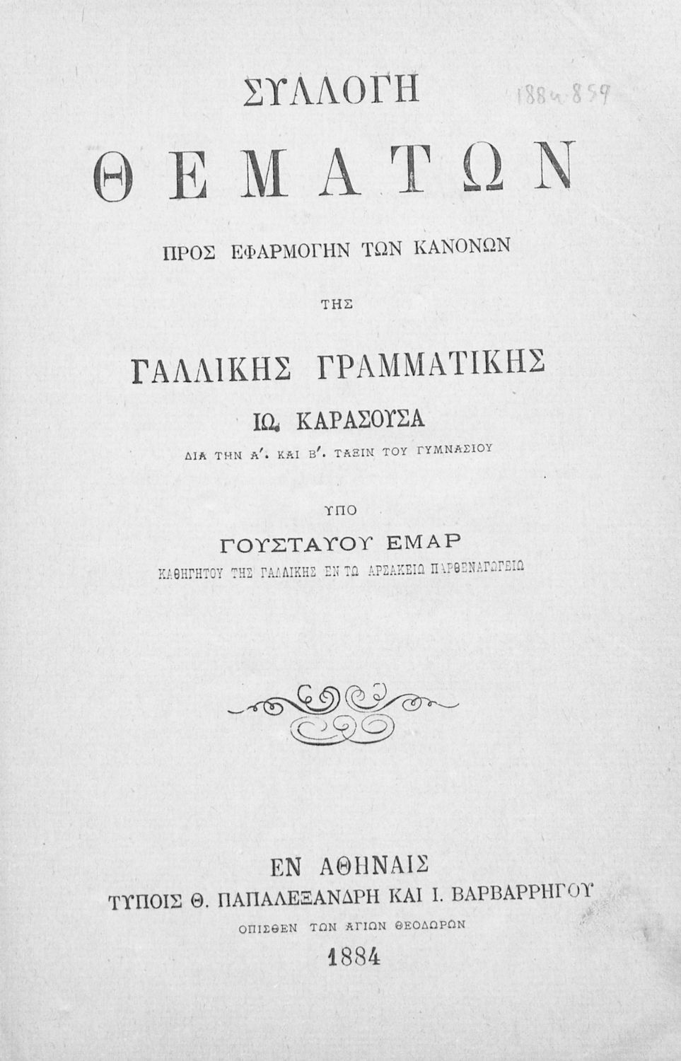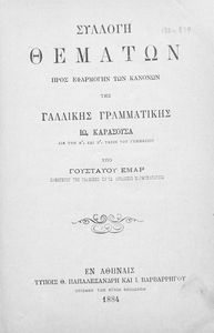 Κωδικός αναγνώρισης: 02-02549 Τίτλος: Συλλογή θεμάτων προς εφαρμογήν των κανόνων της γαλλικής γραμματικής Ιω. Καρασούσα, διά την Α΄ και Β΄ τάξιν του Γυμνασίου Συγγραφέας: Γουσταύος Εμάρ Μέγεθος και υπόστρωμα: Μαθητικό βοήθημα, μαλακό εξώφυλλο, 40 σελίδες. |