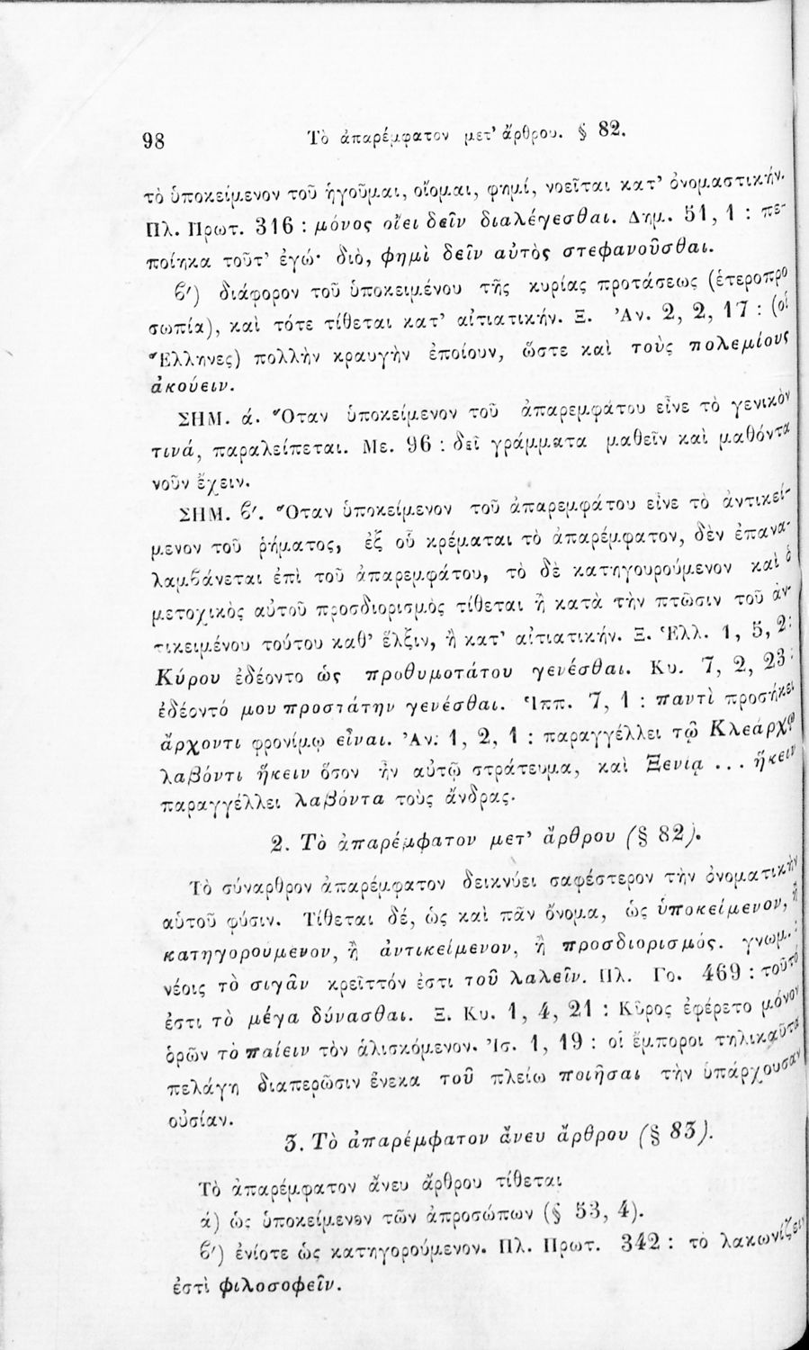 Σχολικό εγχειρίδιο Αρχαίων Ελληνικών για τα Ελληνικά Σχολεία, Παρθεναγωγεία και Γυμνάσια που περιέχει τους κανόνες γραμματικής και είναι χωρισμένο σε φθογγολογικό, τυπολογικό και ετυμολογικό μέρος.