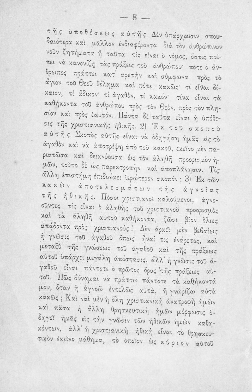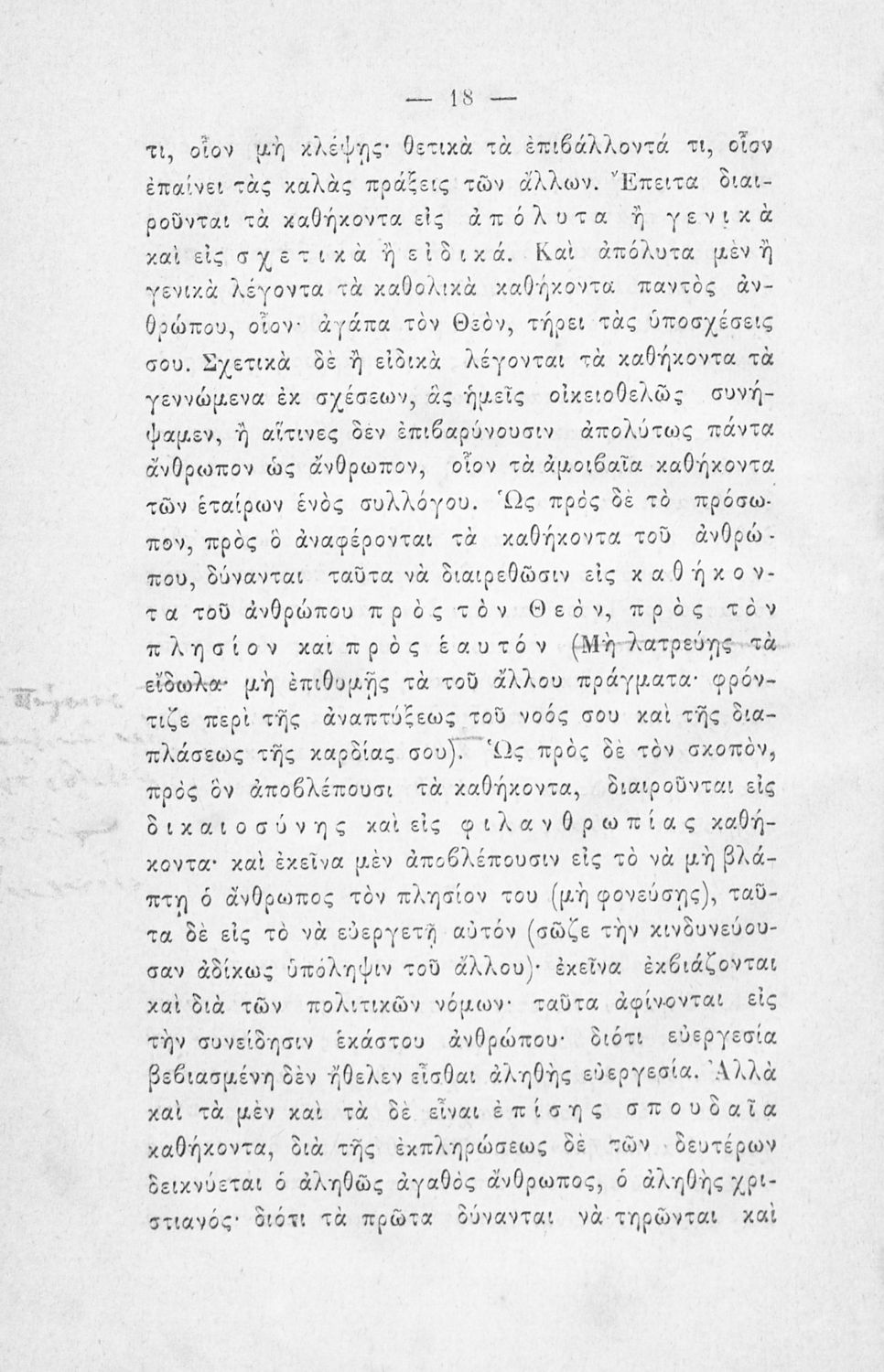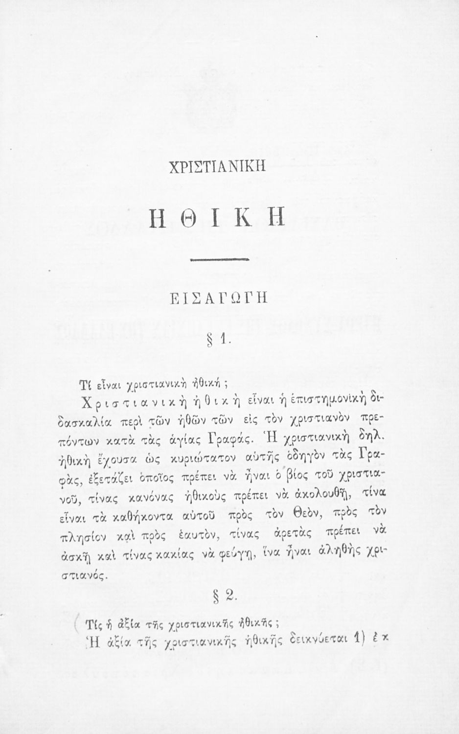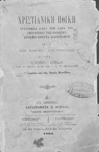 Βαθμίδα εκπαίδευσης: Δευτεροβάθμια Τάξη: Γυμνάσιο Μάθημα: Θρησκευτικά Γλώσσα: Καθαρεύουσα Παρουσίαση περιεχομένου: Σχολικό εγχειρίδιο Θρησκευτικών για τα Γυμνάσια που εστιάζει στη χριστιανική ηθική και αναλύει τα καθήκοντα του ανθρώπου προς τον Θεό, τους άλλους ανθρώπους και τον εαυτό του. |