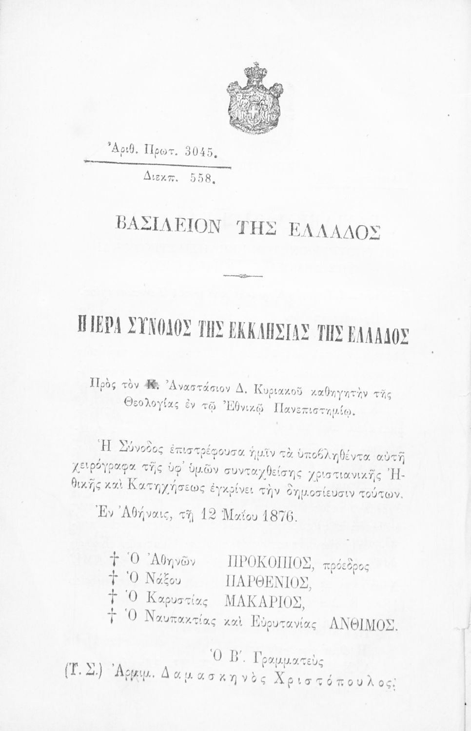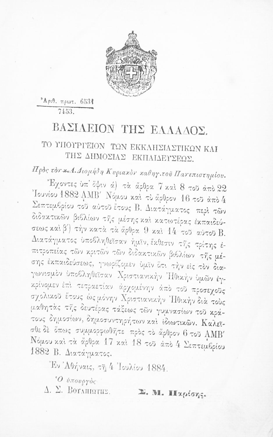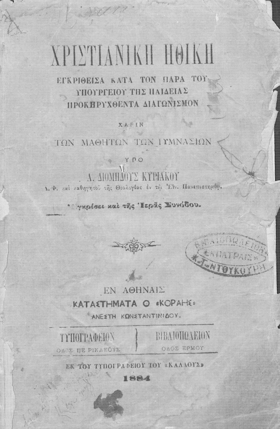 Εκδότης: Ανέστης Κωνσταντινίδης Έτος έκδοσης: 1884 Τόπος έκδοσης: Αθήνα Υπουργική απόφαση / Σύμβαση: 6534/ 4-7-1884 Έτος έγκρισης: 1884 |