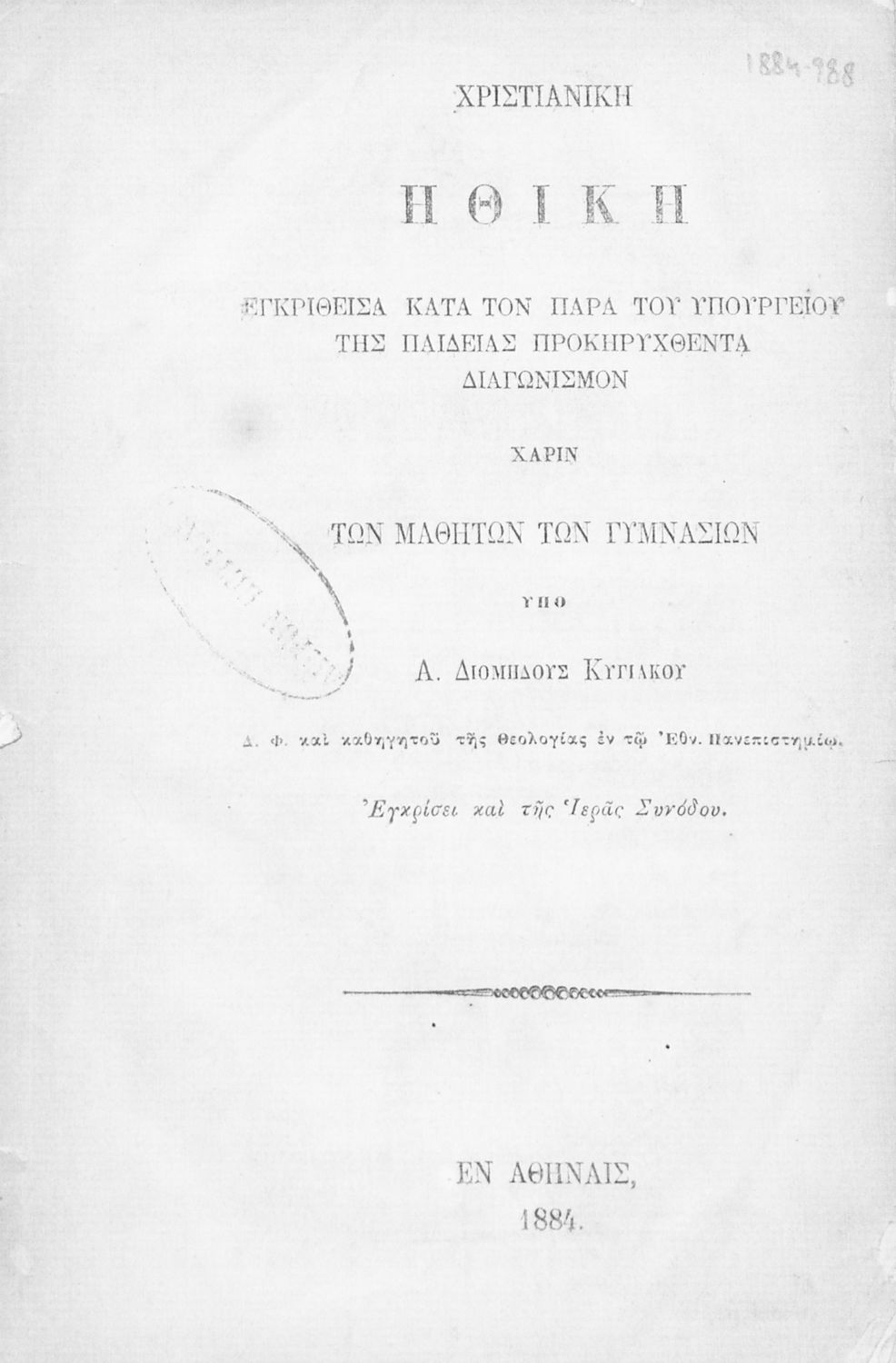 Κωδικός αναγνώρισης: 02-02560 Τίτλος: Χριστιανική ηθική εγκριθείσα κατά τον παρά του υπουργείου της παιδείας προκηρυχθέντα διαγωνισμόν χάριν των μαθητών των Γυμνασίων Συγγραφέας: Α. Διομήδης Κυριακός Μέγεθος και υπόστρωμα: Σχολικό εγχειρίδιο, μαλακό εξώφυλλο, 128 σελίδες. |