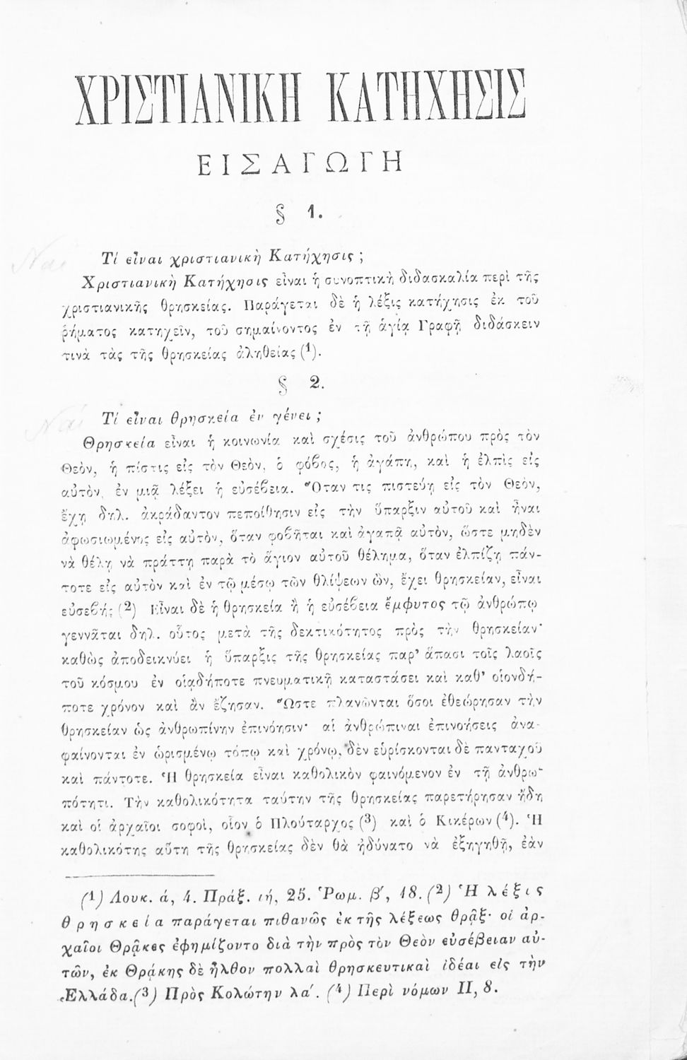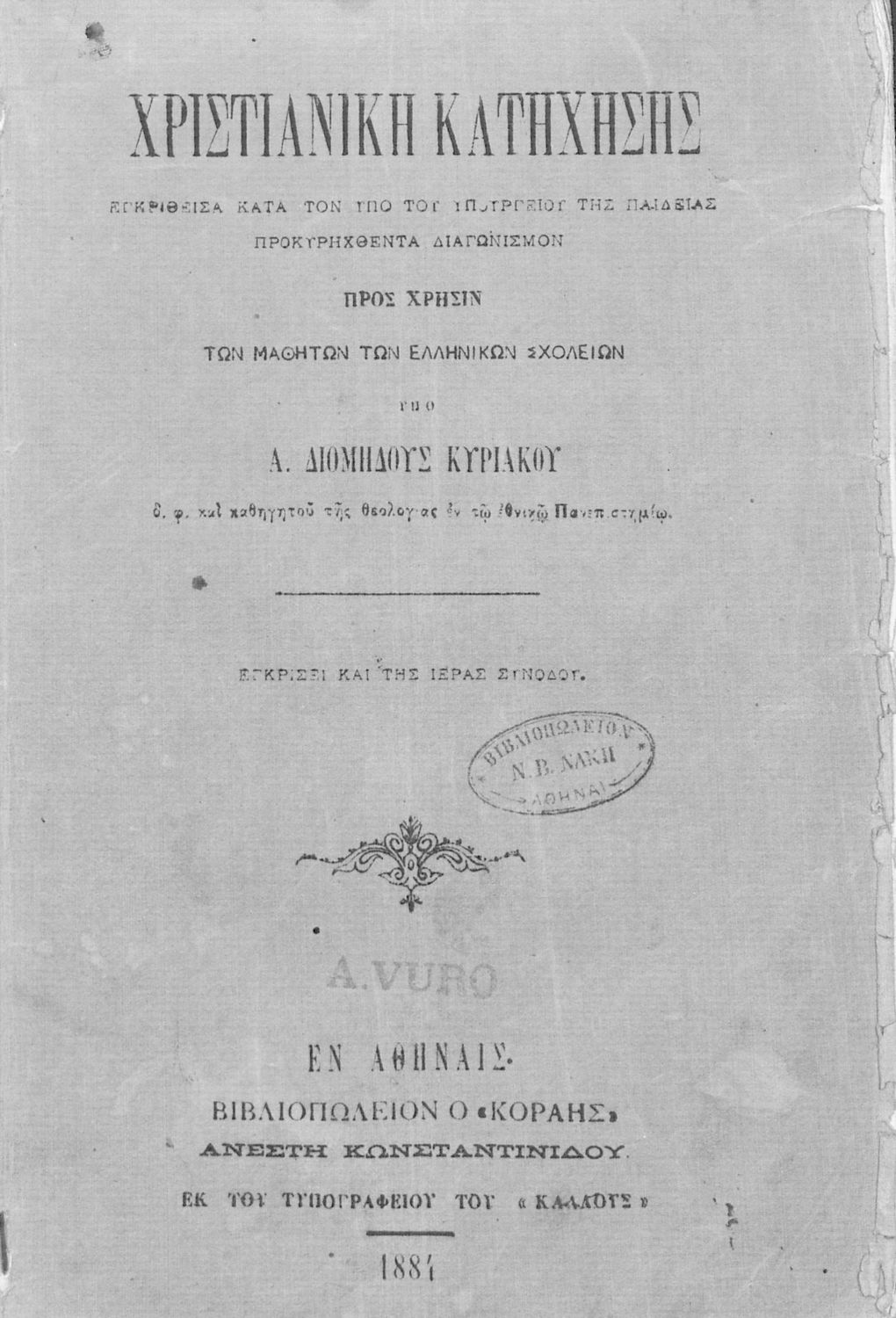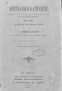 Κωδικός αναγνώρισης: 02-02561 Τίτλος: Χριστιανική Κατήχησις, προς χρήσιν των μαθητών των Ελληνικών σχολείων Συγγραφέας: Α. Διομήδης Κυριακός Μέγεθος και υπόστρωμα: Σχολικό εγχειρίδιο, μαλακό εξώφυλλο, 92 σελίδες. |