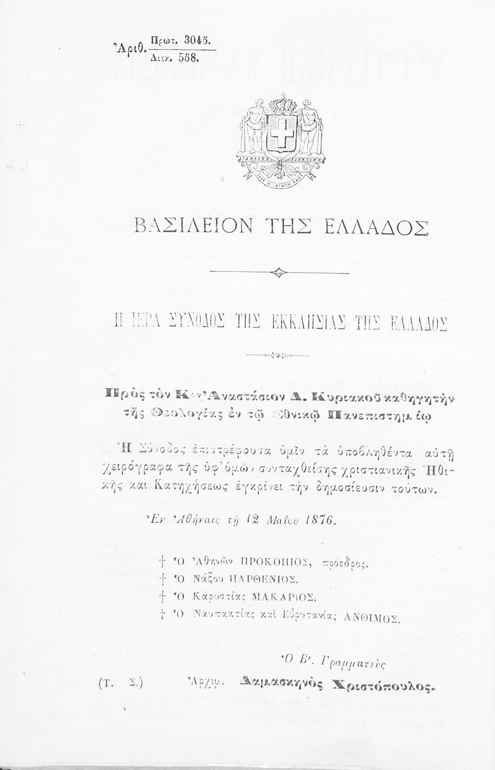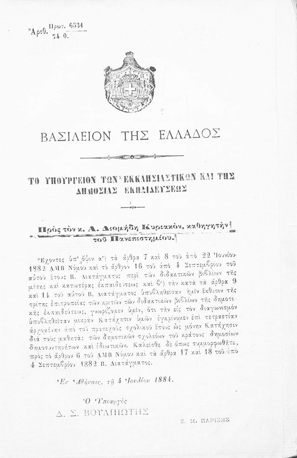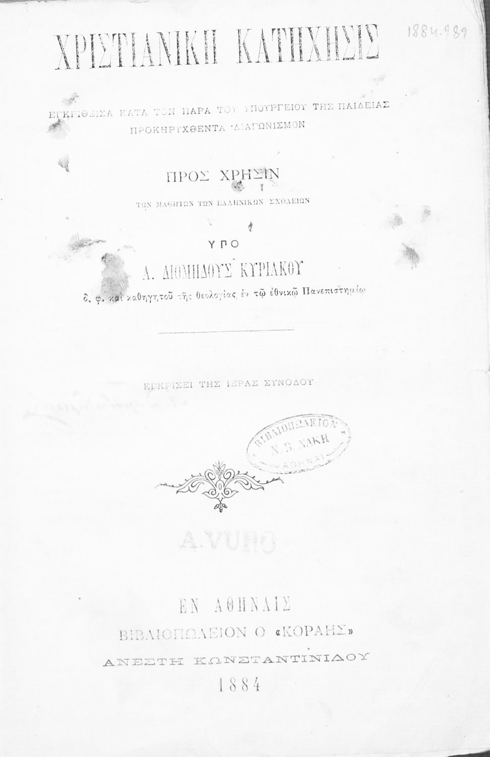 Εκδότης: Ανέστης Κωνσταντινίδης Έτος έκδοσης: 1884 Τόπος έκδοσης: Αθήνα Υπουργική απόφαση / Σύμβαση: 6534 |