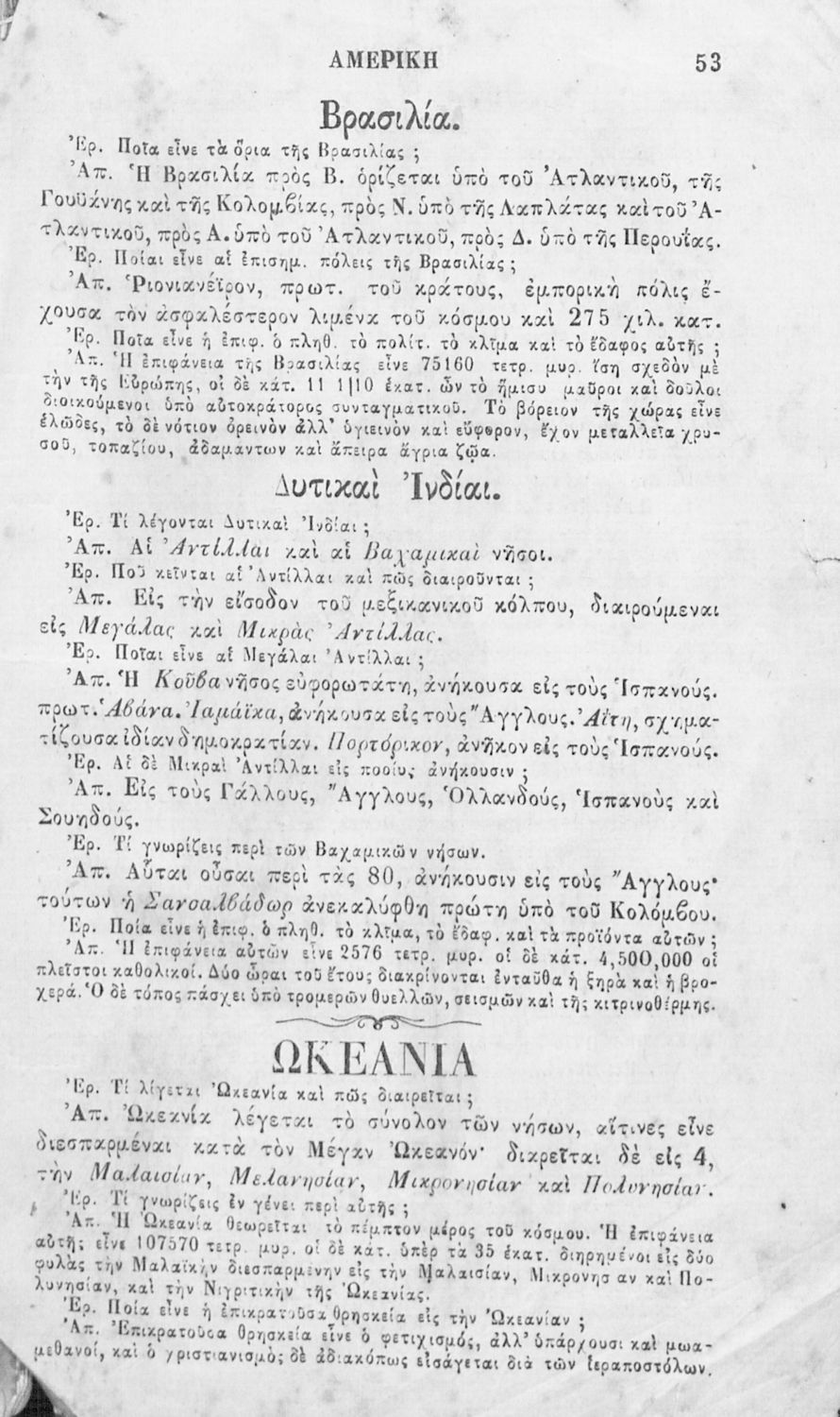 Βαθμίδα εκπαίδευσης: Πρωτοβάθμια Μάθημα: Γεωγραφία Γλώσσα: Καθαρεύουσα Παρουσίαση περιεχομένου: Σχολικό εγχειρίδιο Γεωγραφίας Δημοτικού που περιλαμβάνει εισαγωγή στις βασικές έννοιες και ορισμούς της επιστήμης, και στοιχεία μαθηματικής, φυσικής και πολιτικής γεωγραφίας των πέντε ηπείρων. |