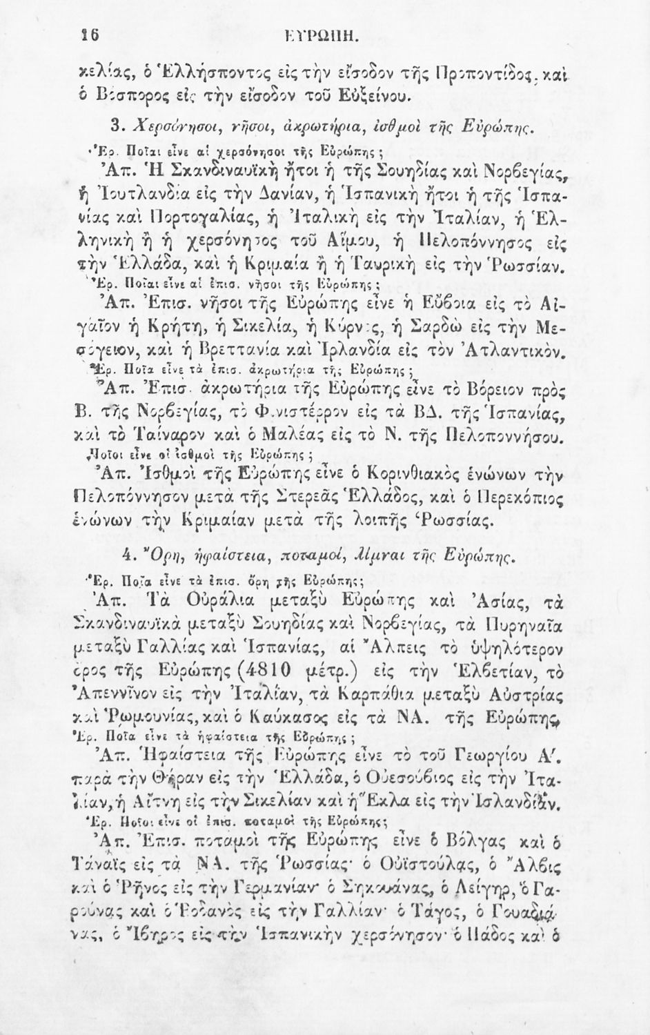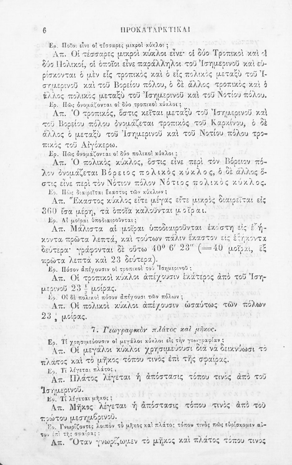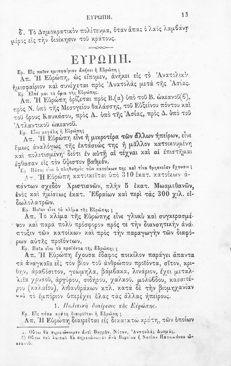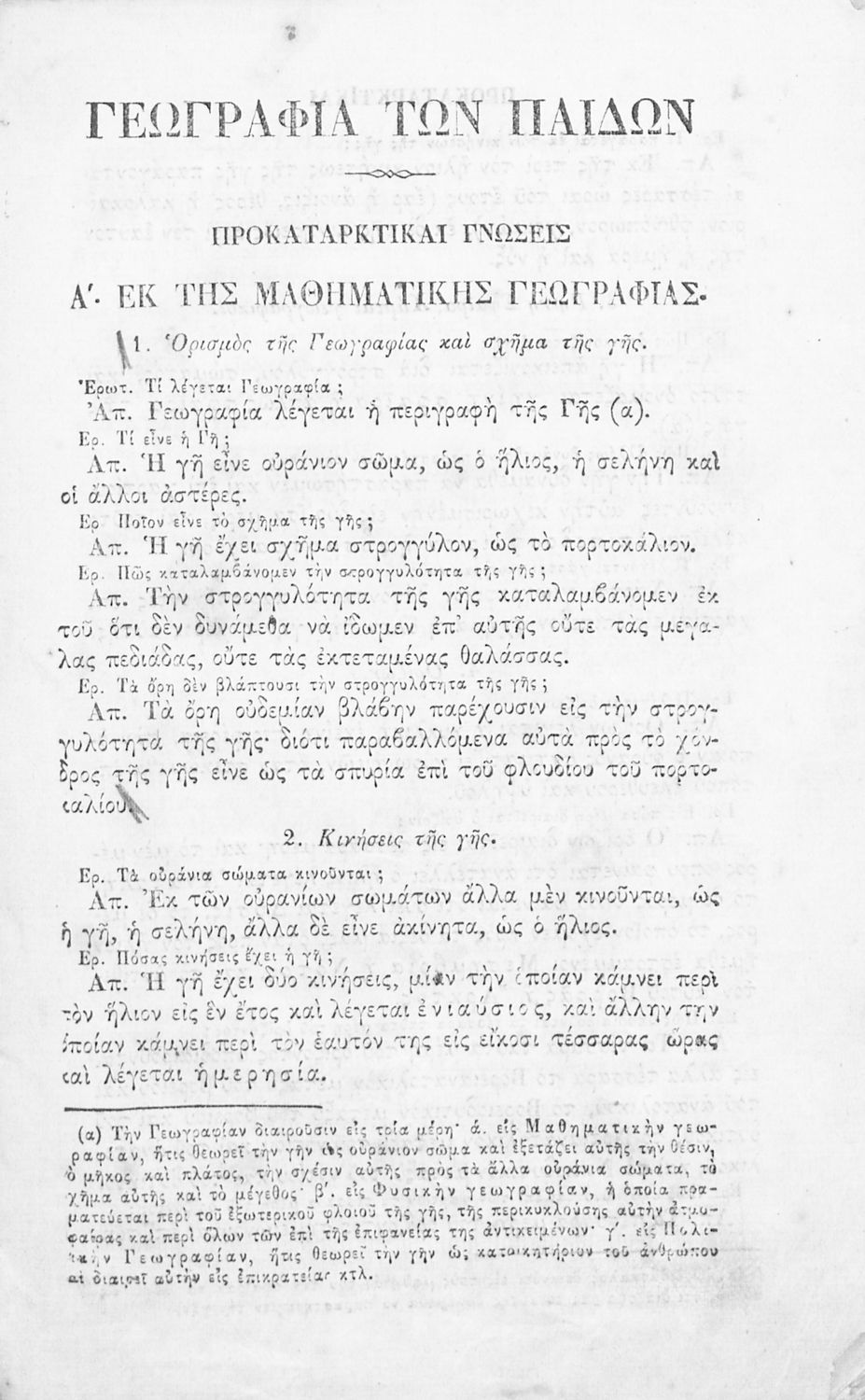 Βαθμίδα εκπαίδευσης: Πρωτοβάθμια Μάθημα: Γεωγραφία Γλώσσα: Καθαρεύουσα Παρουσίαση περιεχομένου: Σχολικό εγχειρίδιο Γεωγραφίας Δημοτικού που περιλαμβάνει εισαγωγή στις βασικές έννοιες και ορισμούς της επιστήμης, και στοιχεία μαθηματικής, φυσικής και πολιτικής γεωγραφίας των πέντε ηπείρων. |