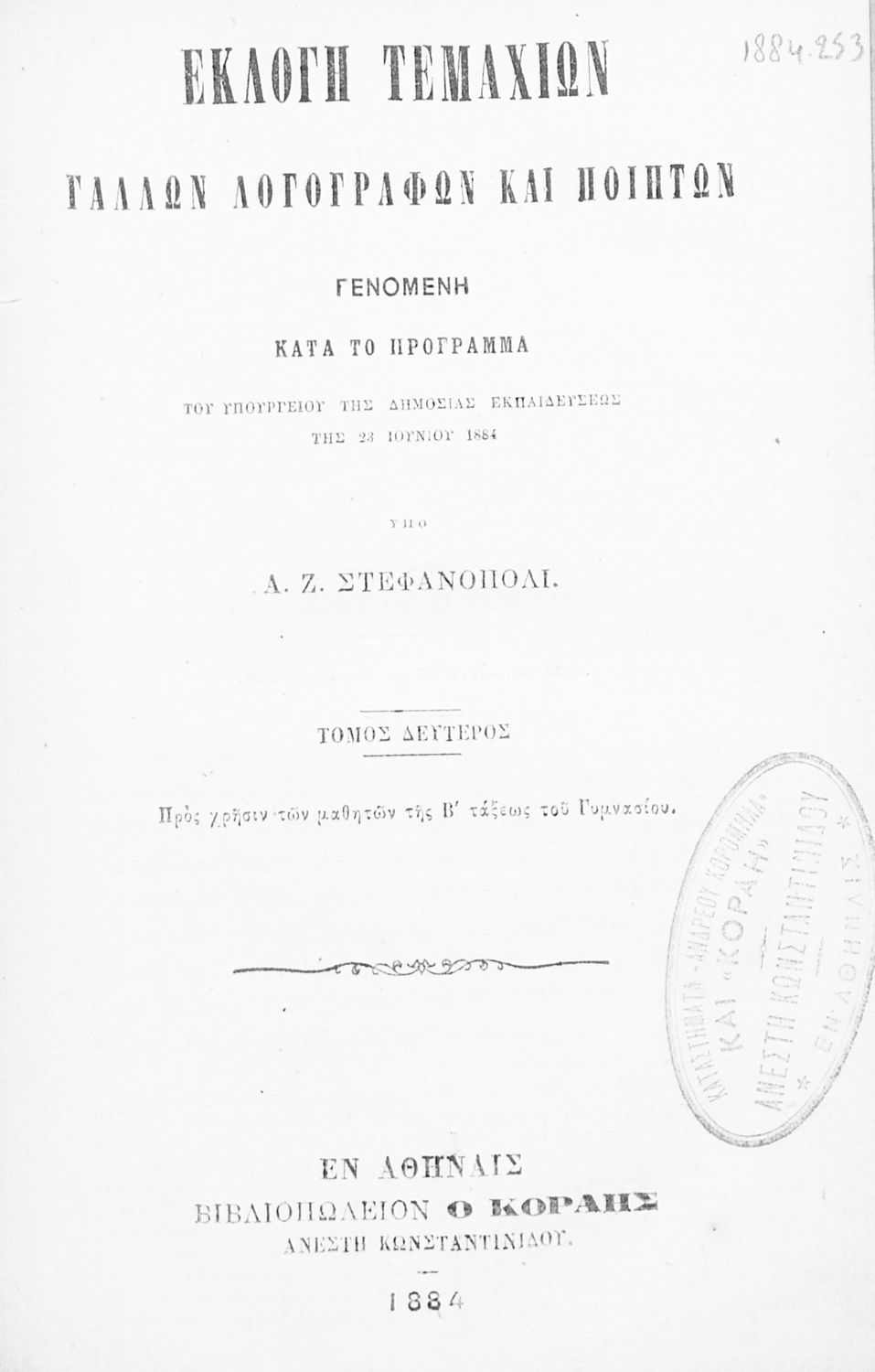 245 0# _aΕκλογή τεμαχίων Γάλλων λογογράφων και ποιητών, Τόμος δεύτερος, προς χρήσιν των μαθητών της Β΄ τάξεως του Γυμνασίου