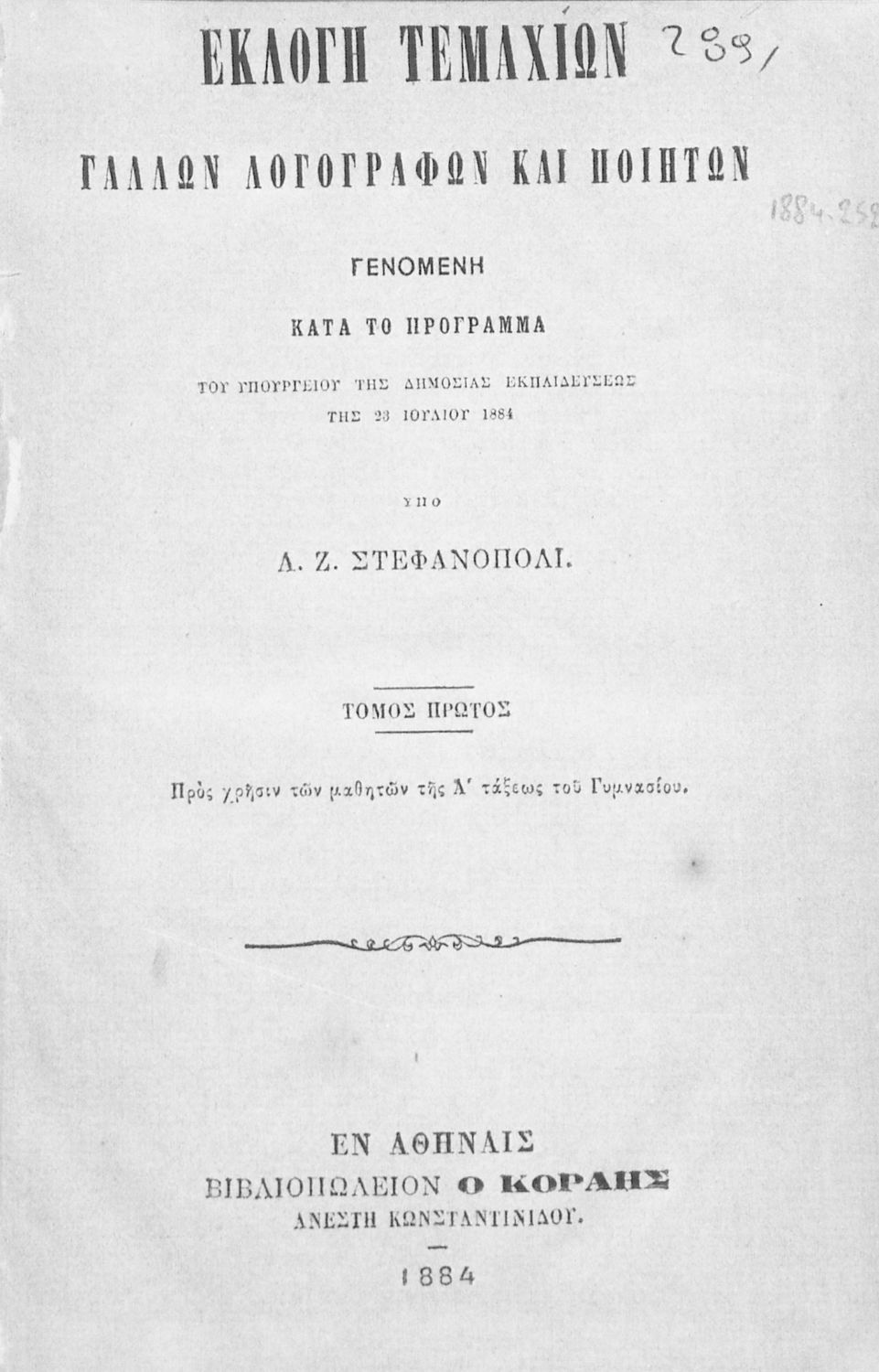 Τίτλος: Εκλογή τεμαχίων Γάλλων λογογράφων και ποιητών, Τόμος πρώτος, προς χρήσιν των μαθητών της Α΄ τάξεως του Γυμνασίου
