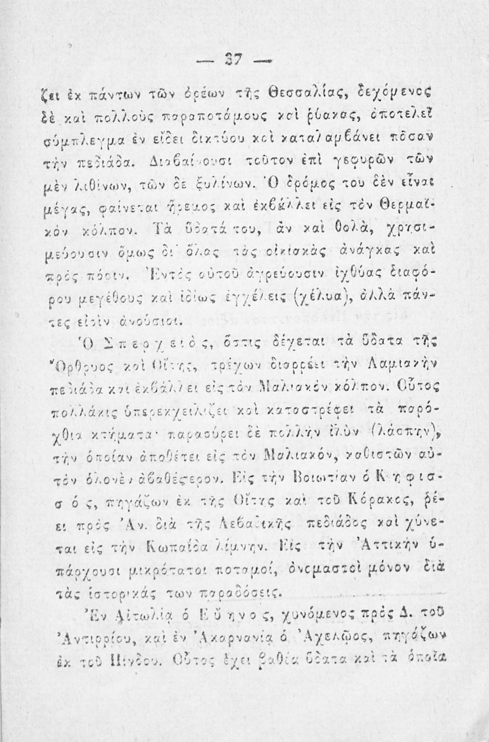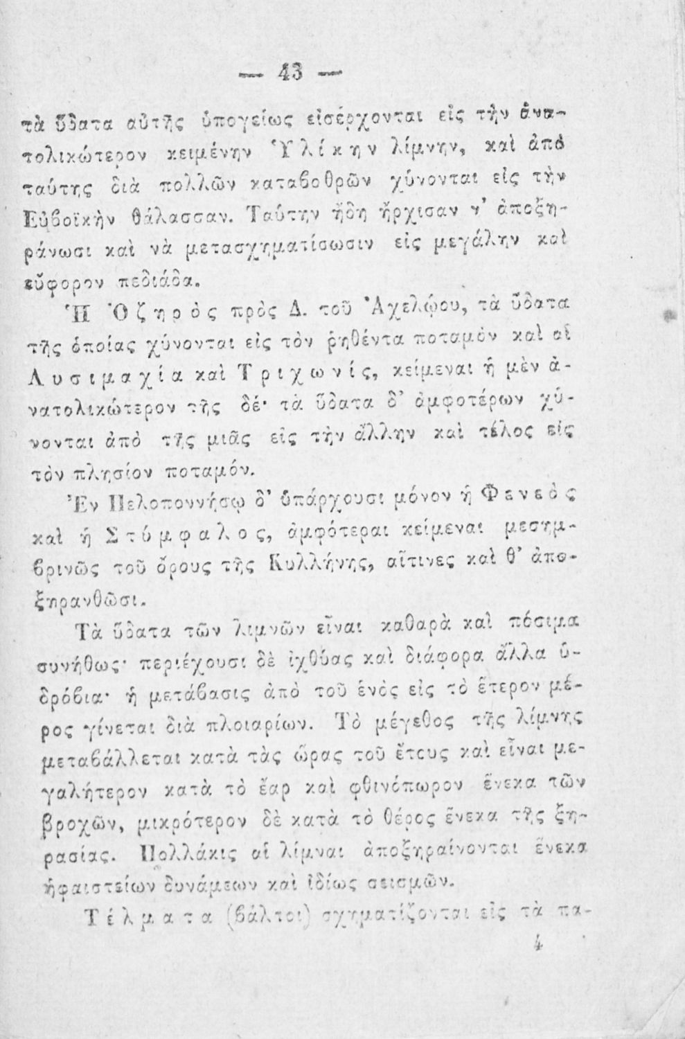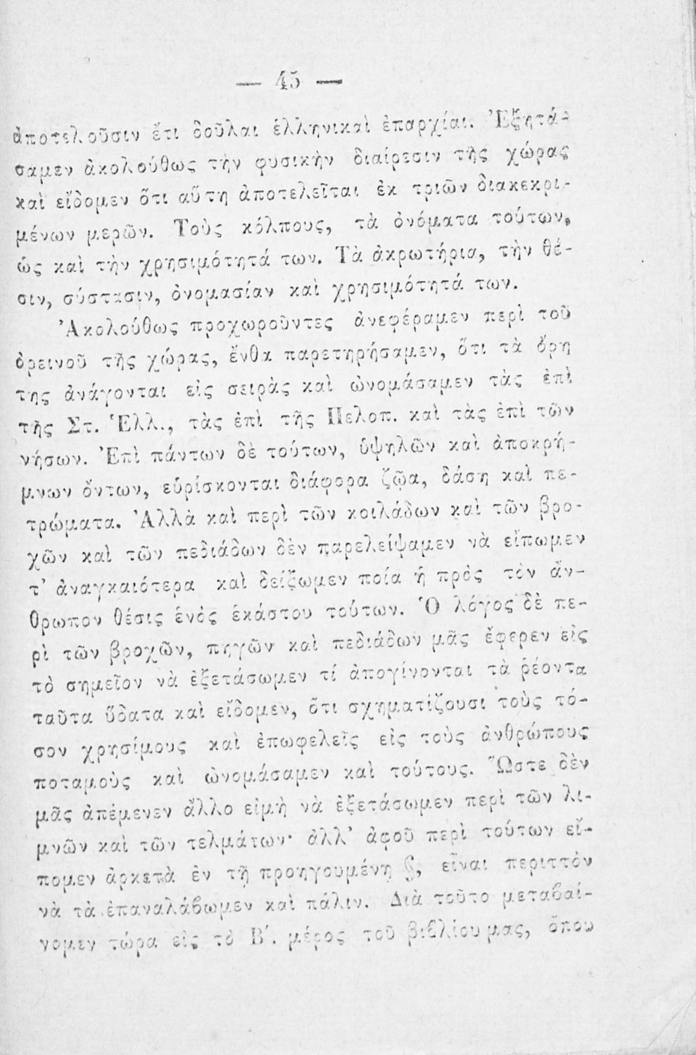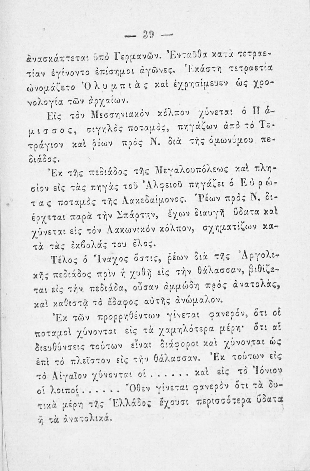 Παρουσίαση περιεχομένου: Σχολικό εγχειρίδιο Γεωγραφίας για τα Δημοτικά και Ελληνικά Σχολεία που περιλαμβάνει τη γεωμορφολογική, γεωφυσική, πολιτική, ιστορική και οικονομική γεωγραφία της Ελλάδας. Προτρέπει τους μαθητές να αγωνιστούν για μια "μεγάλη ελεύθερη Ελλάδα".