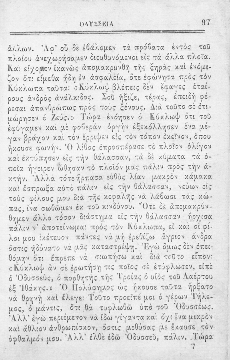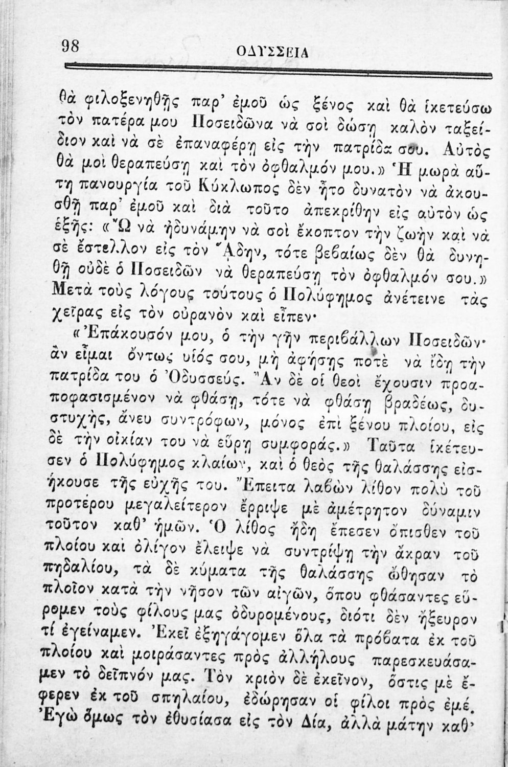 Παρουσίαση περιεχομένου: Αναγνωστικό για τα Δημοτικά Σχολεία και Παρθεναγωγεία που εξιστορεί τις περιπέτειες του Οδυσσέα. Το κείμενο συνοδεύεται από γλωσσικές και ερμηνευτικές σημειώσεις.