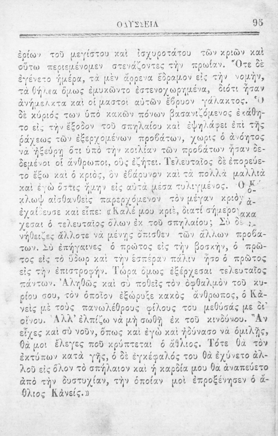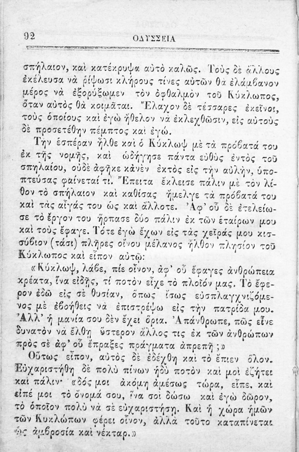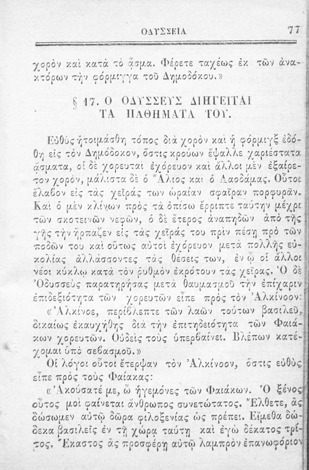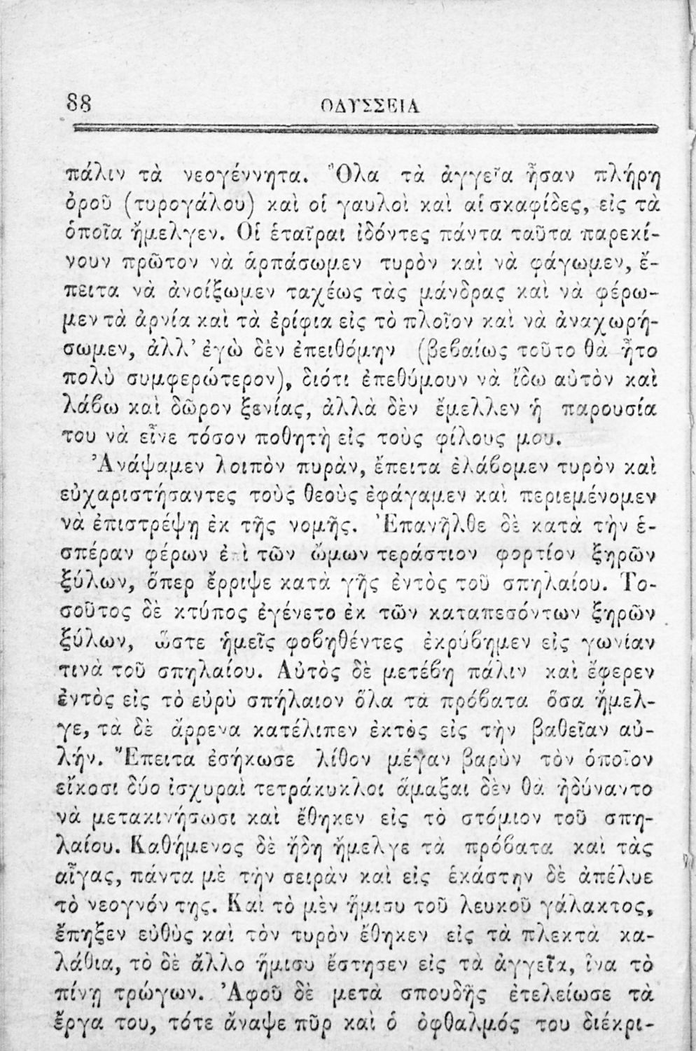 Παρουσίαση περιεχομένου: Αναγνωστικό για τα Δημοτικά Σχολεία και Παρθεναγωγεία που εξιστορεί τις περιπέτειες του Οδυσσέα. Το κείμενο συνοδεύεται από γλωσσικές και ερμηνευτικές σημειώσεις.