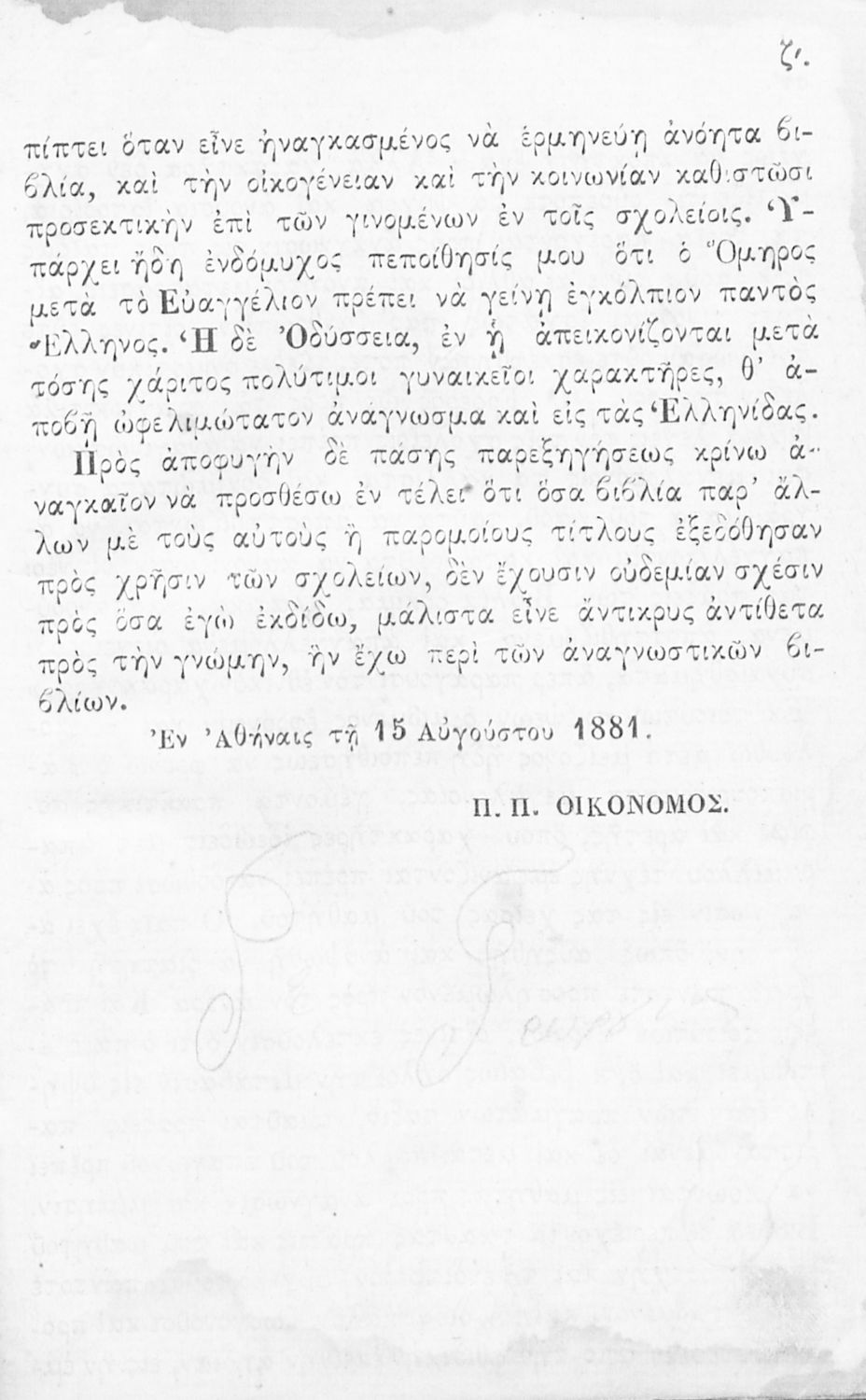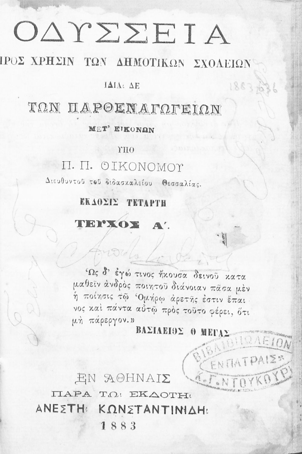 Κωδικός αναγνώρισης: 02-02603 Τίτλος: Ομήρου Οδύσσεια, προς χρήσιν των Δημοτικών Σχολείων, ιδία δε των Παρθεναγωγείων, μετ΄ εικόνων, τεύχος Α΄ Συγγραφέας: Π. Π. Οικονόμος Μέγεθος και υπόστρωμα: Σχολικό εγχειρίδιο, μαλακό εξώφυλλο, 117 σελίδες. Σκίτσα (ασπρόμαυρα). |
