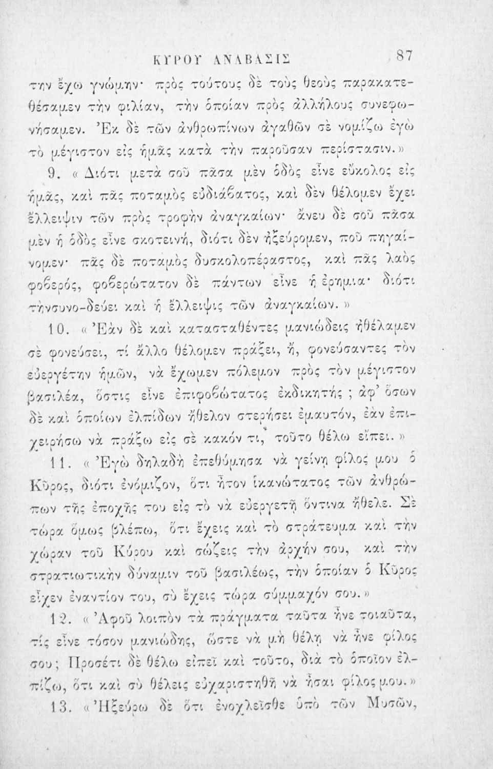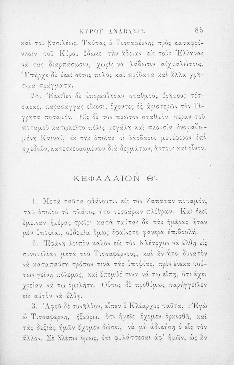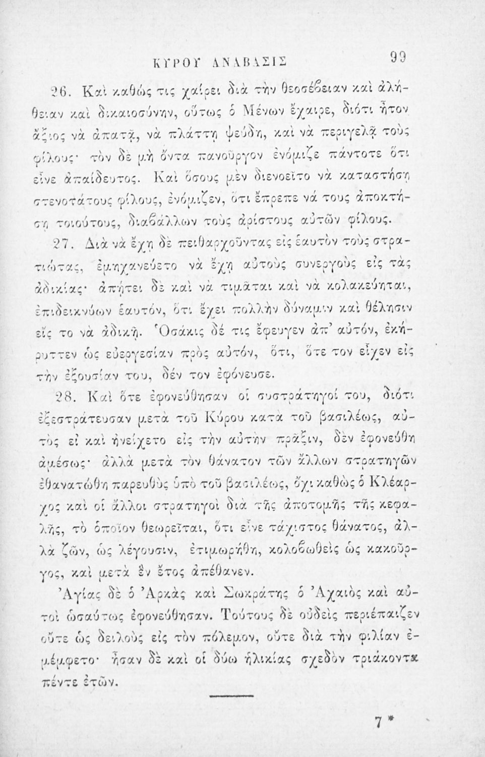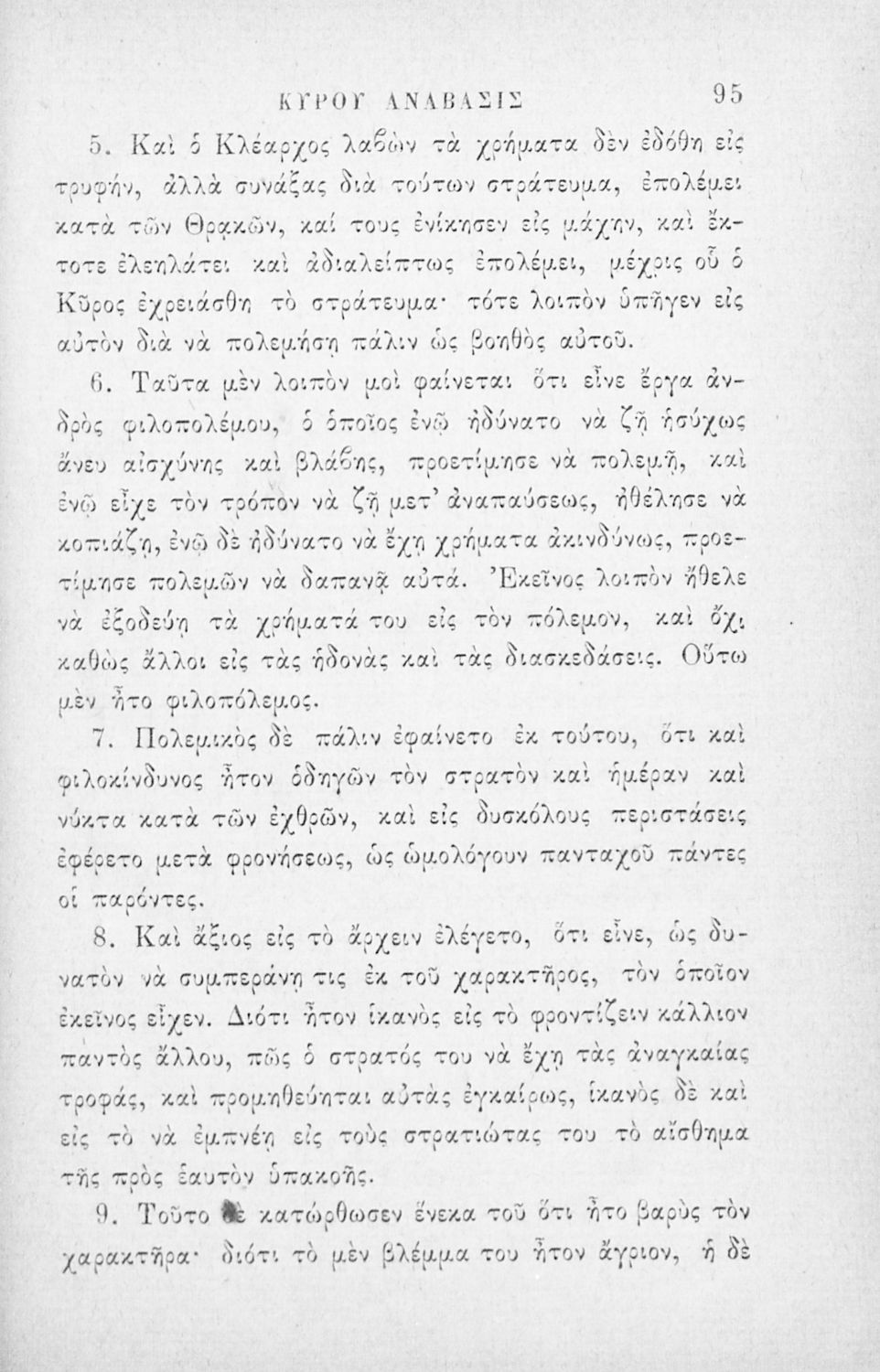 Σχολικό εγχειρίδιο Αρχαίων Ελληνικών για τα Ελληνικά Σχολεία και Παρθεναγωγεία που περιλαμβάνει αποσπάσματα από το έργο του Ξενοφώντα Κύρου Ανάβασις, και λεξικογραφικές παρατηρήσεις.