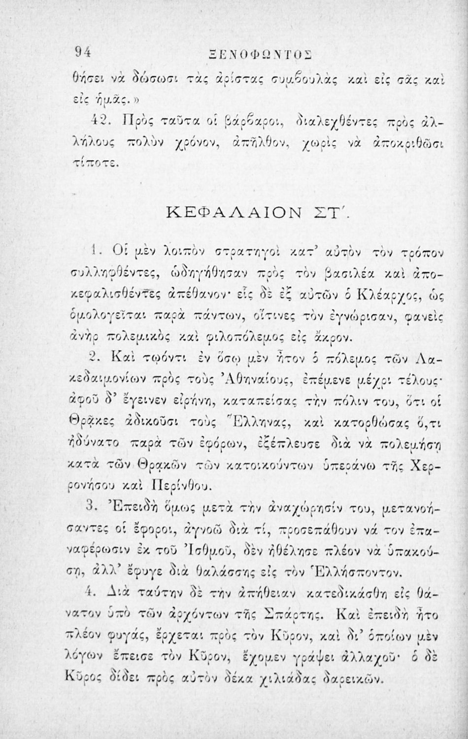 Αναγνωστικό για τις ανώτερες τάξεις του Δημοτικού που περιλαμβάνει μετάφραση των Α΄ και Β΄ βιβλίων του έργου του Ξενοφώντα Κύρου Ανάβασις και λεξιλόγιο.