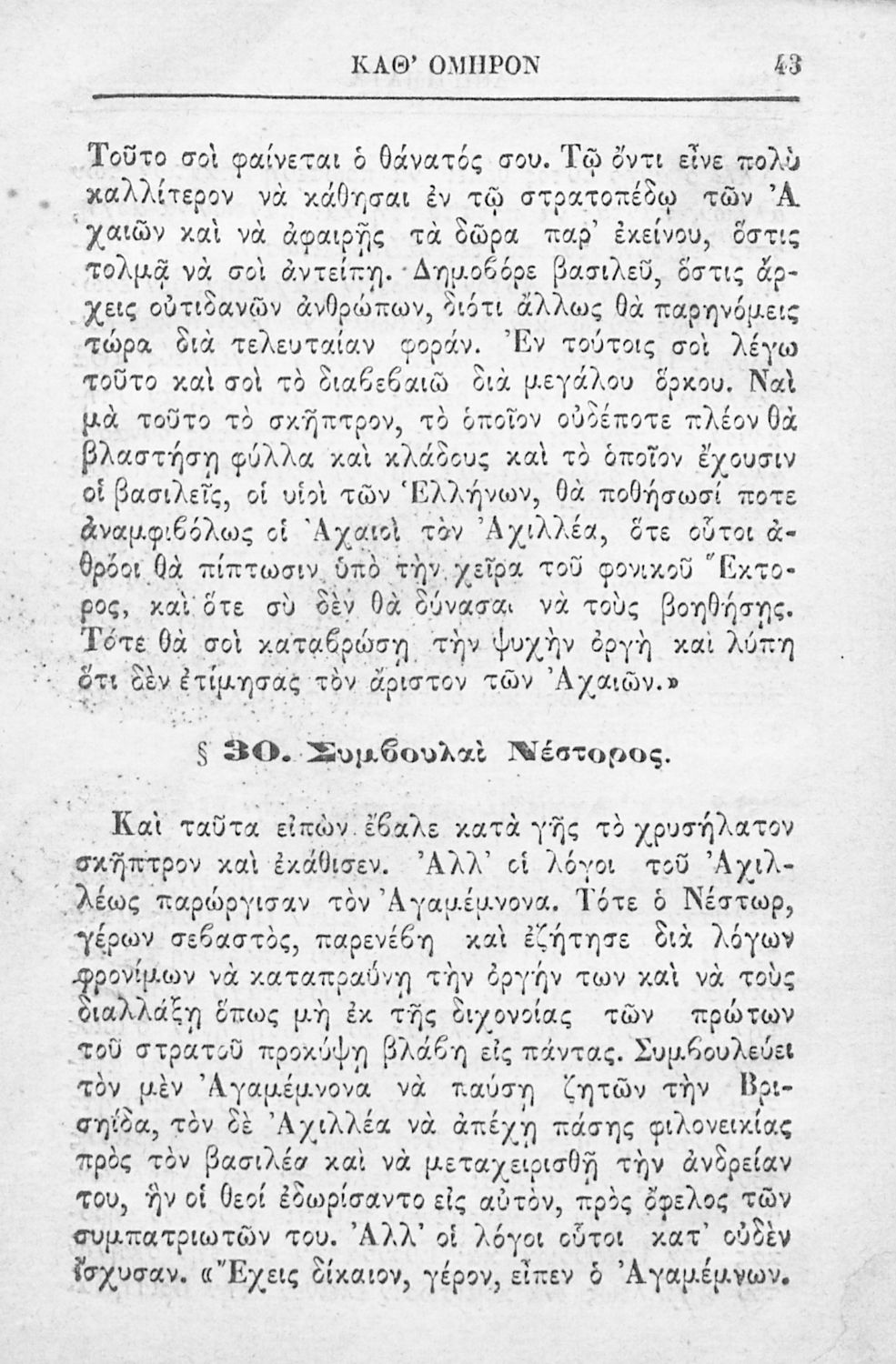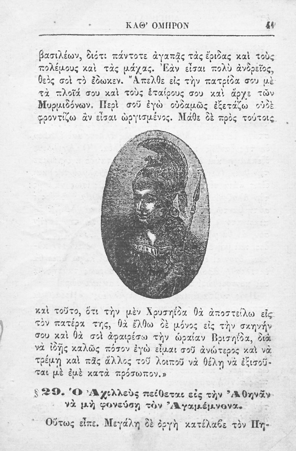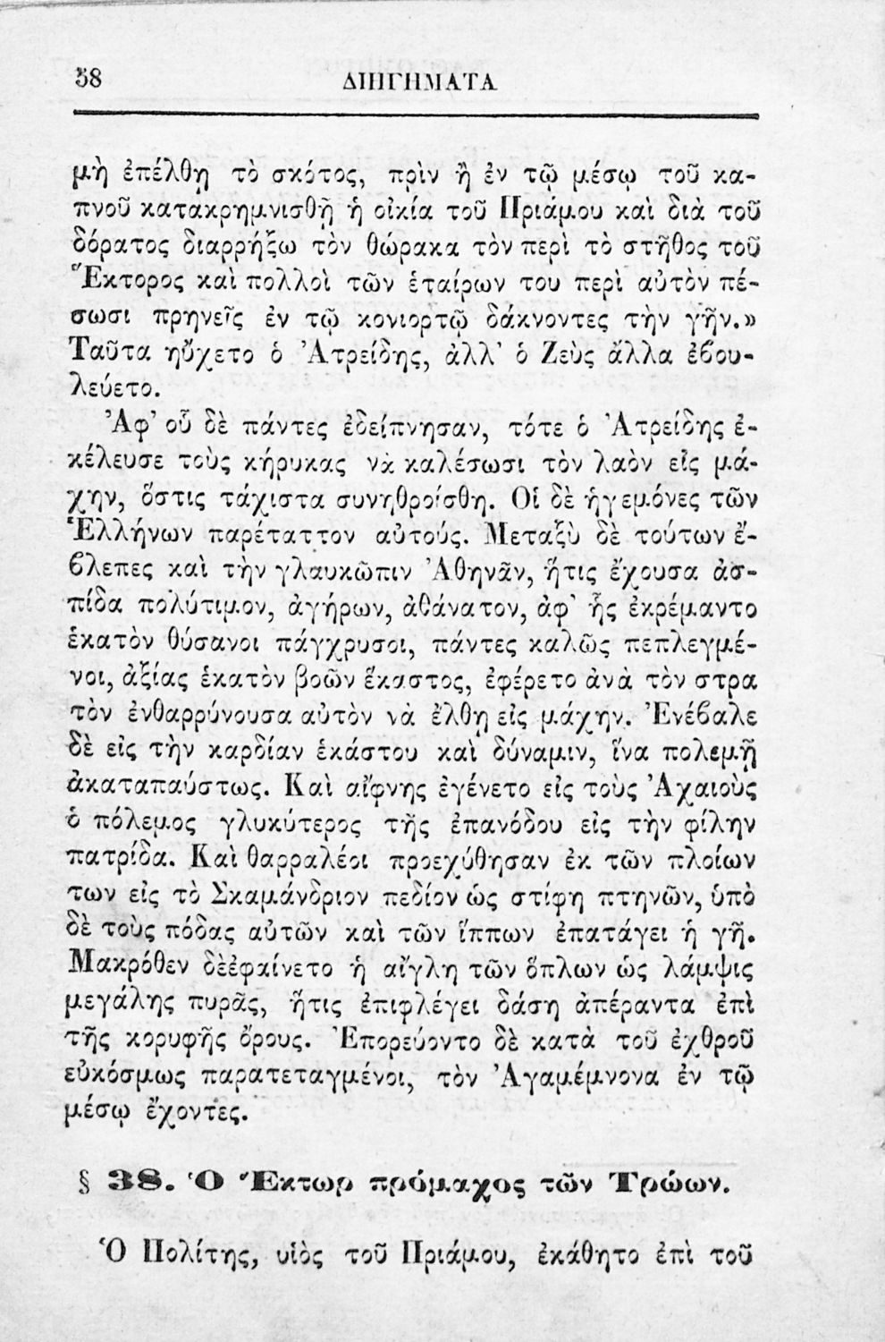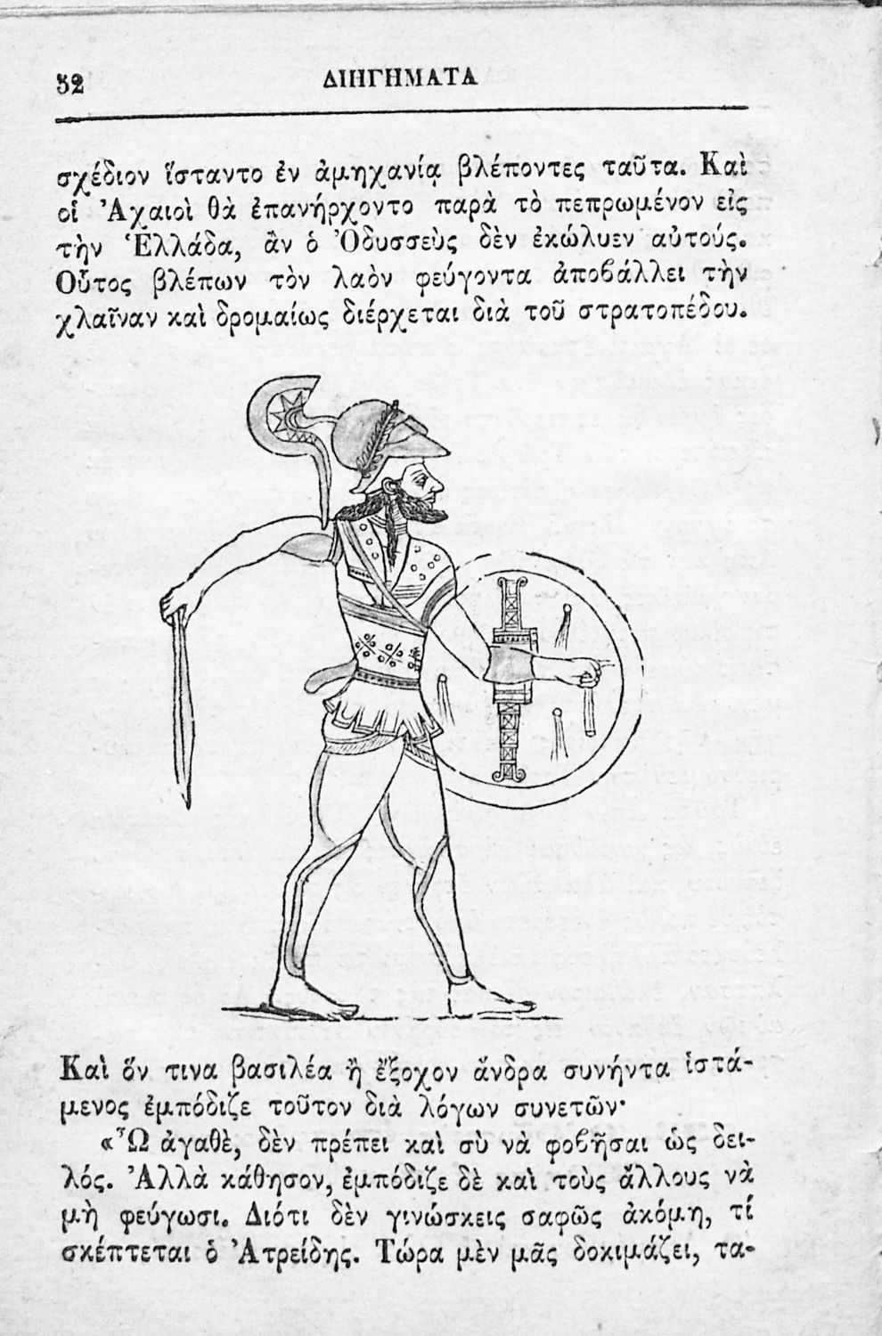 Αναγνωστικό που περιλαμβάνει διηγήματα εμπνευσμένα από τον Τρωικό Πόλεμο και αποσκοπεί να διδάξει στους ελληνόπαιδες "ότι προς ταις αρεταίς της ειρήνης υπάρχουσι και αρεταίς του πολέμου, η αρετή της πειθαρχίας και του ξίφους".