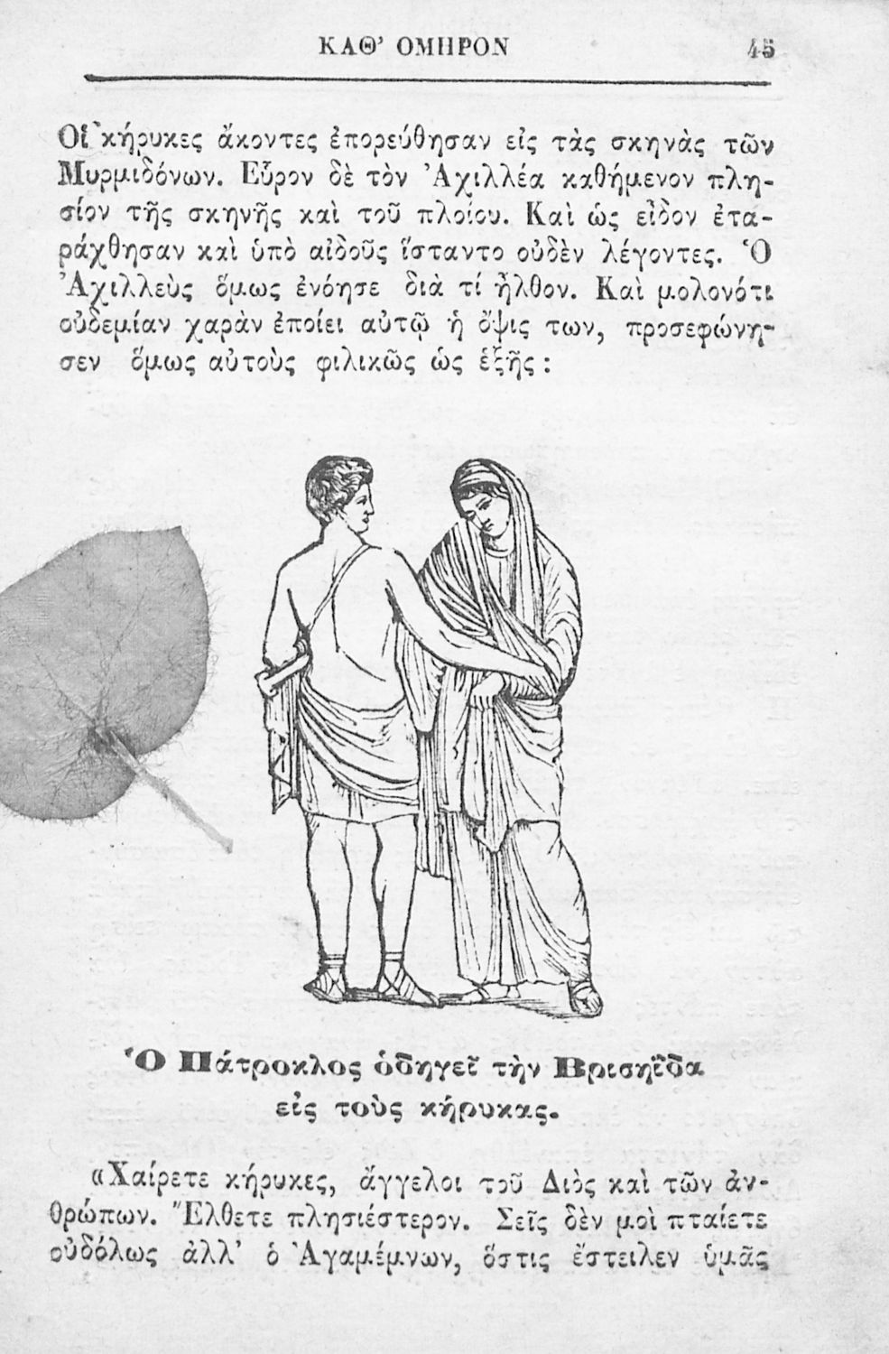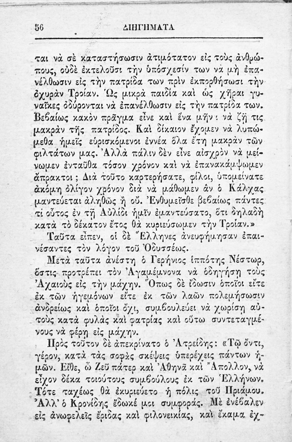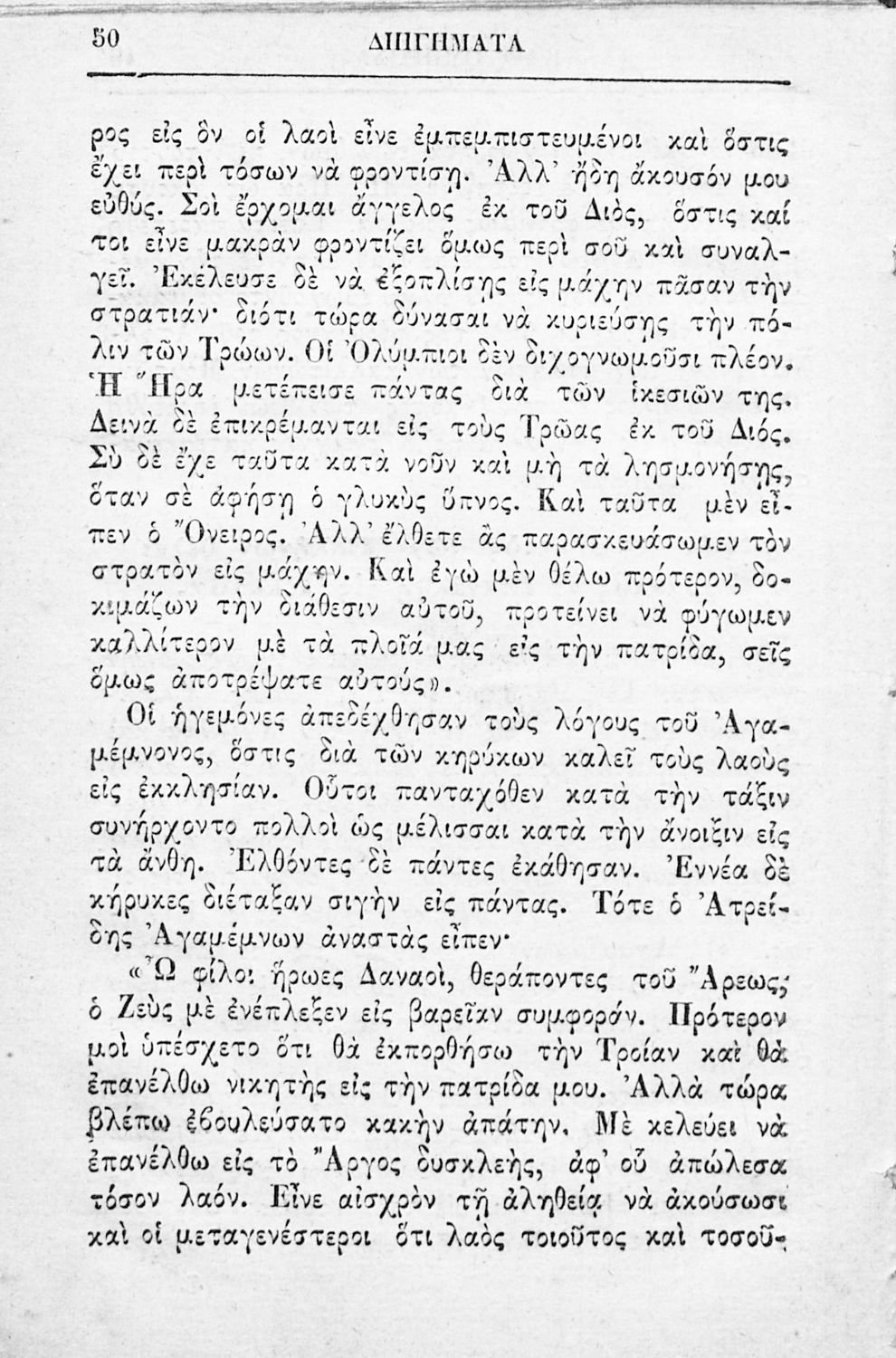 Αναγνωστικό Δημοτικού που περιλαμβάνει διηγήματα εμπνευσμένα από τον Τρωικό Πόλεμο και αποσκοπεί να διδάξει στους ελληνόπαιδες "ότι προς ταις αρεταίς της ειρήνης υπάρχουσι και αρεταίς του πολέμου, η αρετή της ...