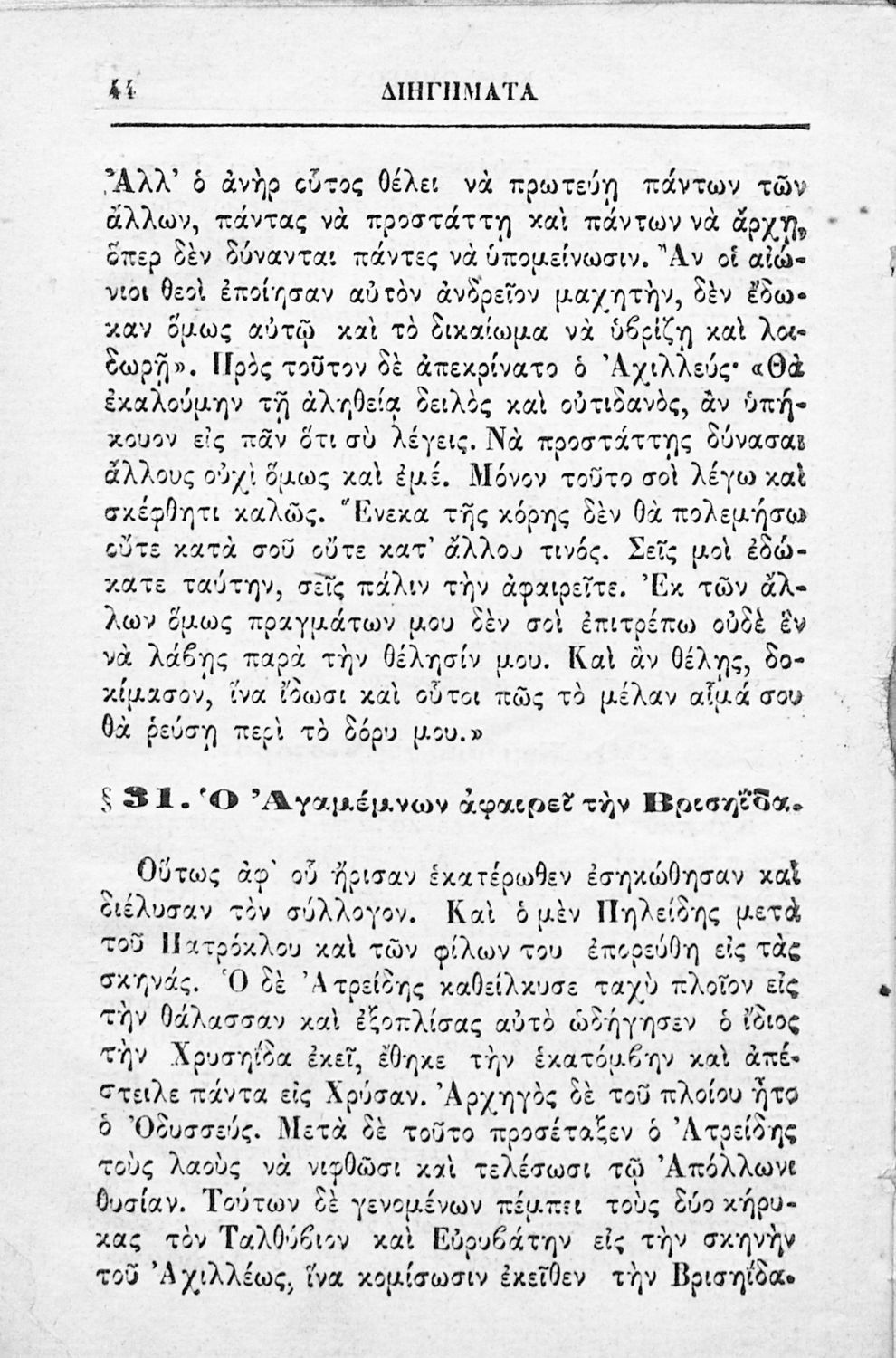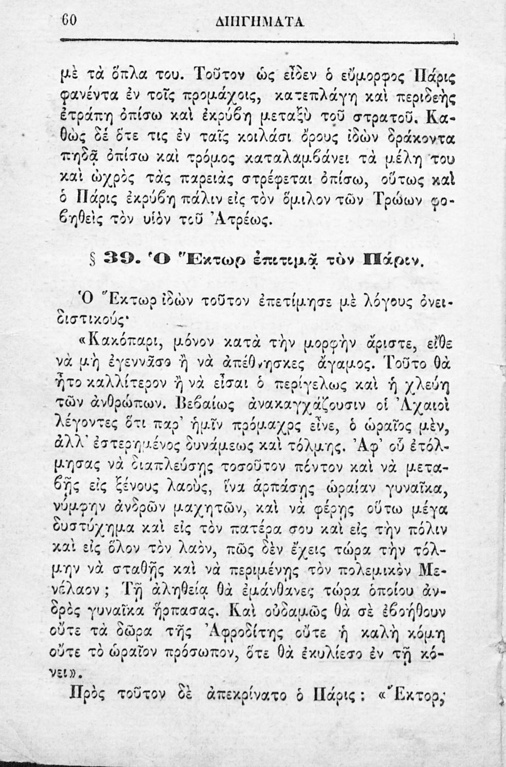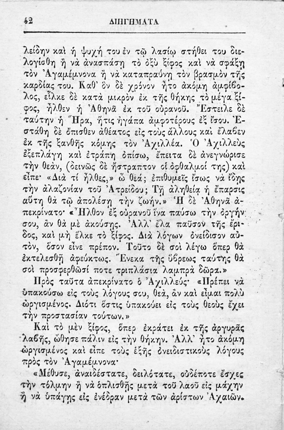 Αναγνωστικό Δημοτικού που περιλαμβάνει διηγήματα εμπνευσμένα από τον Τρωικό Πόλεμο και αποσκοπεί να διδάξει στους ελληνόπαιδες "ότι προς ταις αρεταίς της ειρήνης υπάρχουσι και αρεταίς του πολέμου, η αρετή της ...