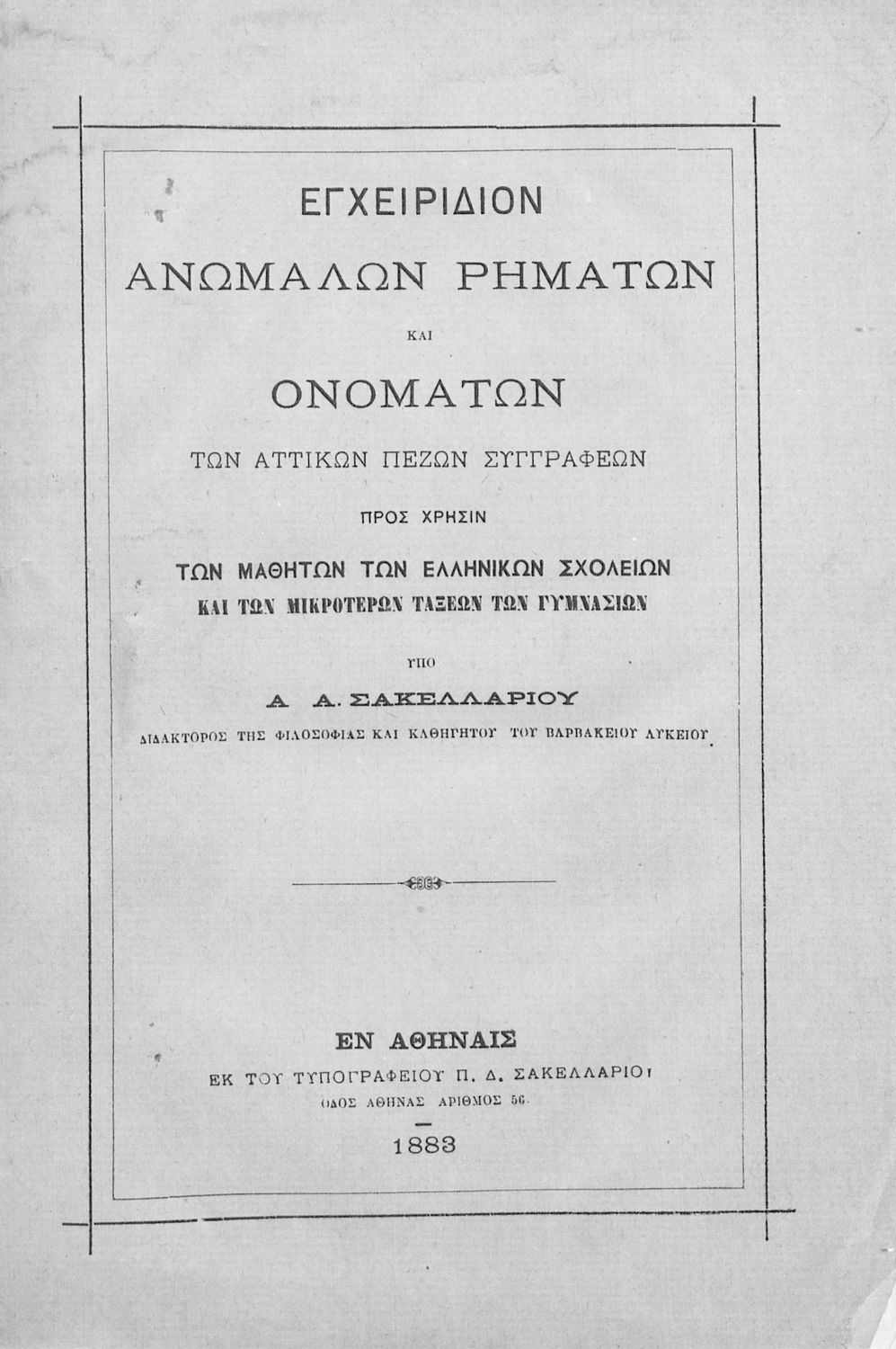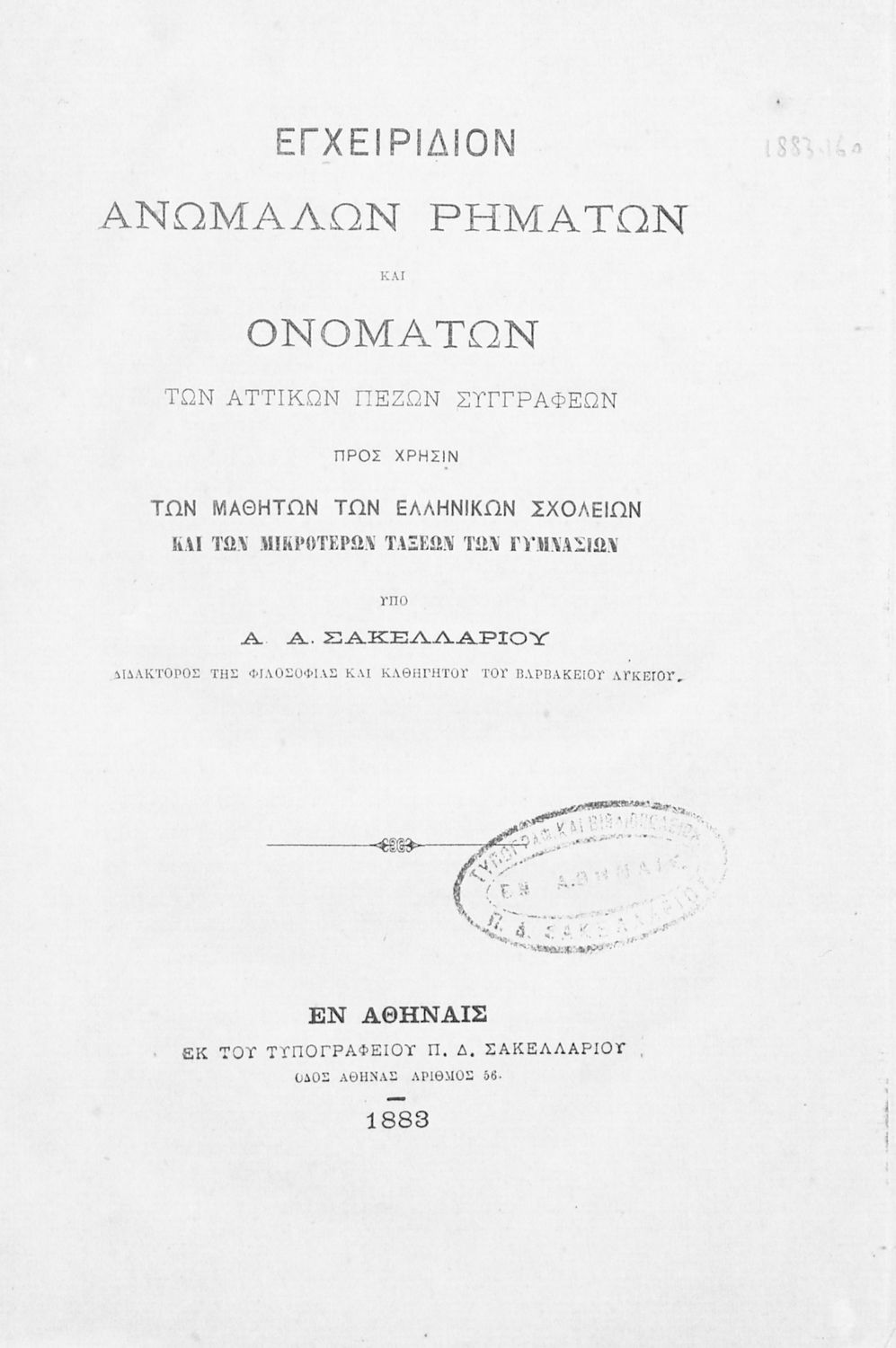 Εγχειρίδιον ανωμάλων ρημάτων και ονομάτων των αττικών πεζών συγγραφέων, προς χρήσιν των μαθητών των Ελληνικών Σχολείων και των μικροτέρων τάξεων των Γυμνασίων