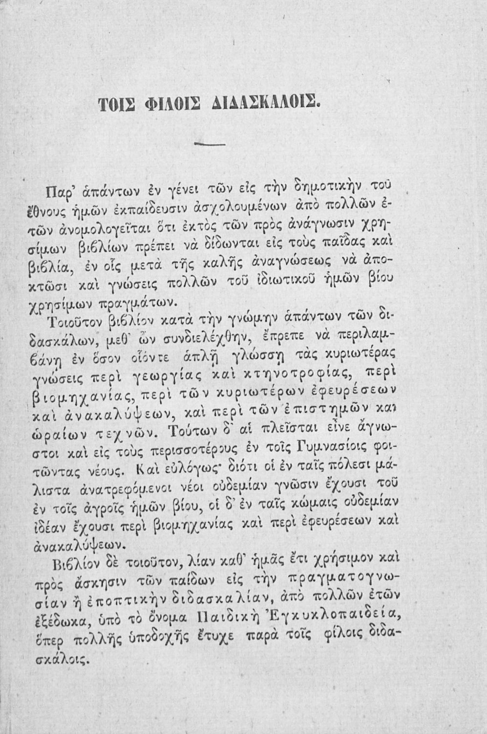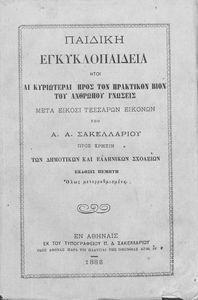 Κωδικός αναγνώρισης: 02-02608 Τίτλος: Παιδική εγκυκλοπαίδεια, ήτοι αι κυριώτεραι προς τον πρακτικόν βίον του ανθρώπου γνώσεις, μετά είκοσι τεσσάρων εικόνων προς χρήσιν των Δημοτικών και Ελληνικών σχολείων Συγγραφέας: Αθανάσιος Α. Σακελλάριος Μέγεθος και υπόστρωμα: Μαθητικό βοήθημα, μαλακό εξώφυλλο, 140 σελίδες. Εικόνες (ασπρόμαυρες), σκίτσα (ασπρόμαυρα). |