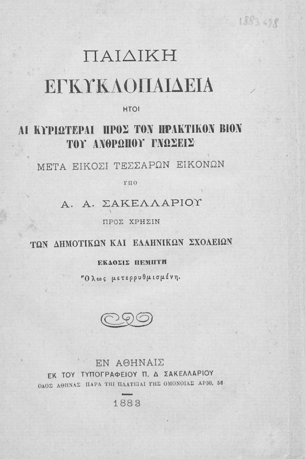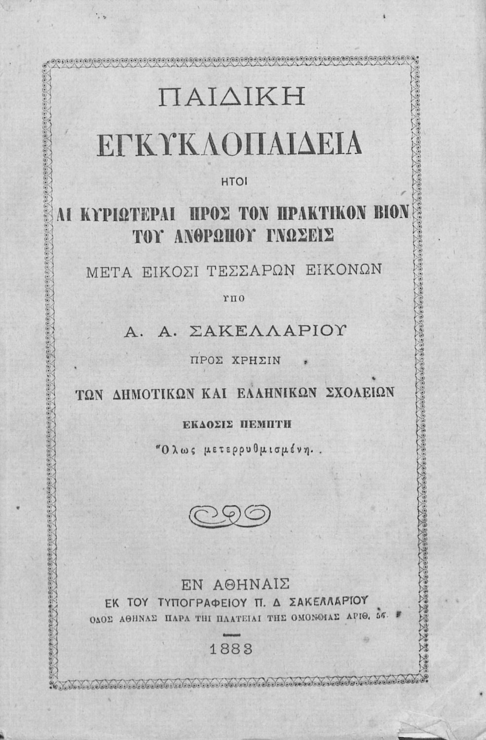 Εκδότης: Π. Δ. Σακελλαρίου Έτος έκδοσης: 1883 Τόπος έκδοσης: Αθήνα Έκδοση: 5η |