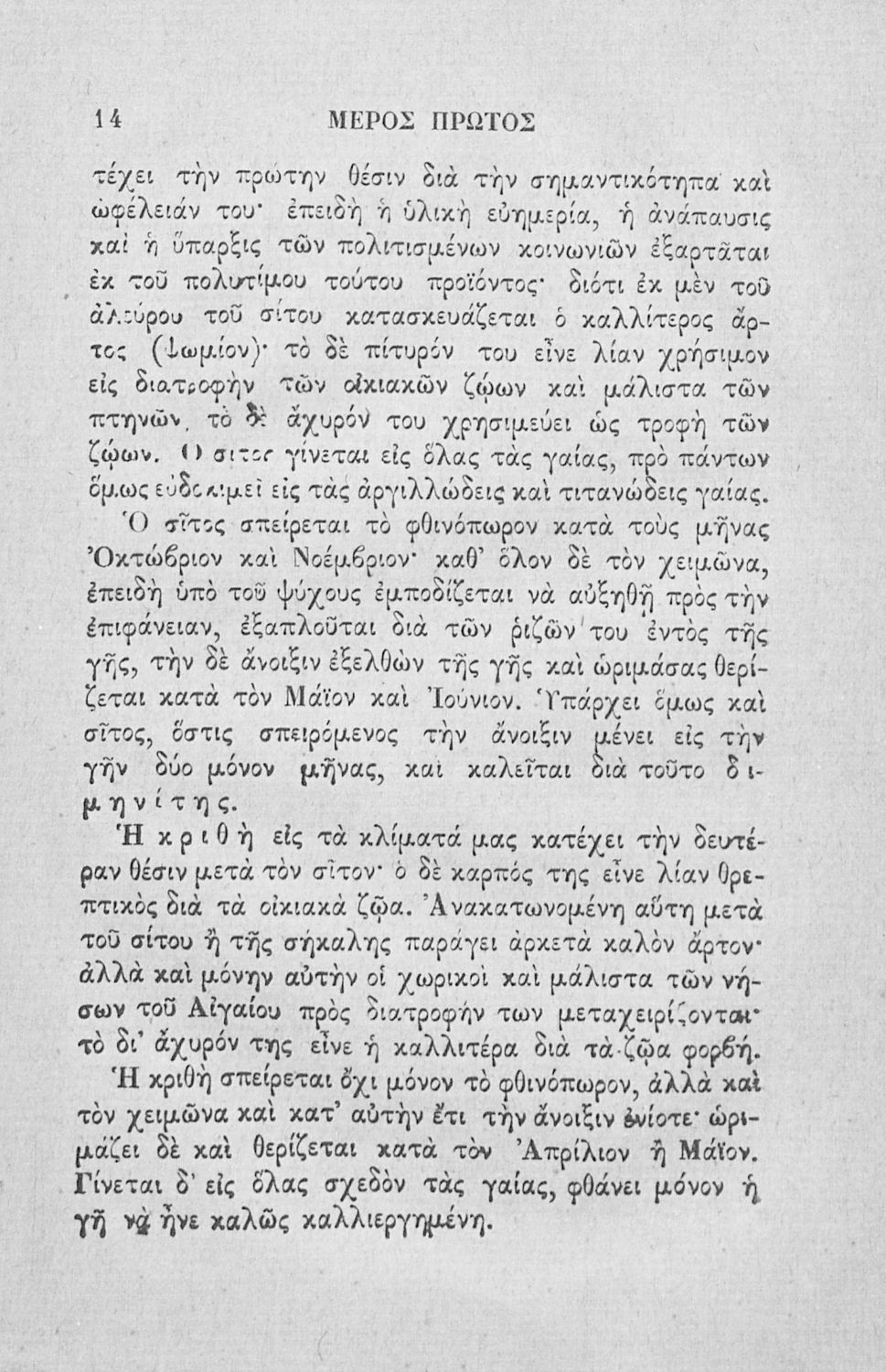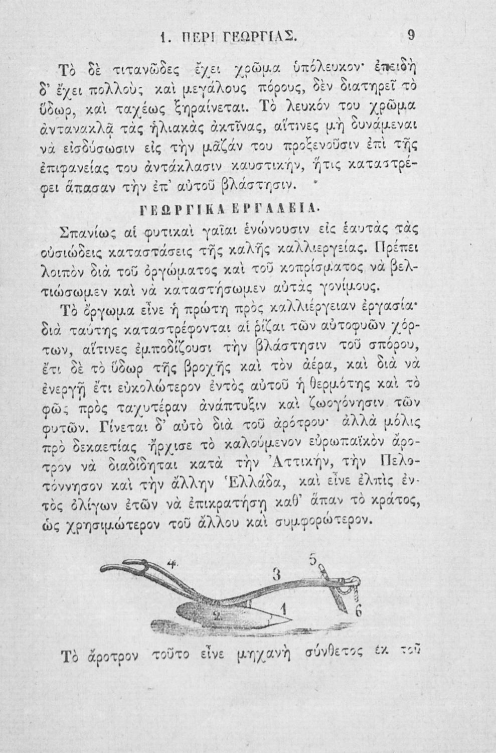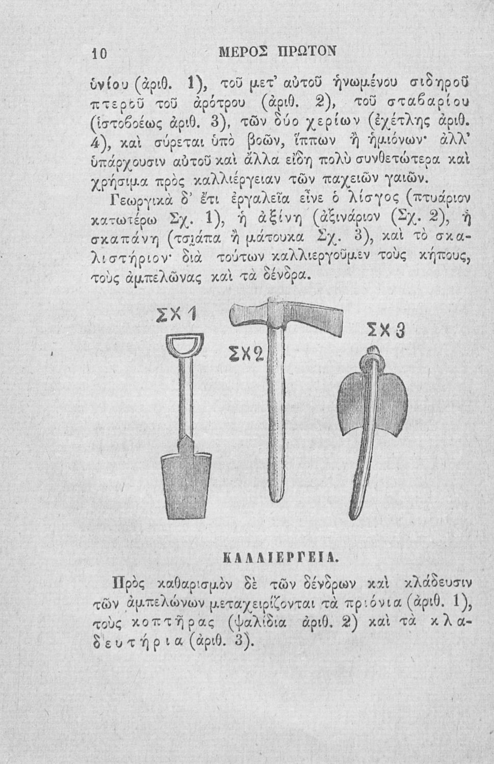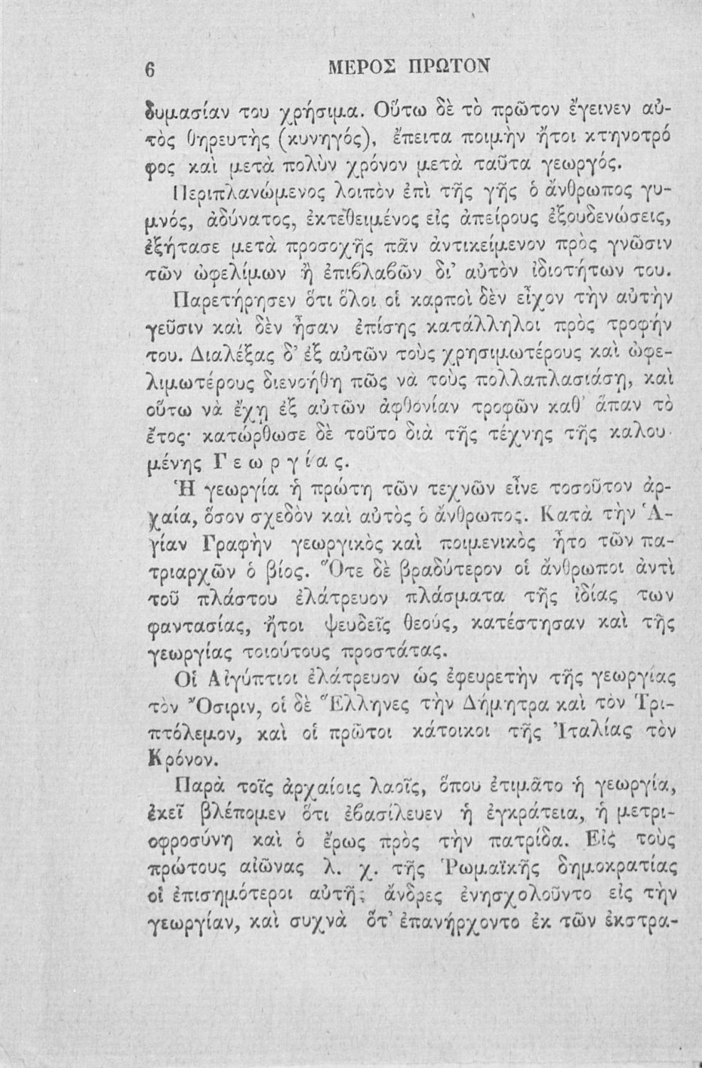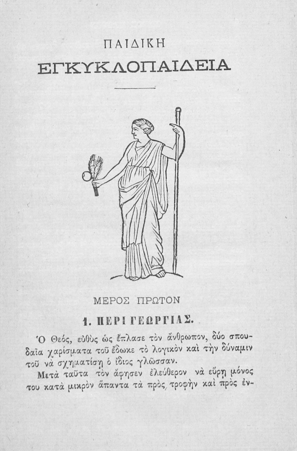 Βαθμίδα εκπαίδευσης: Πρωτοβάθμια, Δευτεροβάθμια Τάξη: Δημοτικό / Ελληνικό Σχολείο Γλώσσα: Καθαρεύουσα Παρουσίαση περιεχομένου: Μαθητικό βοήθημα Δημοτικών και Ελληνικών Σχολείων που στόχο είχε να εισαγάγει παιδιά στην πρωτογενή, δευτερογενή, τριτογενή παραγωγή, το χώρο των εφευρέσεων, των τεχνών και των επιστημών. Το βιβλίο παρουσιάζει τα βασικά γεωργικά εργαλεία και το τρόπο χρήσης τους καθώς και βασικές γνώσεις και στοιχεία κτηνοτροφίας, βιομηχανίας και τέχνης. |