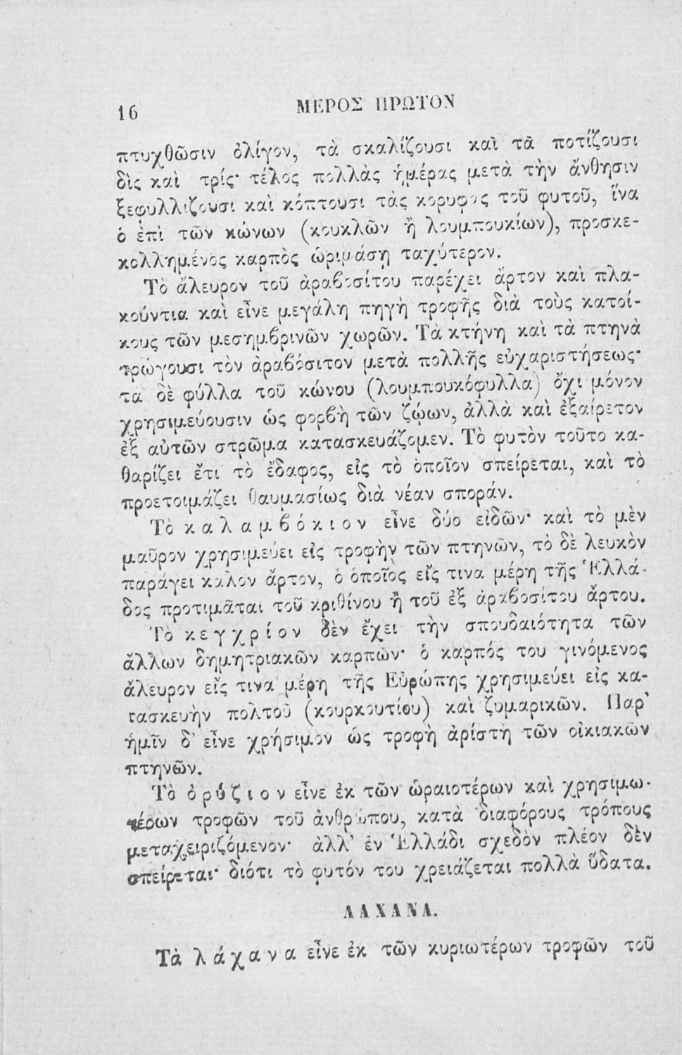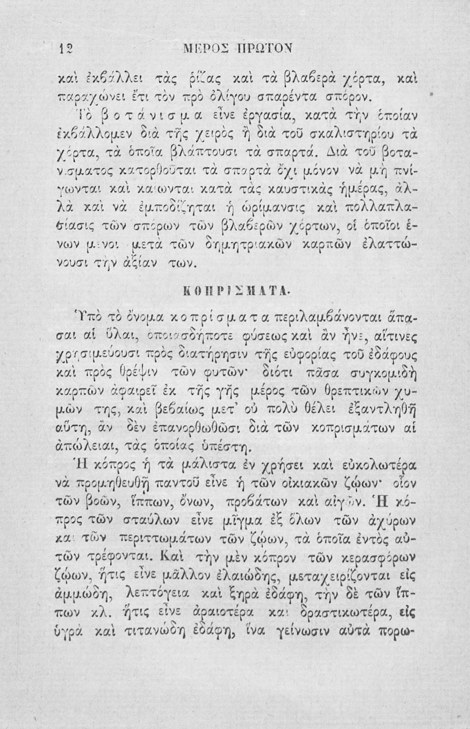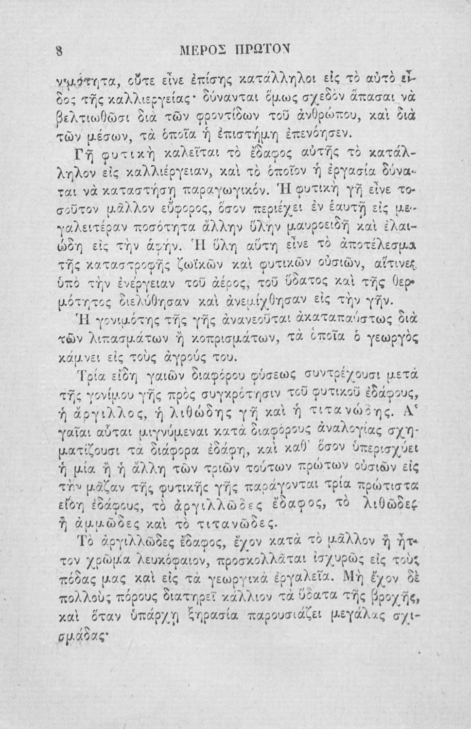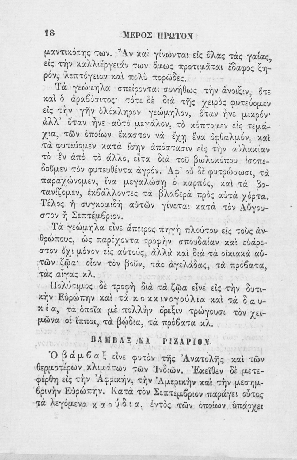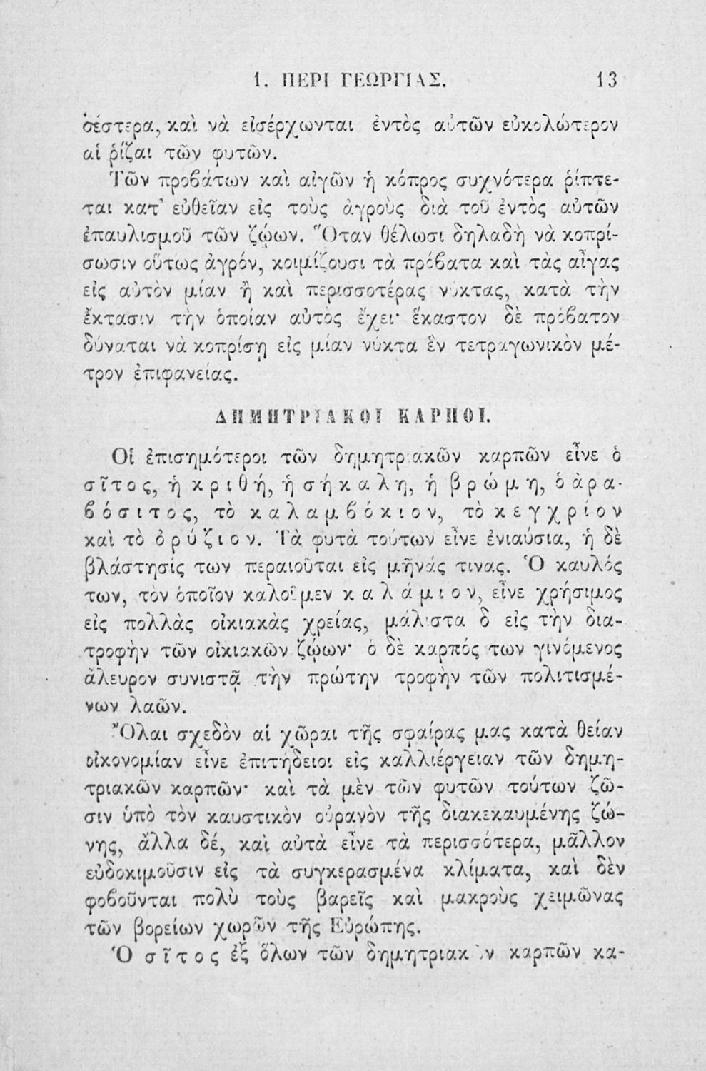 Βαθμίδα εκπαίδευσης: Πρωτοβάθμια, Δευτεροβάθμια Τάξη: Δημοτικό / Ελληνικό Σχολείο Γλώσσα: Καθαρεύουσα Παρουσίαση περιεχομένου: Μαθητικό βοήθημα Δημοτικών και Ελληνικών Σχολείων που στόχο είχε να εισαγάγει παιδιά στην πρωτογενή, δευτερογενή, τριτογενή παραγωγή, το χώρο των εφευρέσεων, των τεχνών και των επιστημών. Το βιβλίο παρουσιάζει τα βασικά γεωργικά εργαλεία και το τρόπο χρήσης τους καθώς και βασικές γνώσεις και στοιχεία κτηνοτροφίας, βιομηχανίας και τέχνης. |
