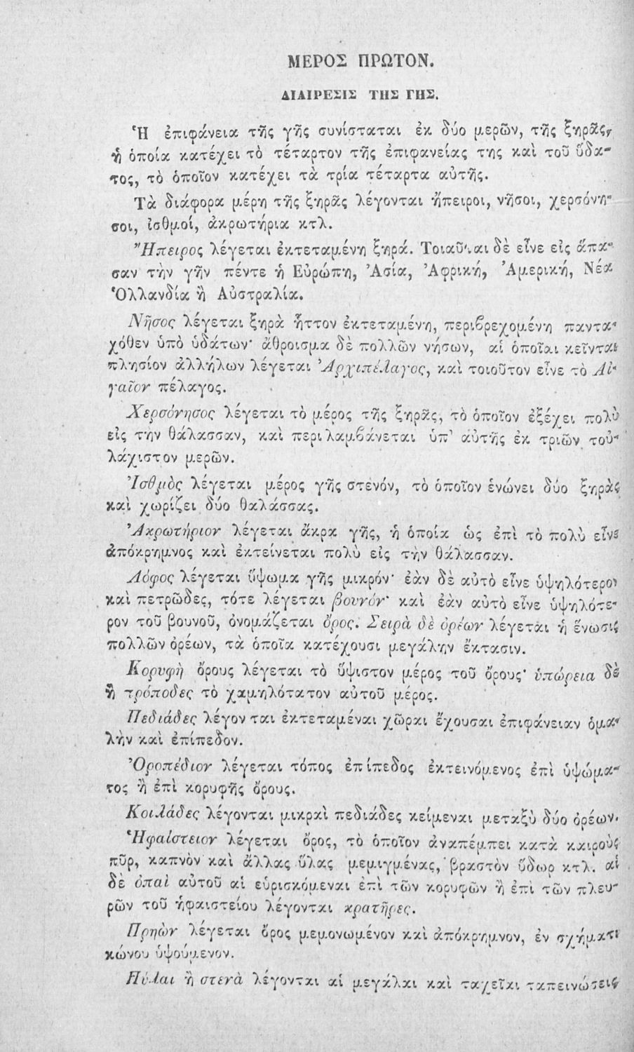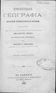 Σχολικό εγχειρίδιο Γεωγραφίας για τα Ελληνικά Σχολεία που περιλαμβάνει εισαγωγή στις βασικές έννοιες και ορισμούς της επιστήμης, και στοιχεία μαθηματικής, φυσικής και πολιτικής γεωγραφίας των πέντε ηπείρων.