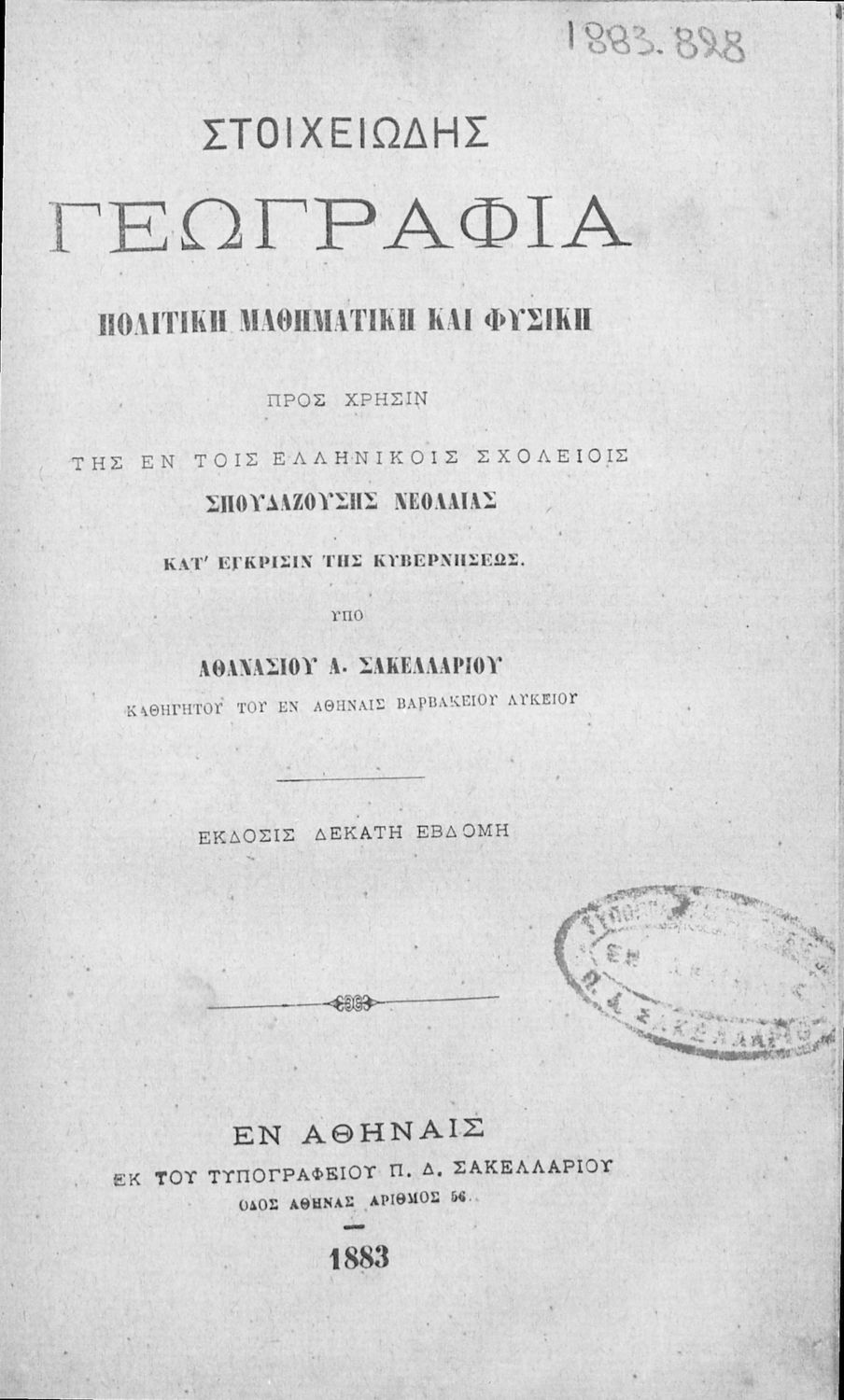 Τίτλος: Στοιχειώδης γεωγραφία πολιτική, μαθηματική και φυσική προς χρήσιν της εν τοις ελληνικοίς σχολείοις σπουδαζούσης νεολαίας