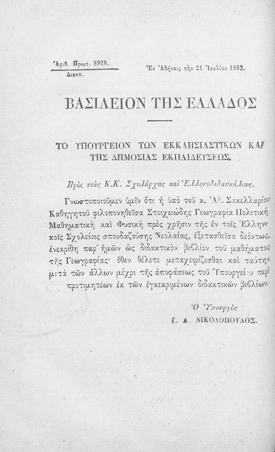 Υπουργική απόφαση / Σύμβαση: 8928/ 21-7-1863