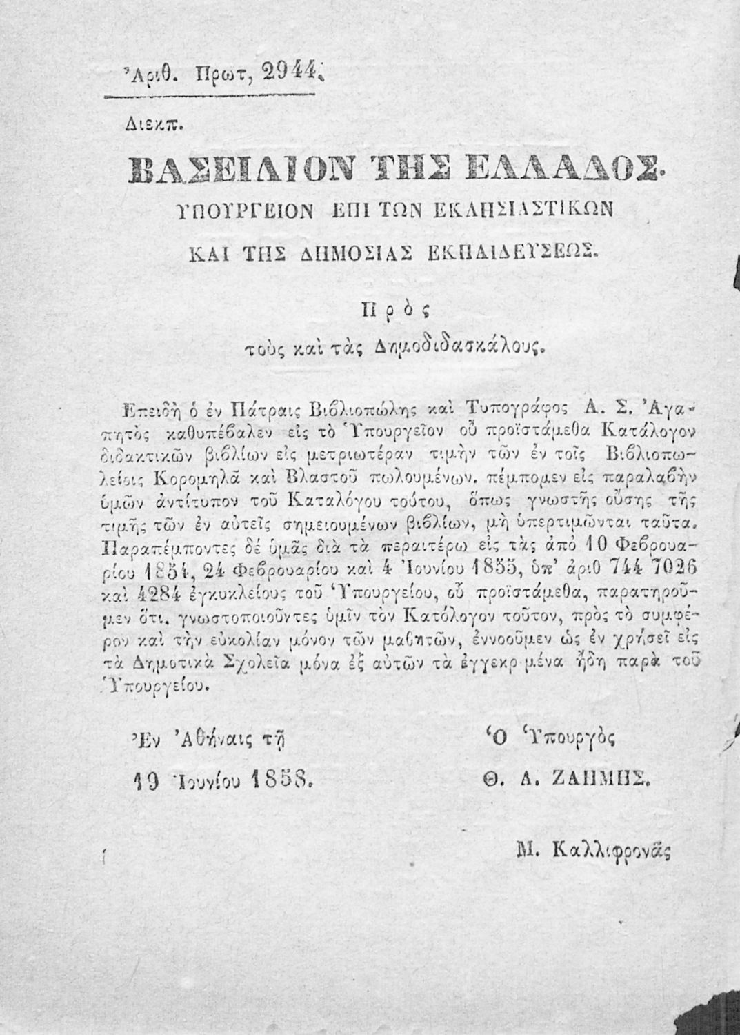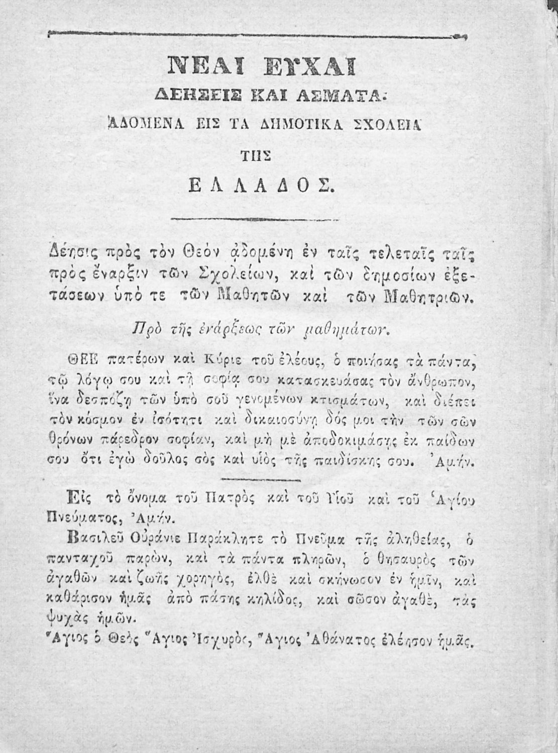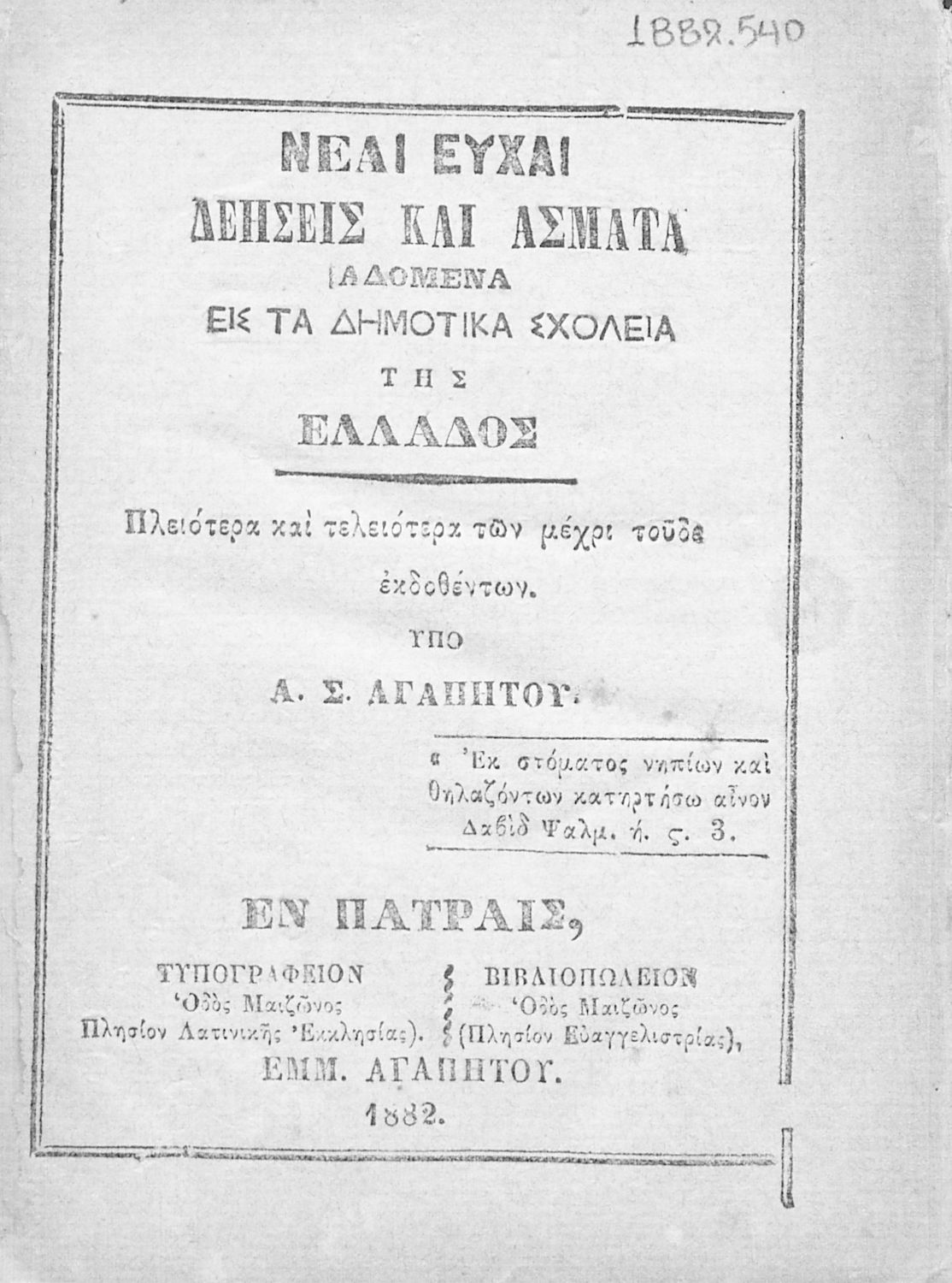 Εκδότης: Εμμ. Αγαπητός Έτος έκδοσης: 1882 Τόπος έκδοσης: Πάτρα Υπουργική απόφαση / Σύμβαση: 2944/19-6-1858 Έτος έγκρισης: 1858 |