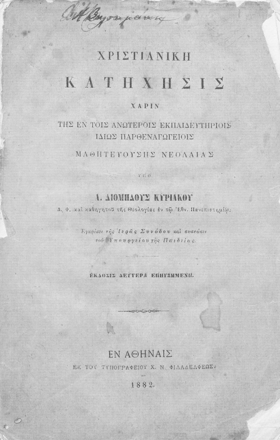 Κωδικός αναγνώρισης: 02-02634 Τίτλος: Χριστιανική Κατήχησις χάριν της εν τοις ανωτέροις εκπαιδευτηρίοις ιδίως Παρθεναγωγείων Συγγραφέας: Α. Διομήδης Κυριακός Μέγεθος και υπόστρωμα: Σχολικό εγχειρίδιο, μαλακό εξώφυλλο, 134 σελίδες. |
