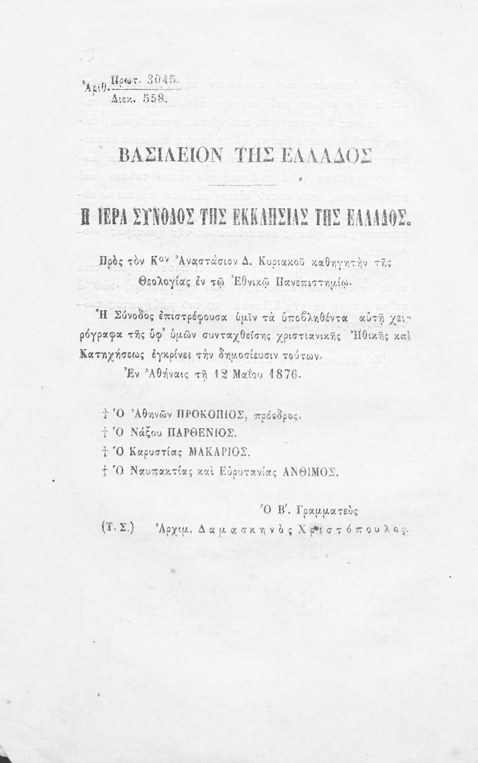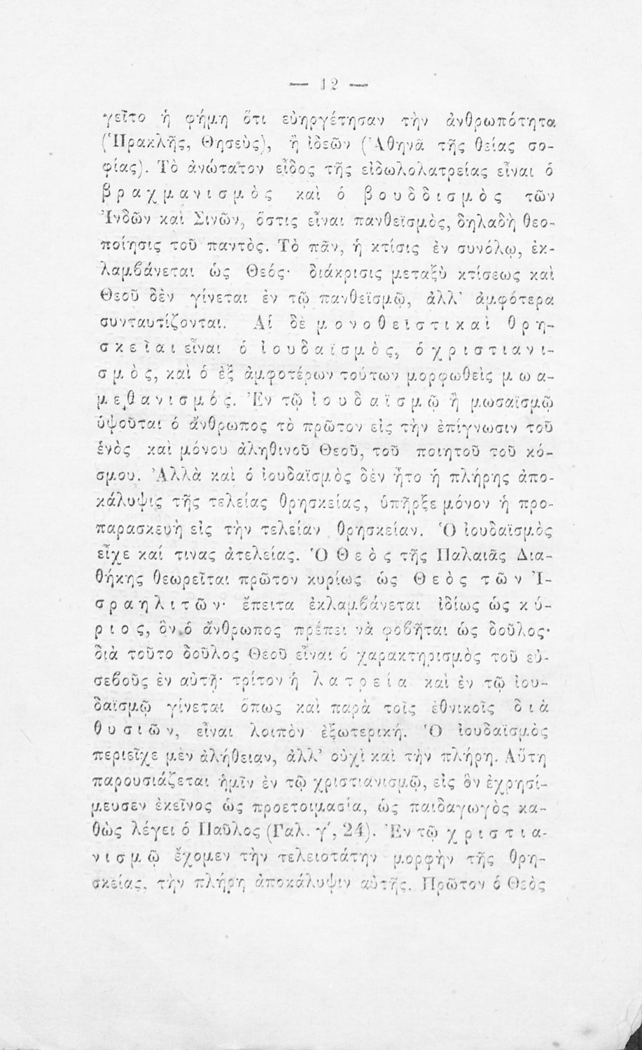 Βαθμίδα εκπαίδευσης: Δευτεροβάθμια Τάξη: Παρθεναγωγείο Μάθημα: Θρησκευτικά Γλώσσα: Καθαρεύουσα Παρουσίαση περιεχομένου: Σχολικό εγχειρίδιο Θρησκευτικών για τα Ανώτερα Παρθεναγωγεία που περιλαμβάνει εισαγωγή στην Παλαιά και Καινή Διαθήκη και παρουσιάζει ζητήματα χριστιανικής κατήχησης και ηθικής με έμφαση στα μυστήρια και τις δέκα εντολές. |