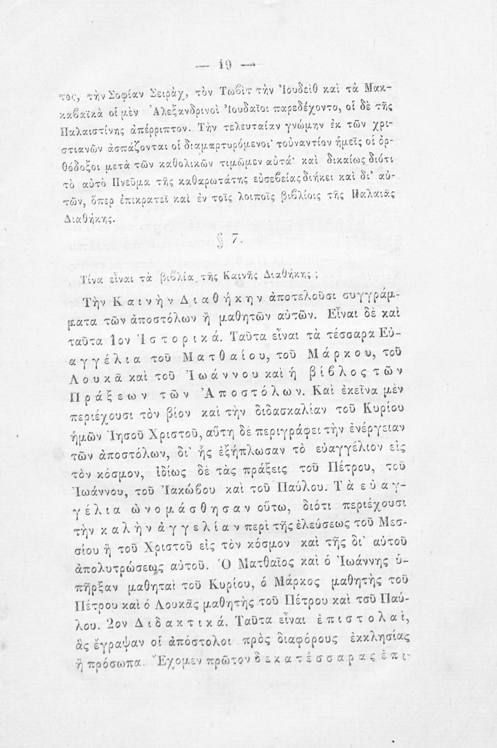 Σχολικό εγχειρίδιο Θρησκευτικών για τα Ανώτερα Παρθεναγωγεία που περιλαμβάνει εισαγωγή στην Παλαιά και Καινή Διαθήκη και παρουσιάζει ζητήματα χριστιανικής κατήχησης και ηθικής με έμφαση στα μυστήρια και τις δέκα εντολές.