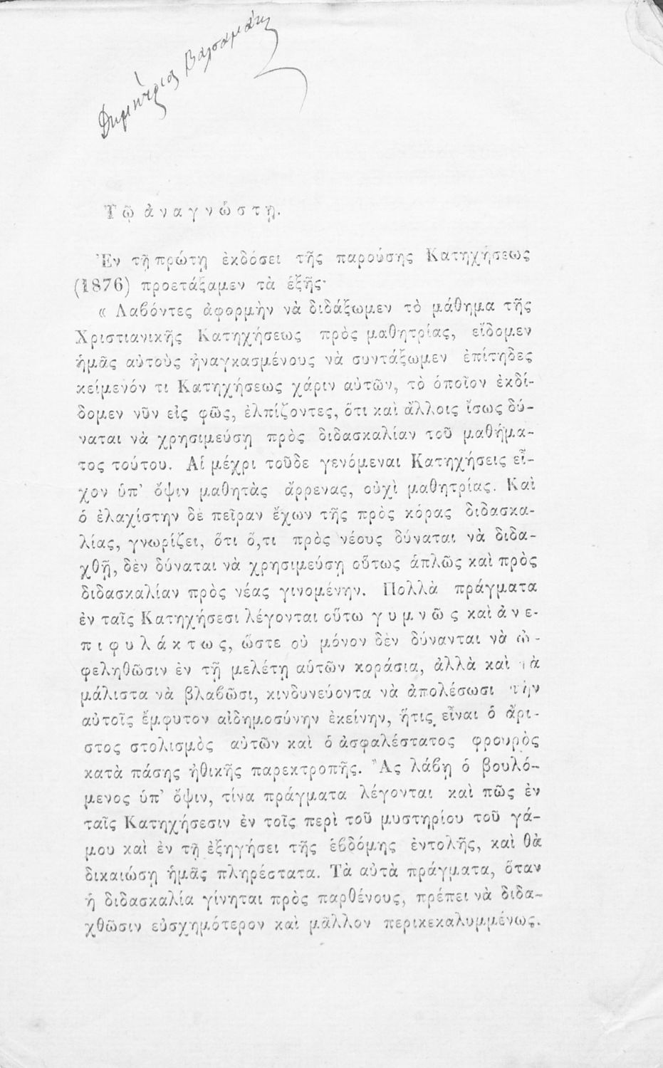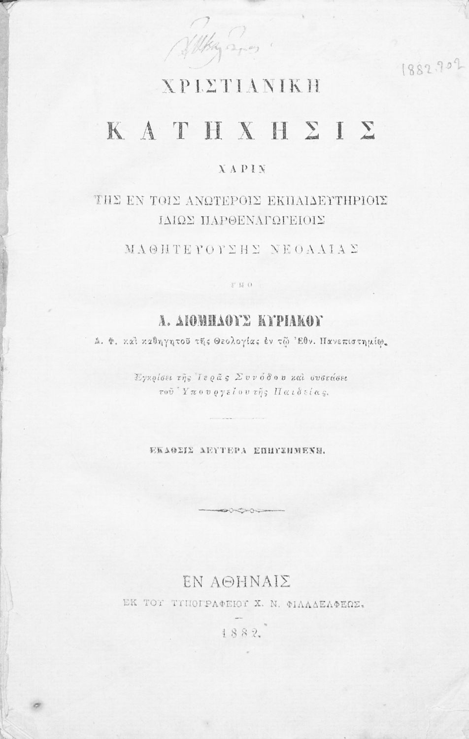 245 0# _aΧριστιανική Κατήχησις χάριν της εν τοις ανωτέροις εκπαιδευτηρίοις ιδίως Παρθεναγωγείων