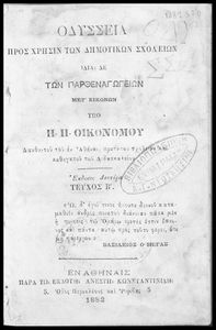 Βαθμίδα εκπαίδευσης: Πρωτοβάθμια Τάξη: Δημοτικό / Παρθεναγωγείο Μάθημα: Αρχαία Ελληνικά Γλώσσα: Καθαρεύουσα Παρουσίαση περιεχομένου: Αναγνωστικό για τα Δημοτικά Σχολεία και Παρθεναγωγεία που εξιστορεί τις περιπέτειες του Οδυσσέα. Το κείμενο συνοδεύεται από γλωσσικές και ερμηνευτικές σημειώσεις. |