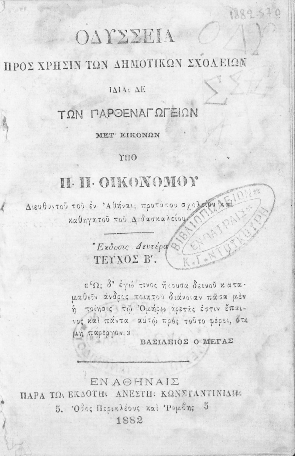 Εκδότης: Ανέστης Κωνσταντινίδης Έτος έκδοσης: 1882 Τόπος έκδοσης: Αθήνα Έκδοση: 2η |
