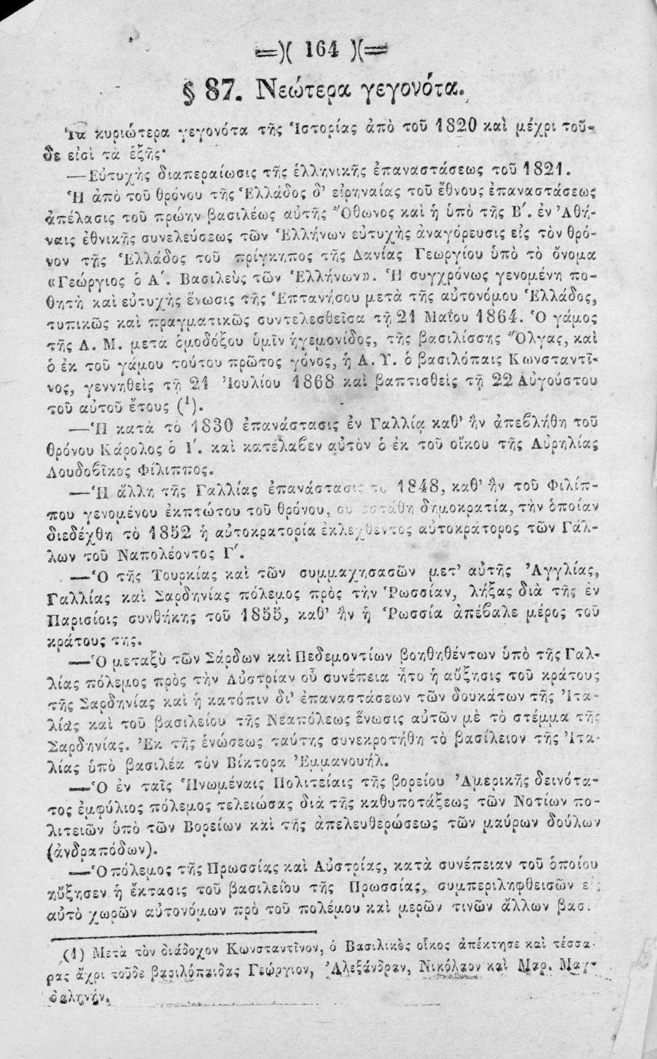 Κωδικός αναγνώρισης: 02-02644 Τίτλος: Σύνοψις γενικής ιστορίας εκτενεστέραν την ελληνικήν περιέχουσα συναρμολογηθείσα προς χρήσιν των μαθητών των Ελληνικών Σχολείων Συγγραφέας: Δ. Πανταζής Μέγεθος και υπόστρωμα: Σχολικό εγχειρίδιο, σκληρό εξώφυλλο, 168 σελίδες. Σκίτσα (ασπρόμαυρα), χάρτες (ασπρόμαυροι). |