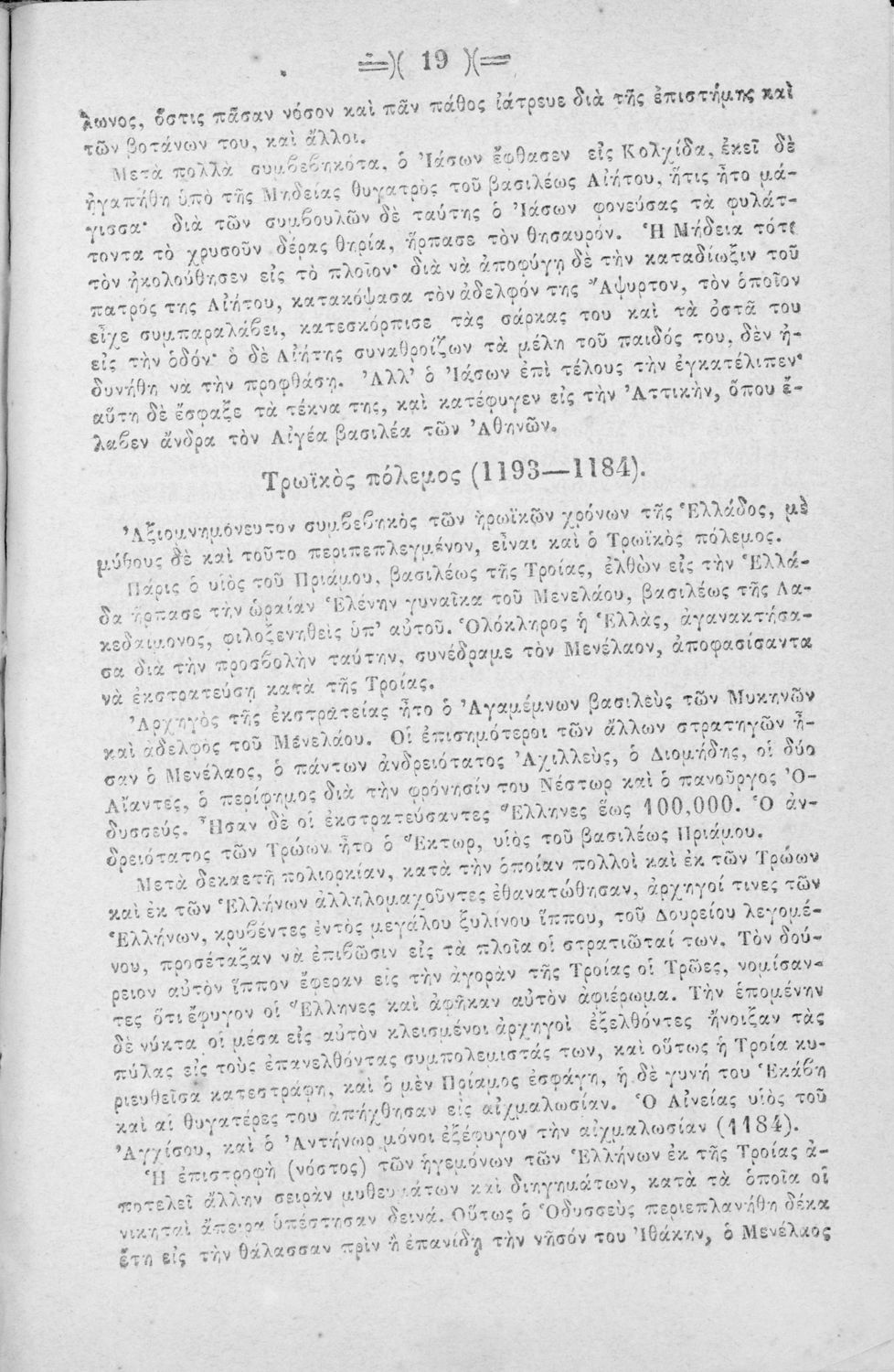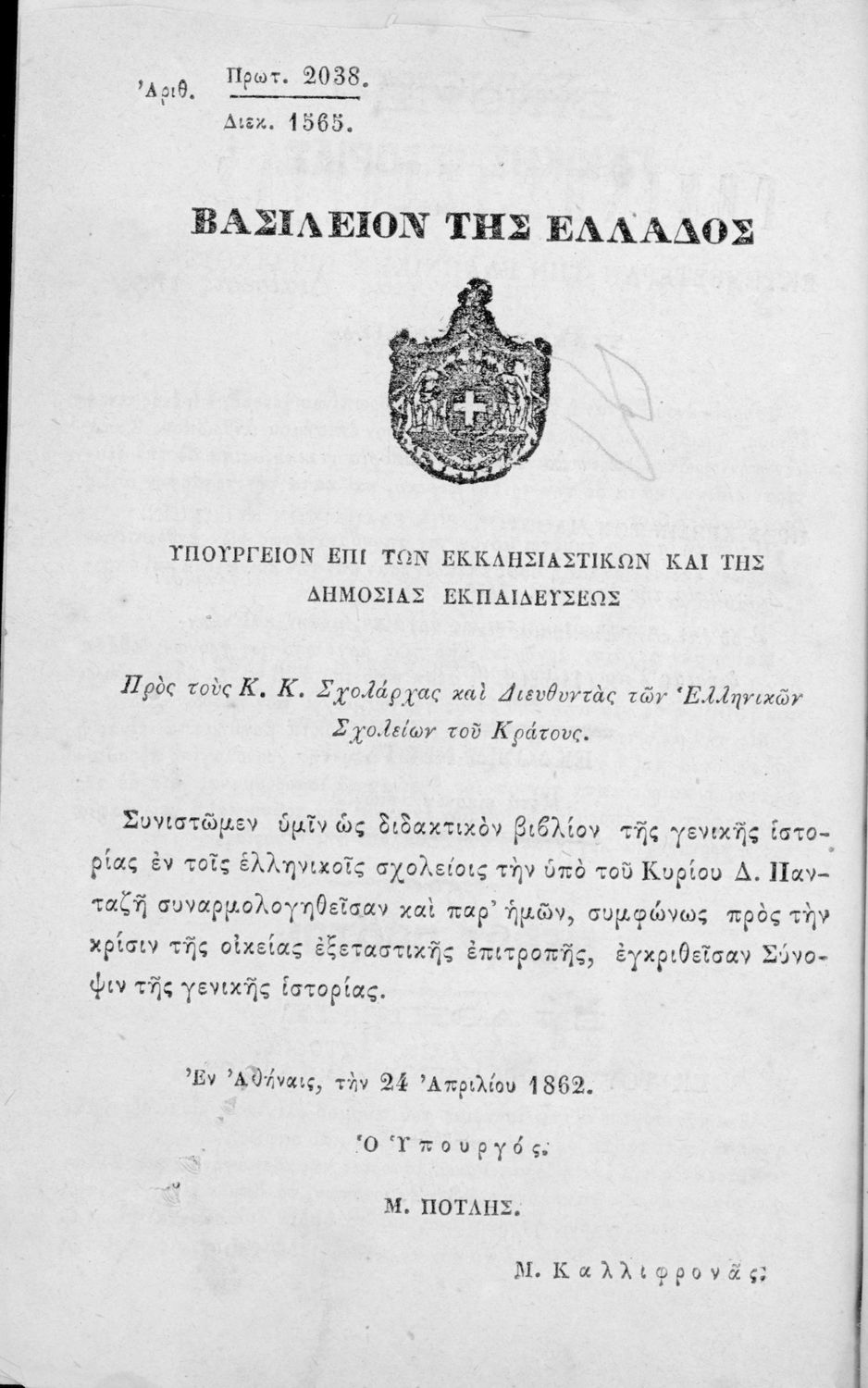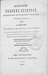 Κωδικός αναγνώρισης: 02-02644 Τίτλος: Σύνοψις γενικής ιστορίας εκτενεστέραν την ελληνικήν περιέχουσα συναρμολογηθείσα προς χρήσιν των μαθητών των Ελληνικών Σχολείων Συγγραφέας: Δ. Πανταζής Μέγεθος και υπόστρωμα: Σχολικό εγχειρίδιο, σκληρό εξώφυλλο, 168 σελίδες. Σκίτσα (ασπρόμαυρα), χάρτες (ασπρόμαυροι). |