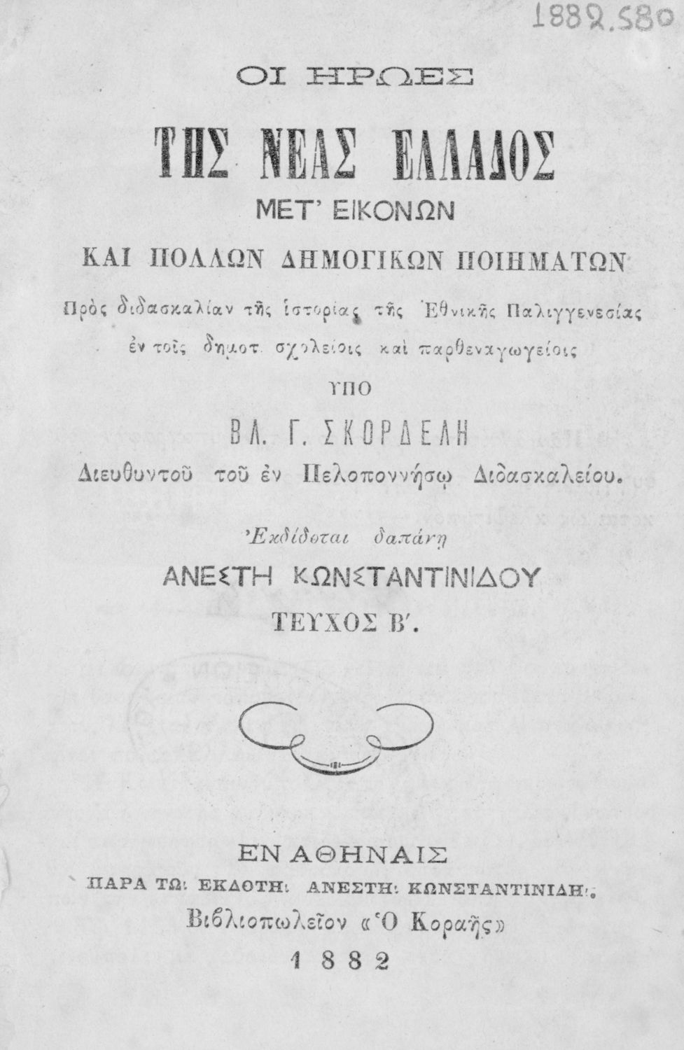 Κωδικός αναγνώρισης: 02-02651 Τίτλος: Οι ήρωες της Νέας Ελλάδος. Προς διδασκαλία της Εθνικής Παλιγγενεσίας εν τοις Δημ. Σχολείοις και Παρθεναγωγείοις Συγγραφέας: Βλ. Γ. Σκορδέλης Μέγεθος και υπόστρωμα: Μαθητικό βοήθημα, μαλακό εξώφυλλο, 97 σελίδες. Σκίτσα και εικόνες (ασπρόμαυρα). |