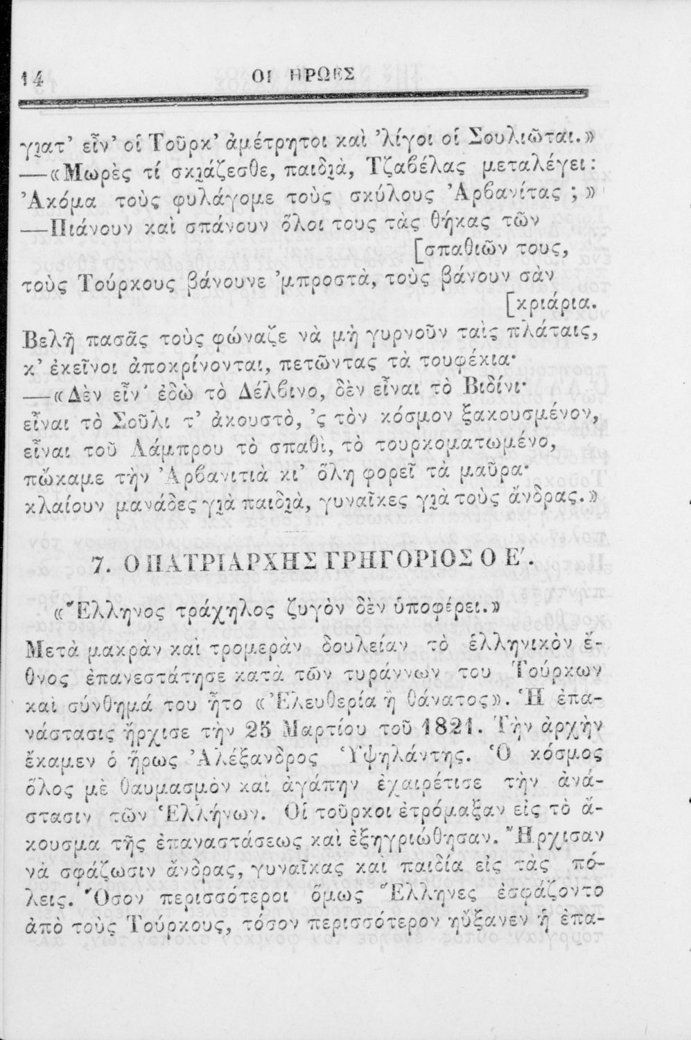Μαθητικό βοήθημα Ιστορίας για τα Δημοτικά και Παρθεναγωγεία που αναφέρεται στη ζωή, τη δράση και τον ηρωικό αγώνα των Ελλήνων της Επανάστασης του 1821. Περιέχει εικόνες των ηρώων και τραγούδια.
