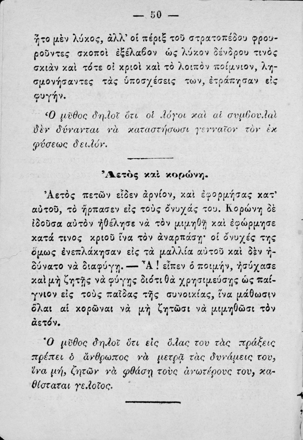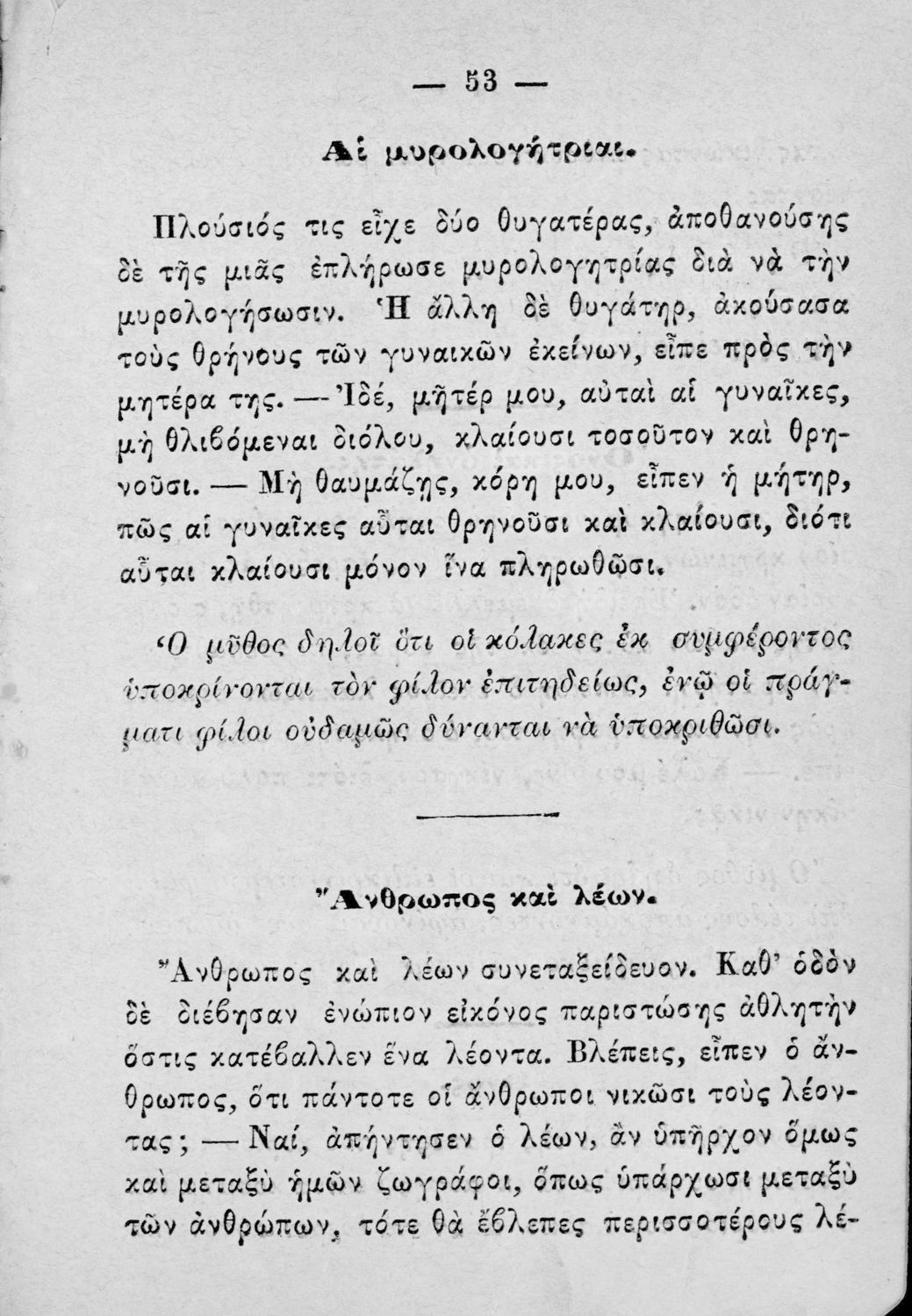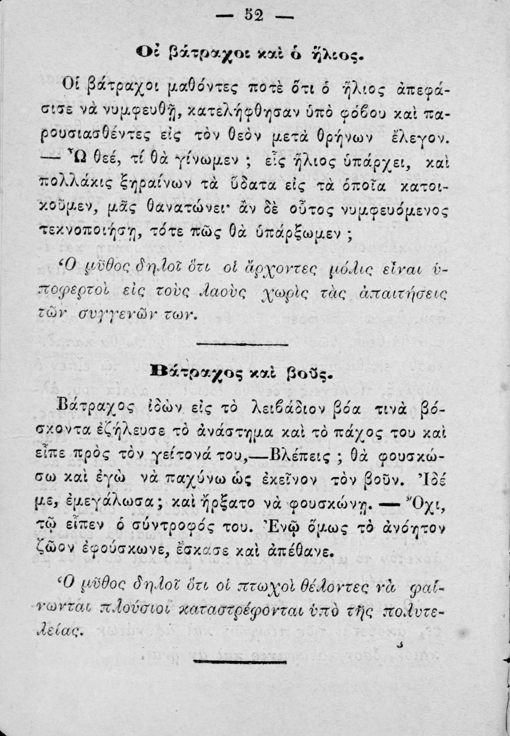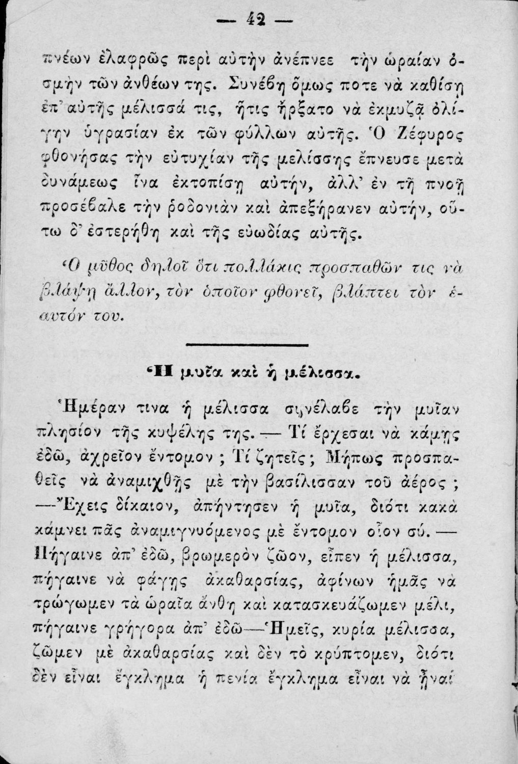 Βαθμίδα εκπαίδευσης: Πρωτοβάθμια Γλώσσα: Απλή καθαρεύουσα Παρουσίαση περιεχομένου: Μαθητικό βοήθημα Δημοτικού που περιλαμβάνει μύθους με ηθικά διδάγματα. |