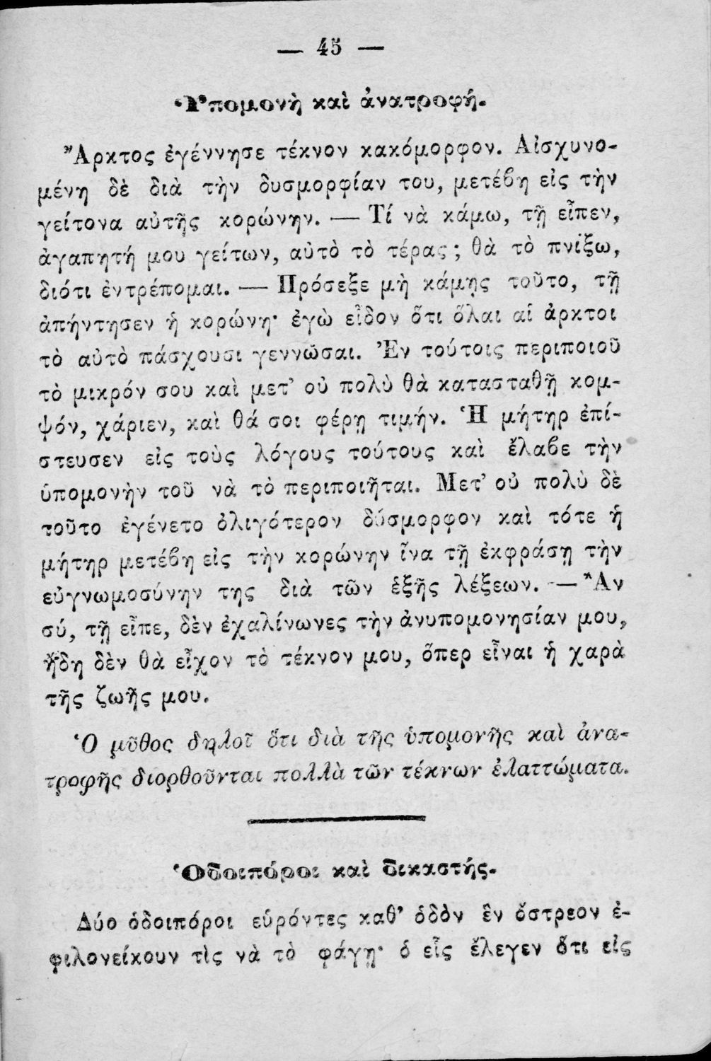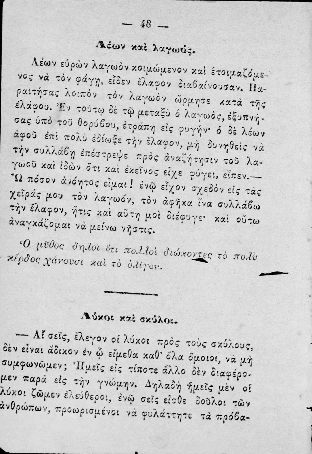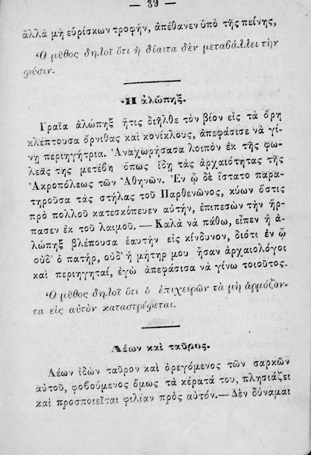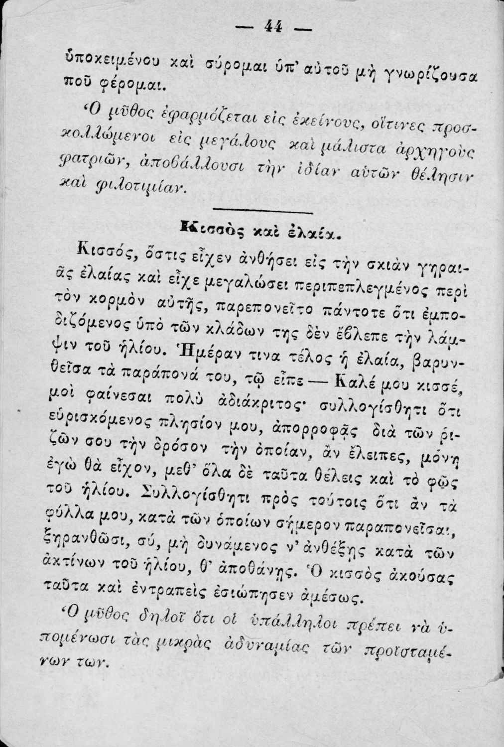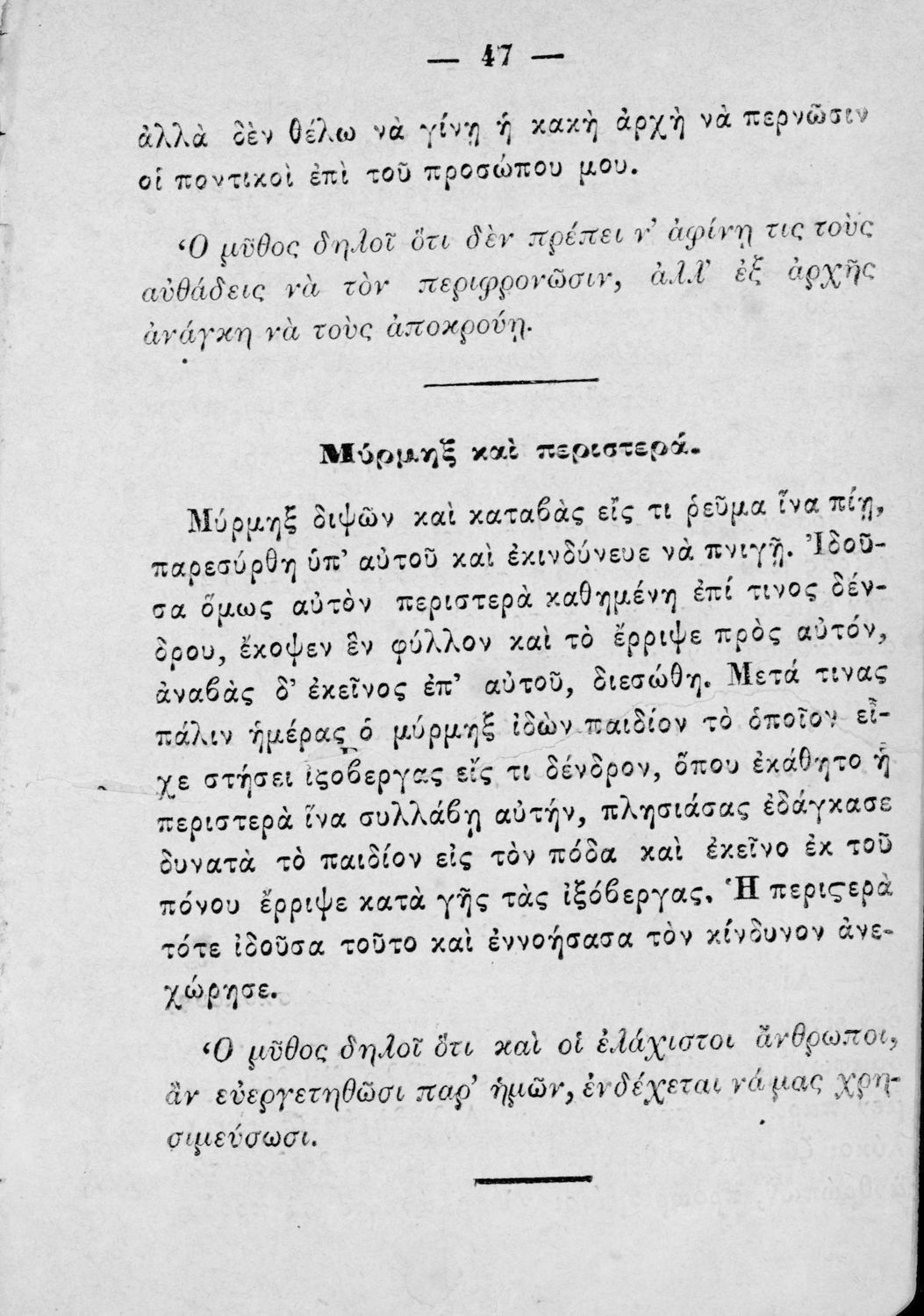 Βαθμίδα εκπαίδευσης: Πρωτοβάθμια Γλώσσα: Απλή καθαρεύουσα Παρουσίαση περιεχομένου: Μαθητικό βοήθημα Δημοτικού που περιλαμβάνει μύθους με ηθικά διδάγματα. |