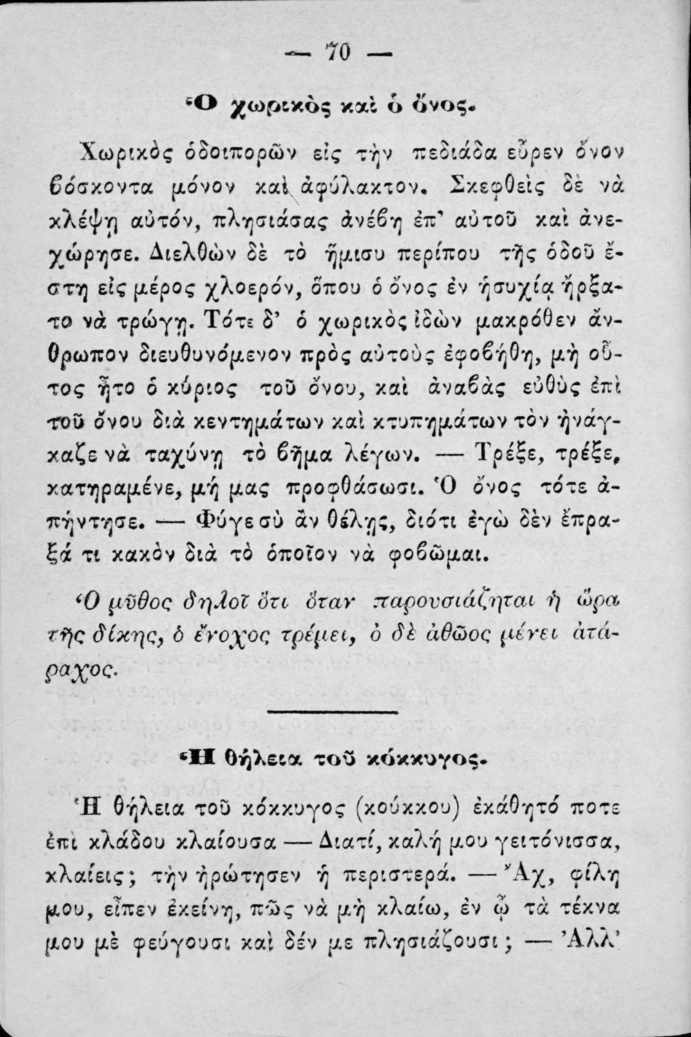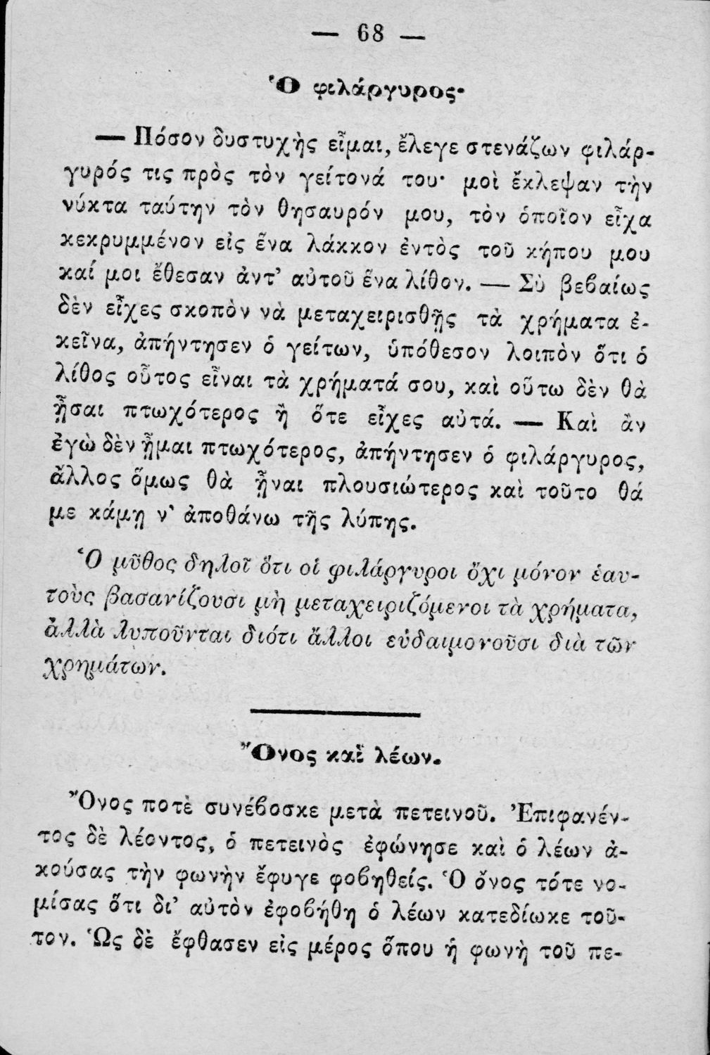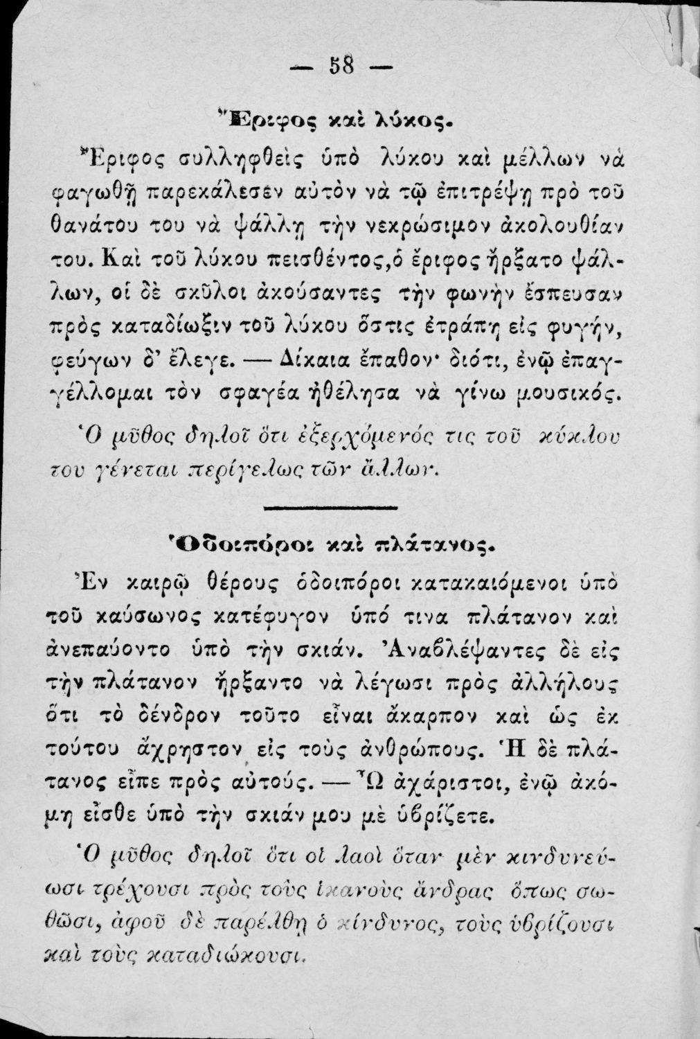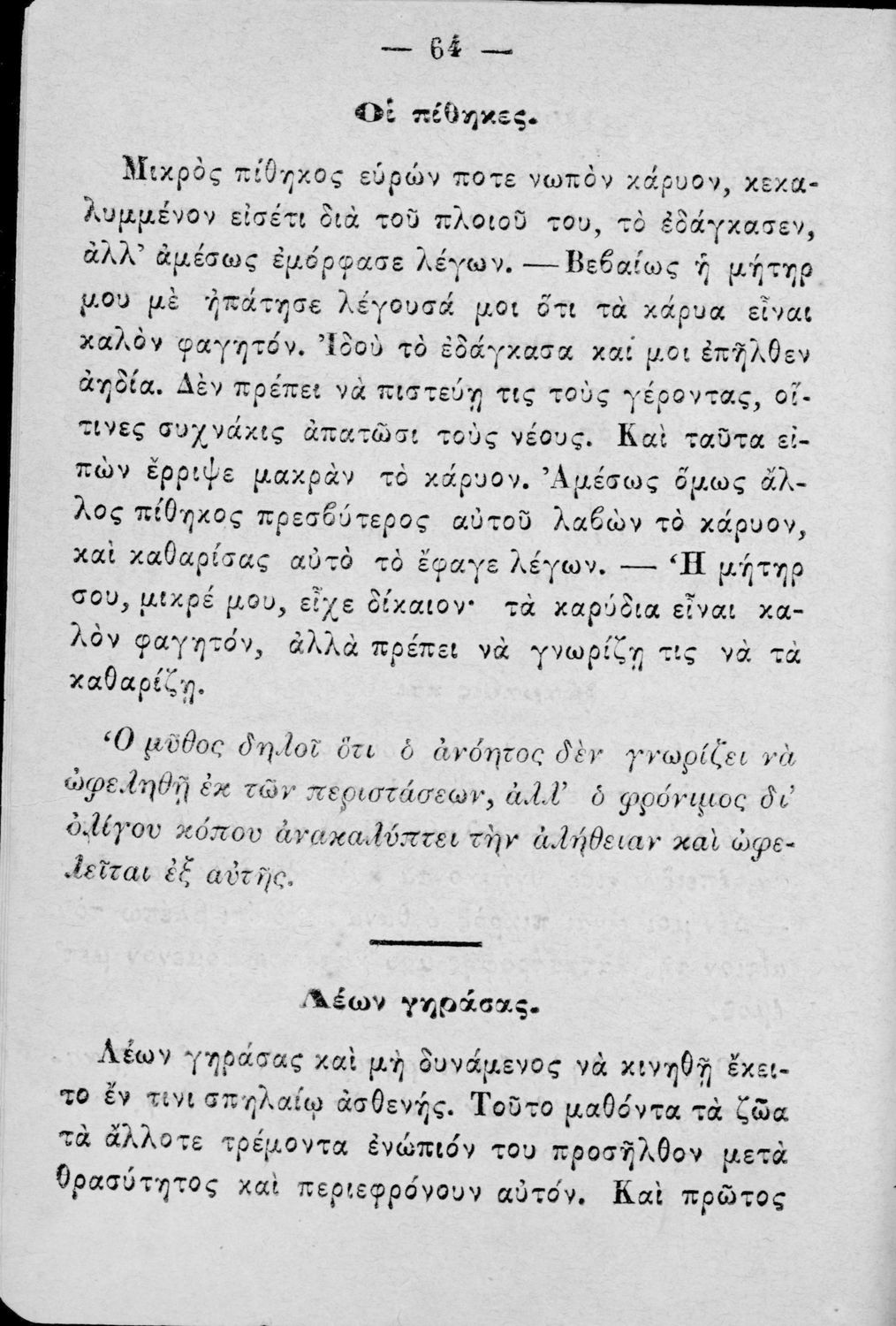 Βαθμίδα εκπαίδευσης: Πρωτοβάθμια Γλώσσα: Απλή καθαρεύουσα Παρουσίαση περιεχομένου: Μαθητικό βοήθημα Δημοτικού που περιλαμβάνει μύθους με ηθικά διδάγματα. |