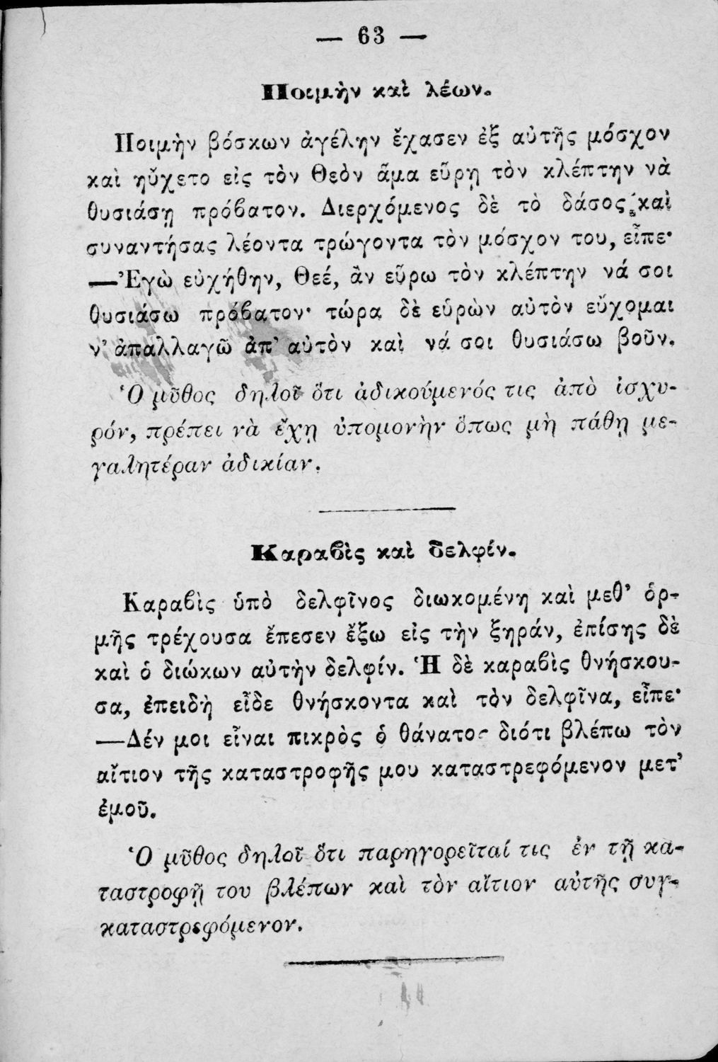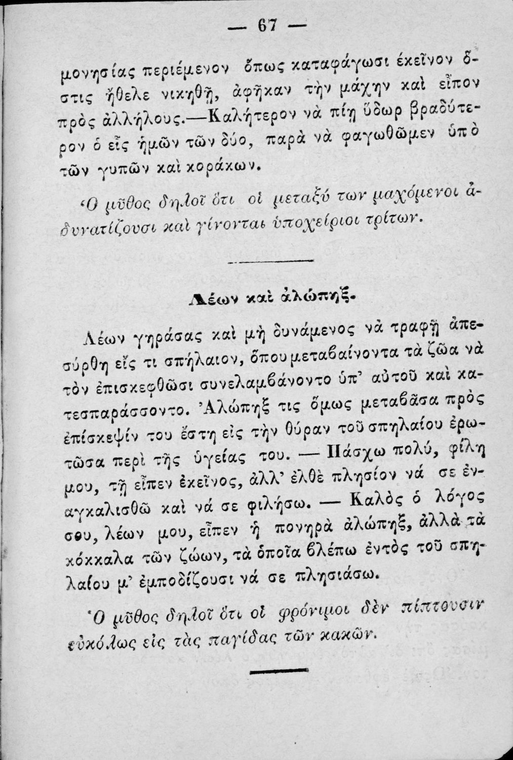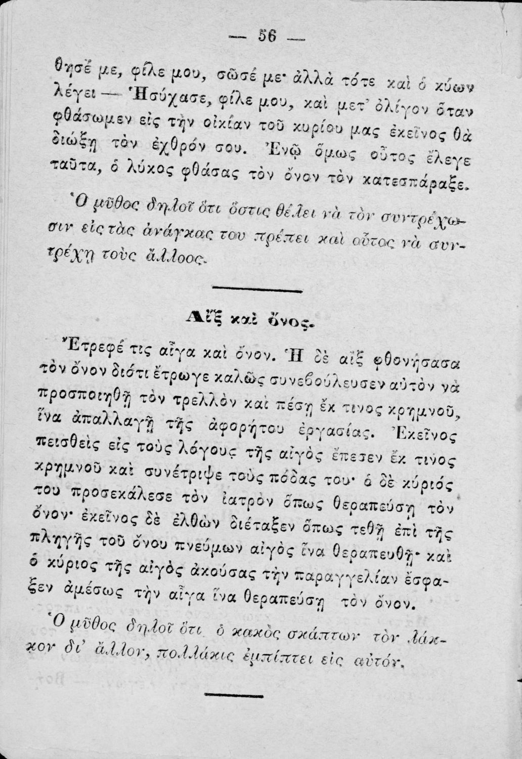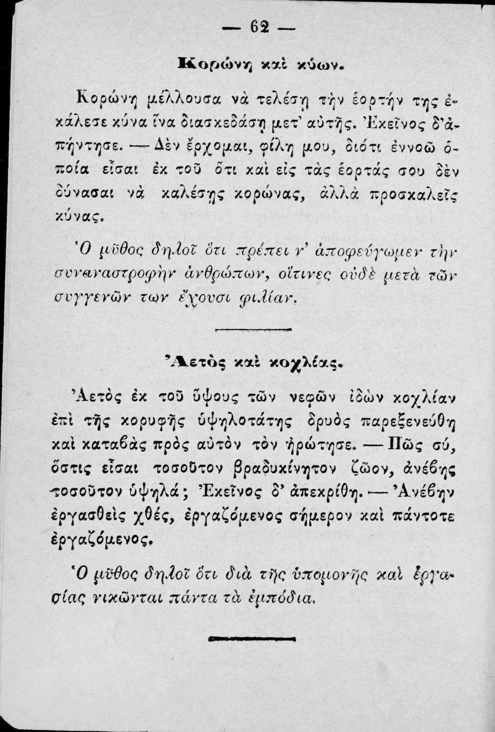 Βαθμίδα εκπαίδευσης: Πρωτοβάθμια Γλώσσα: Απλή καθαρεύουσα Παρουσίαση περιεχομένου: Μαθητικό βοήθημα Δημοτικού που περιλαμβάνει μύθους με ηθικά διδάγματα. |
