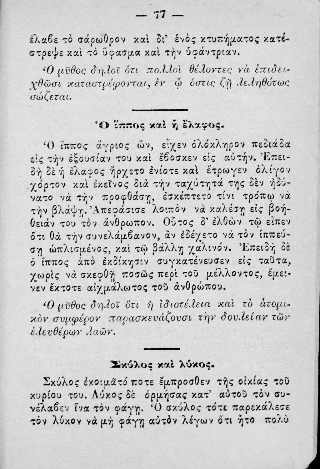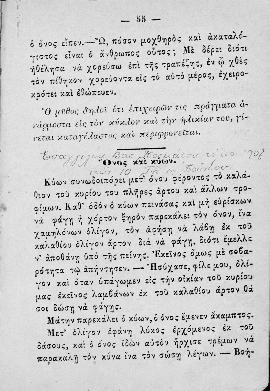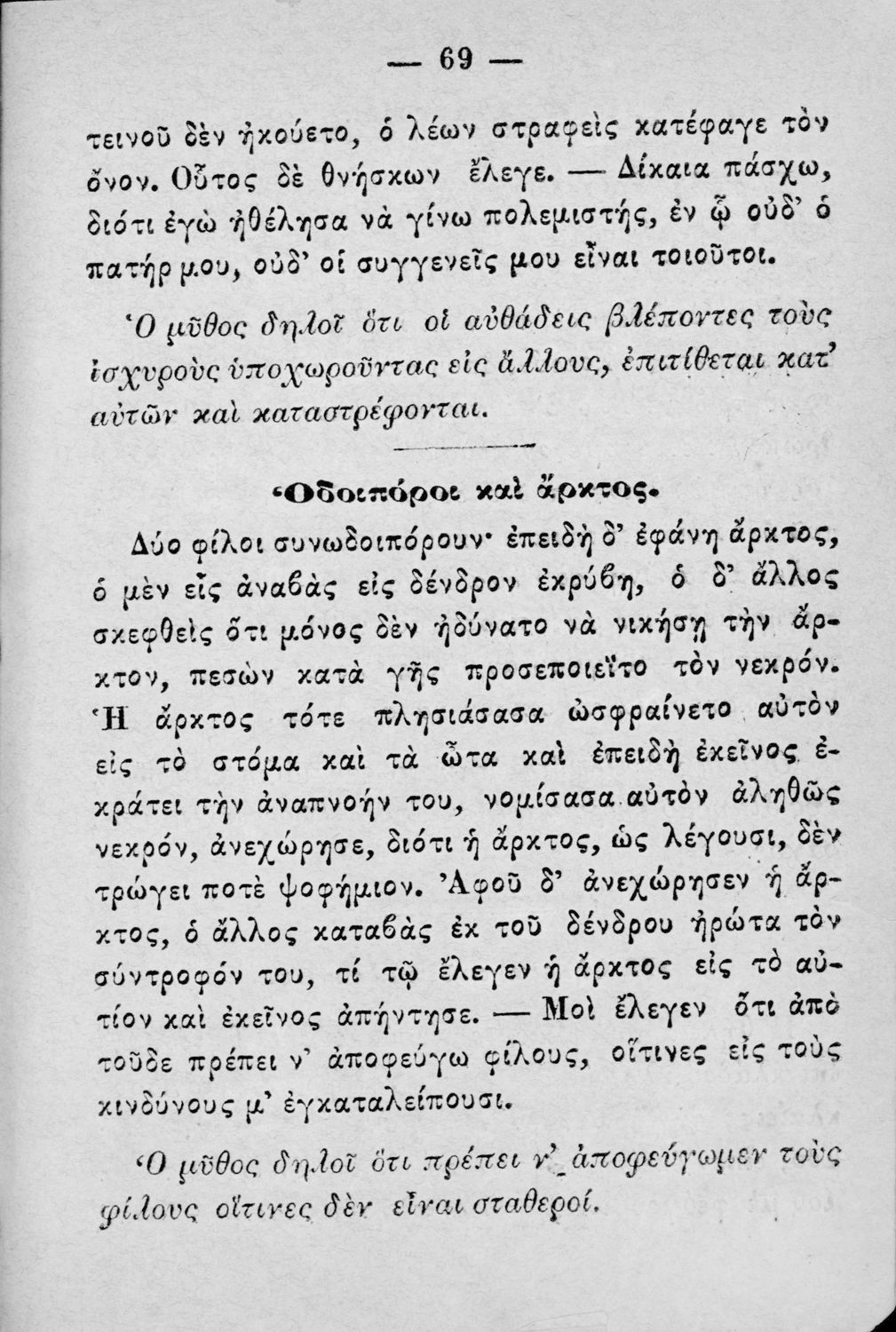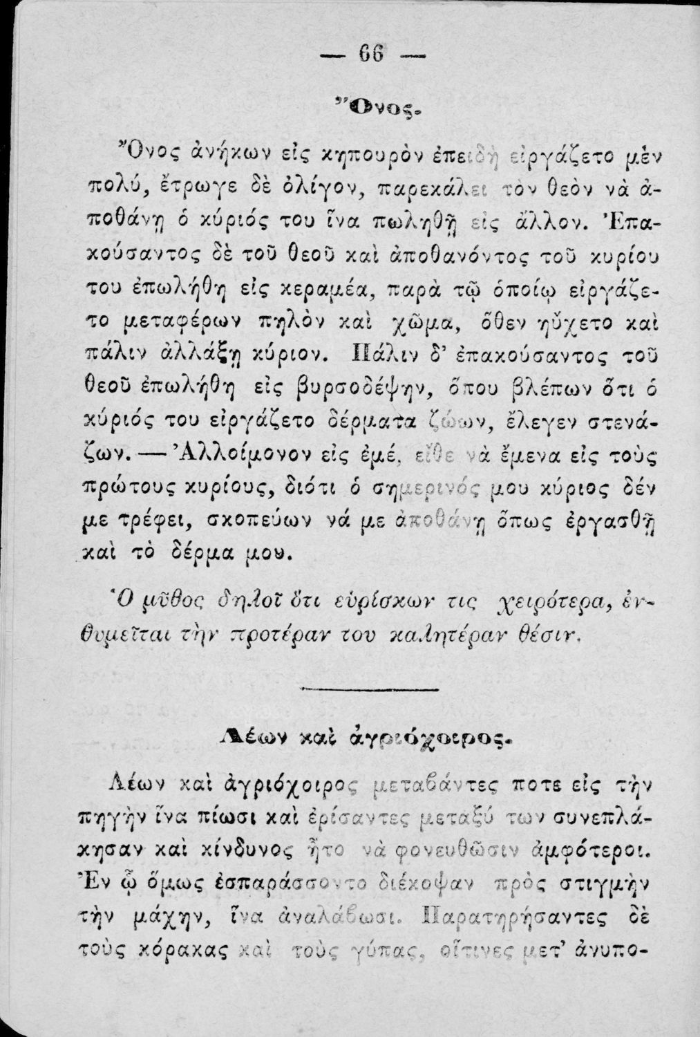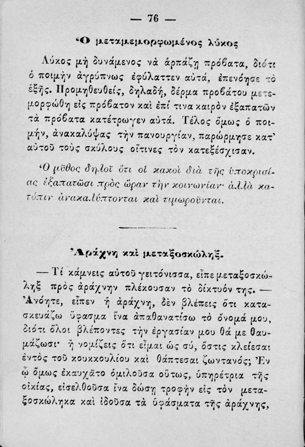 Βαθμίδα εκπαίδευσης: Πρωτοβάθμια Γλώσσα: Απλή καθαρεύουσα Παρουσίαση περιεχομένου: Μαθητικό βοήθημα Δημοτικού που περιλαμβάνει μύθους με ηθικά διδάγματα. |