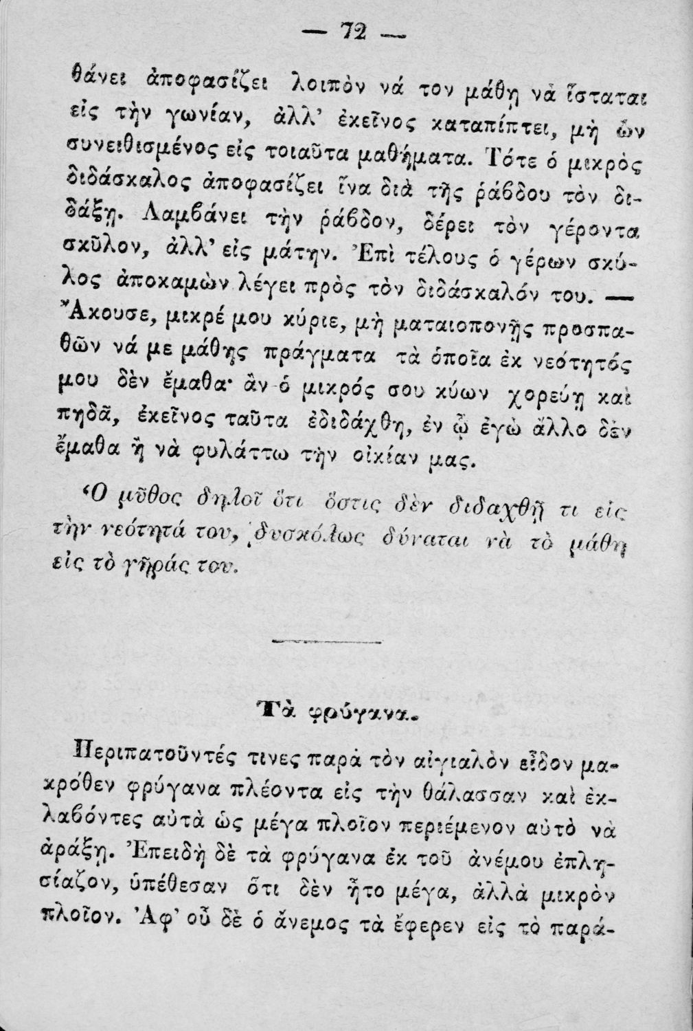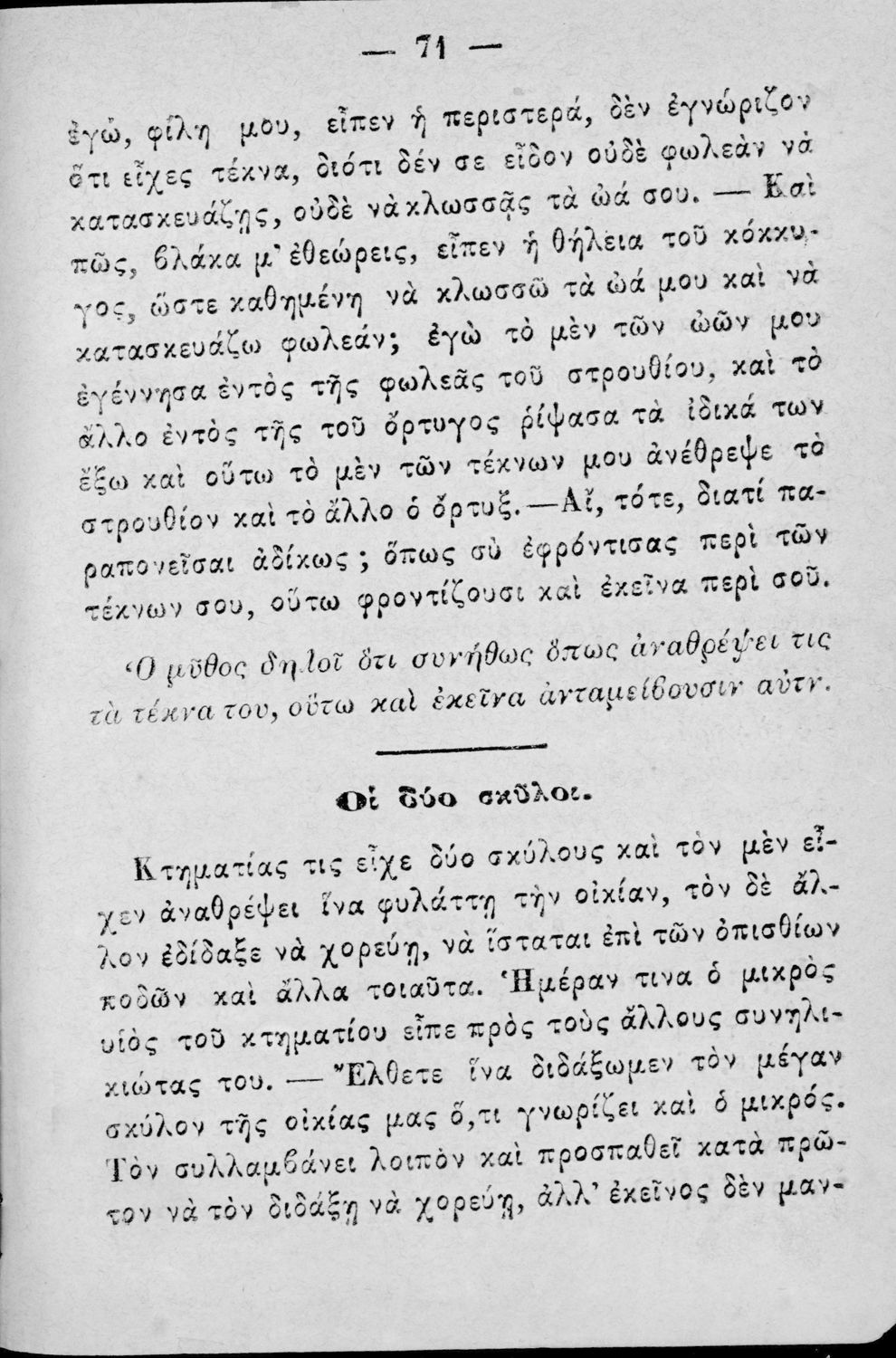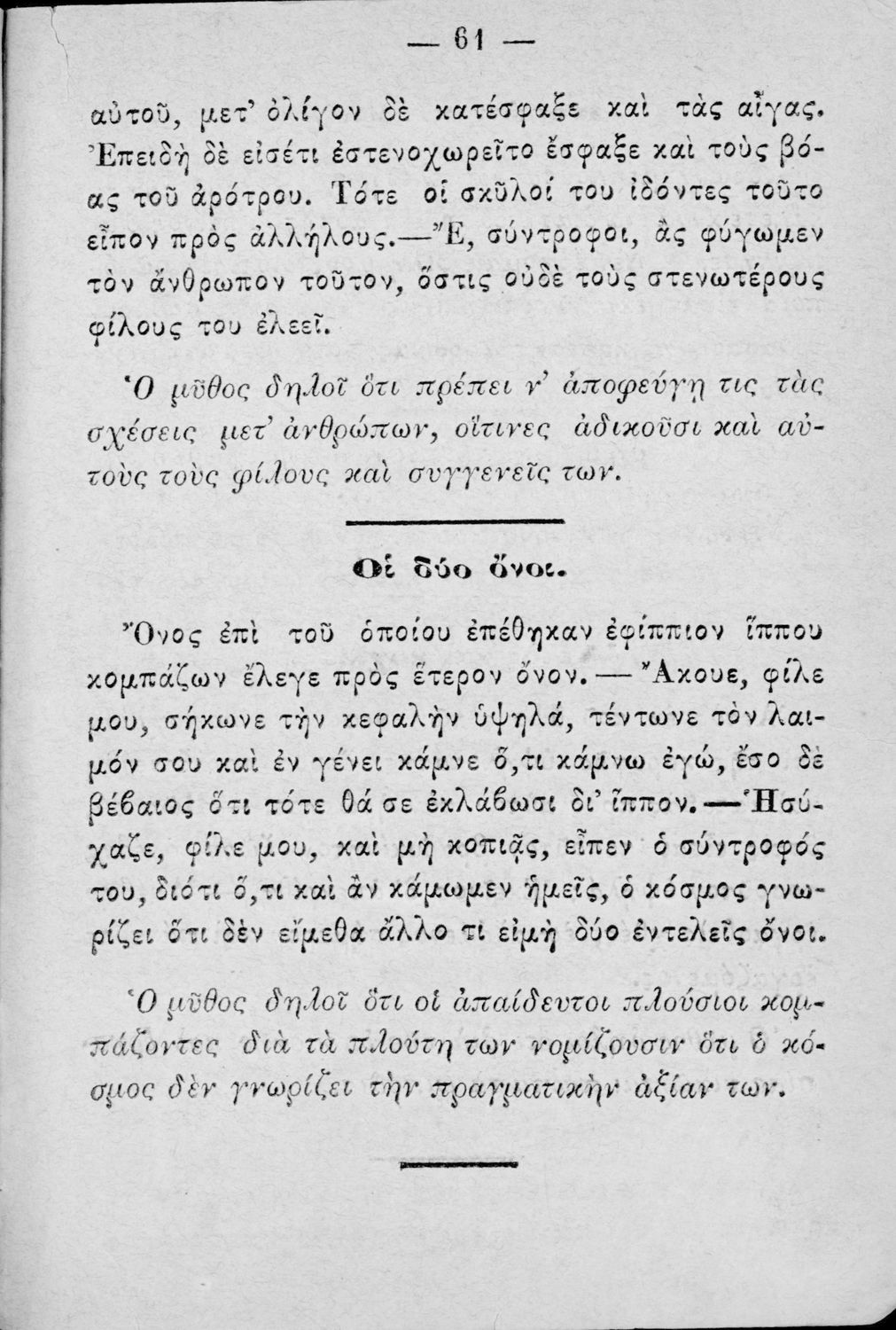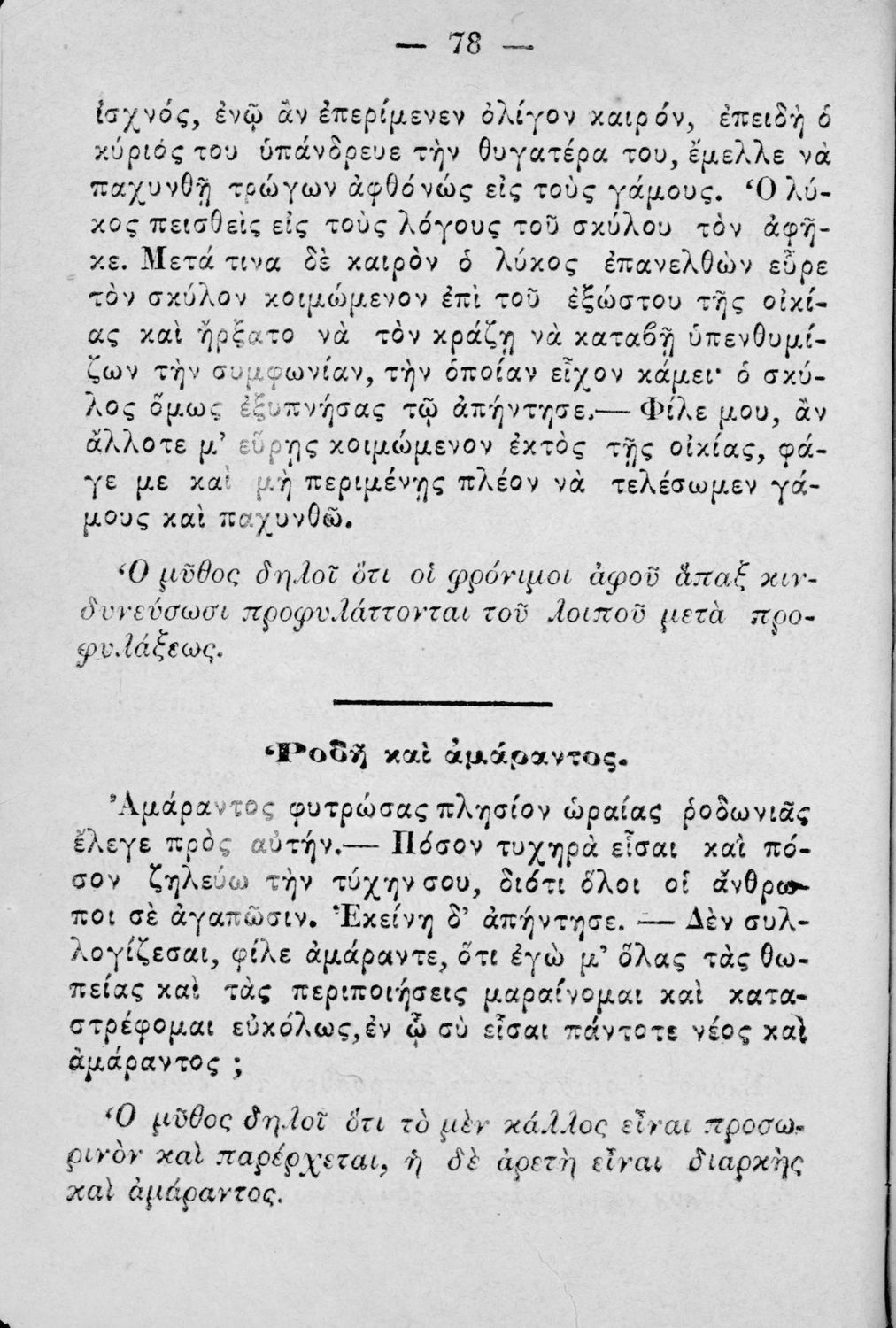 Βαθμίδα εκπαίδευσης: Πρωτοβάθμια Γλώσσα: Απλή καθαρεύουσα Παρουσίαση περιεχομένου: Μαθητικό βοήθημα Δημοτικού που περιλαμβάνει μύθους με ηθικά διδάγματα. |