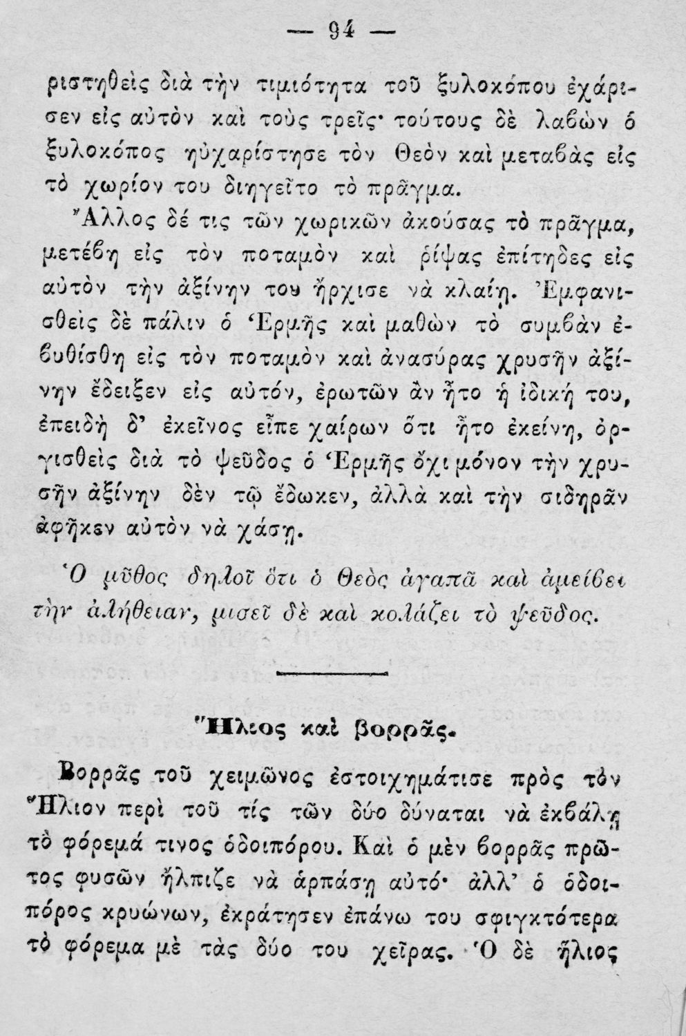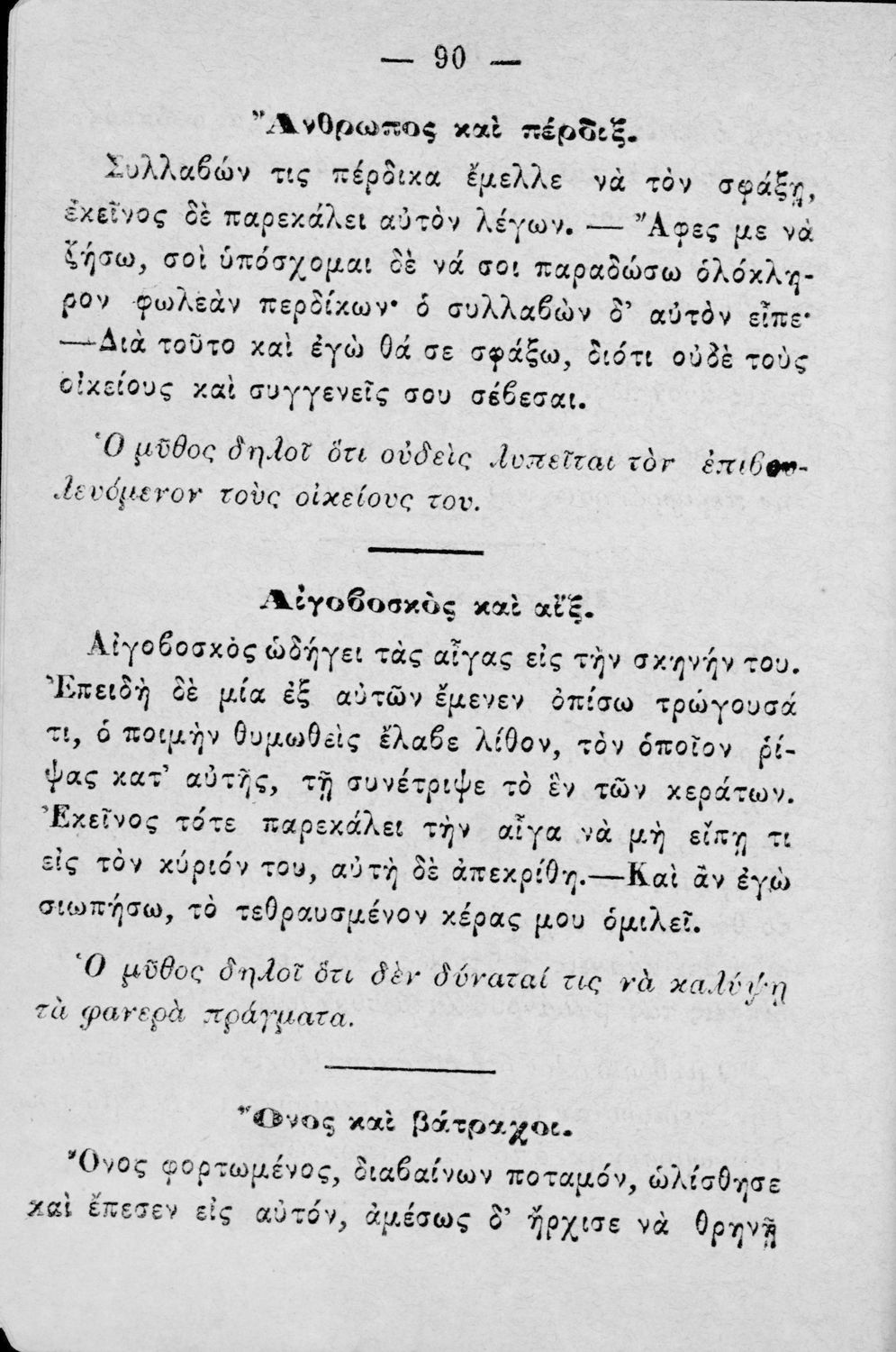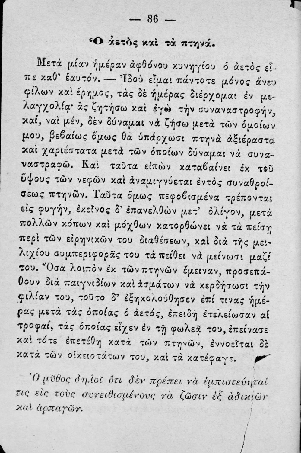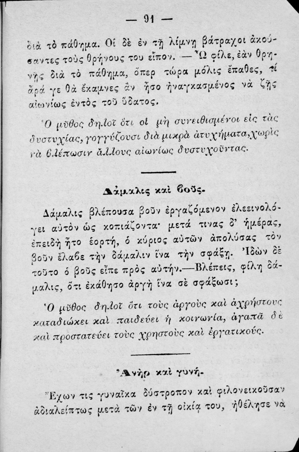Βαθμίδα εκπαίδευσης: Πρωτοβάθμια Γλώσσα: Απλή καθαρεύουσα Παρουσίαση περιεχομένου: Μαθητικό βοήθημα Δημοτικού που περιλαμβάνει μύθους με ηθικά διδάγματα. |