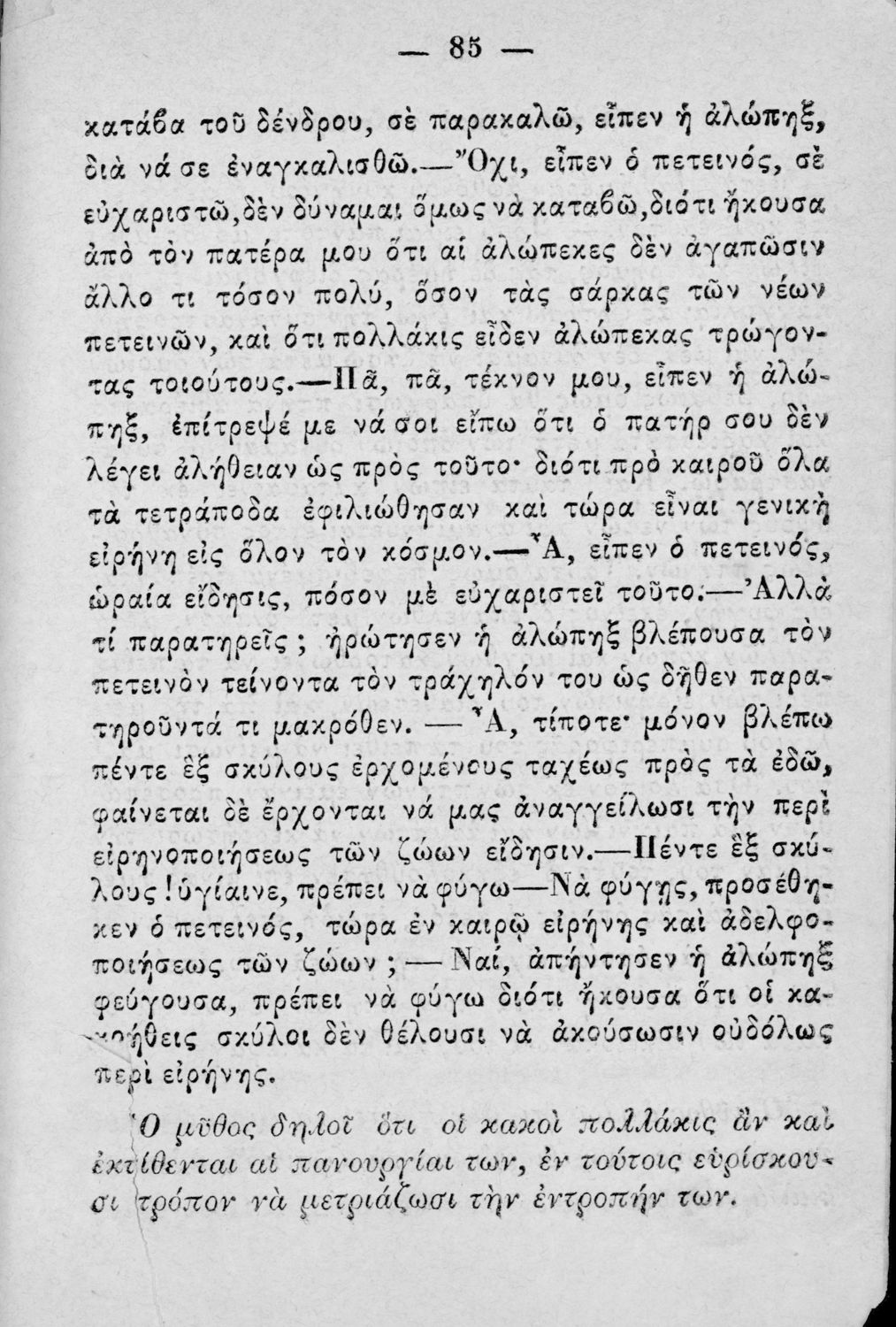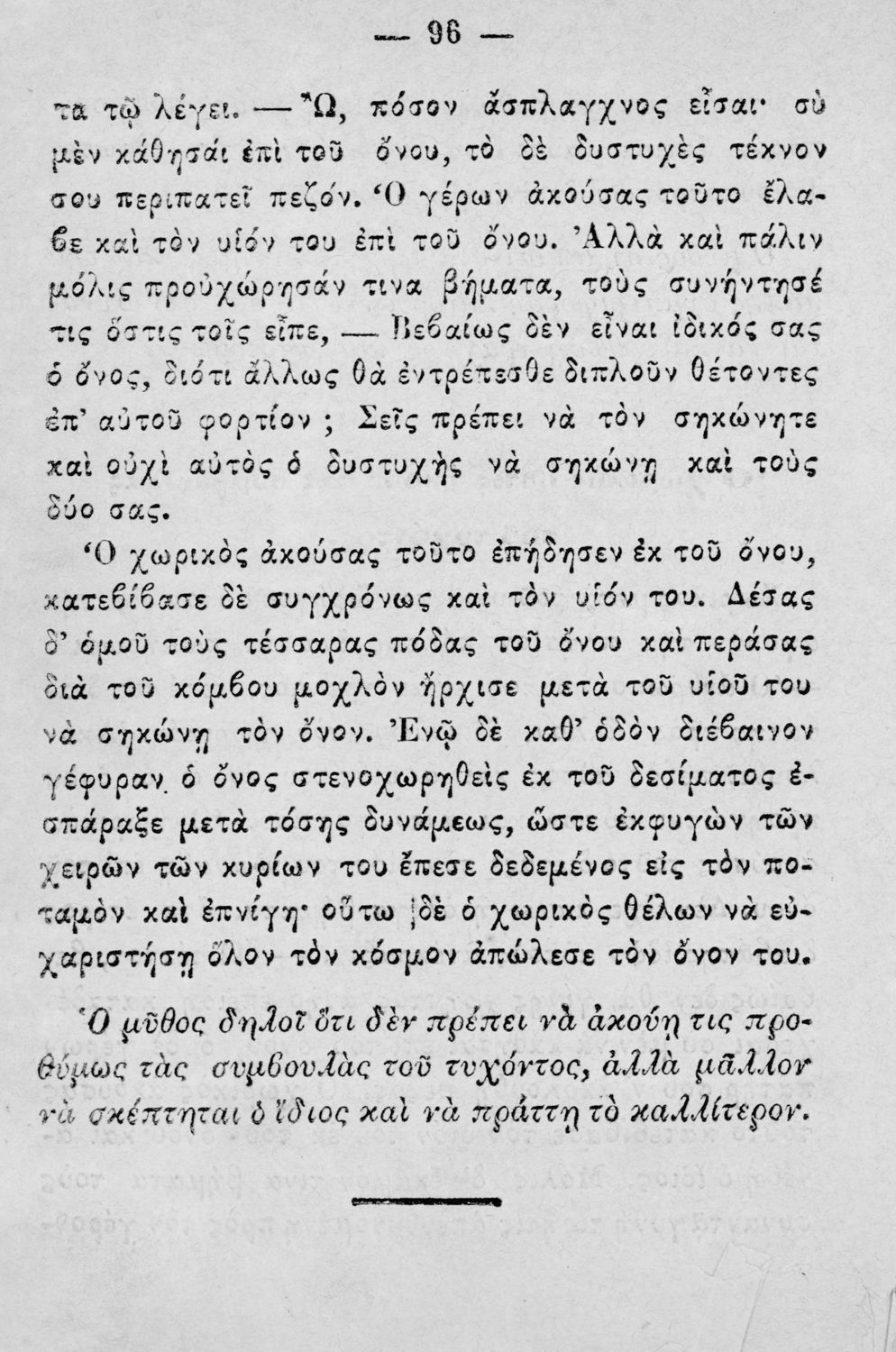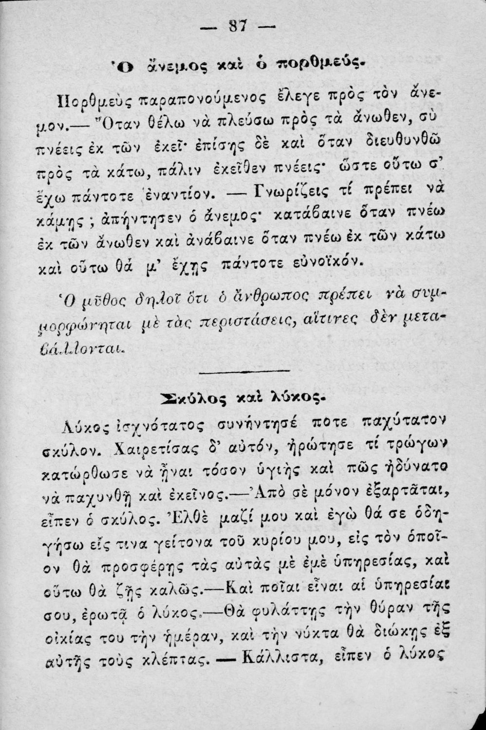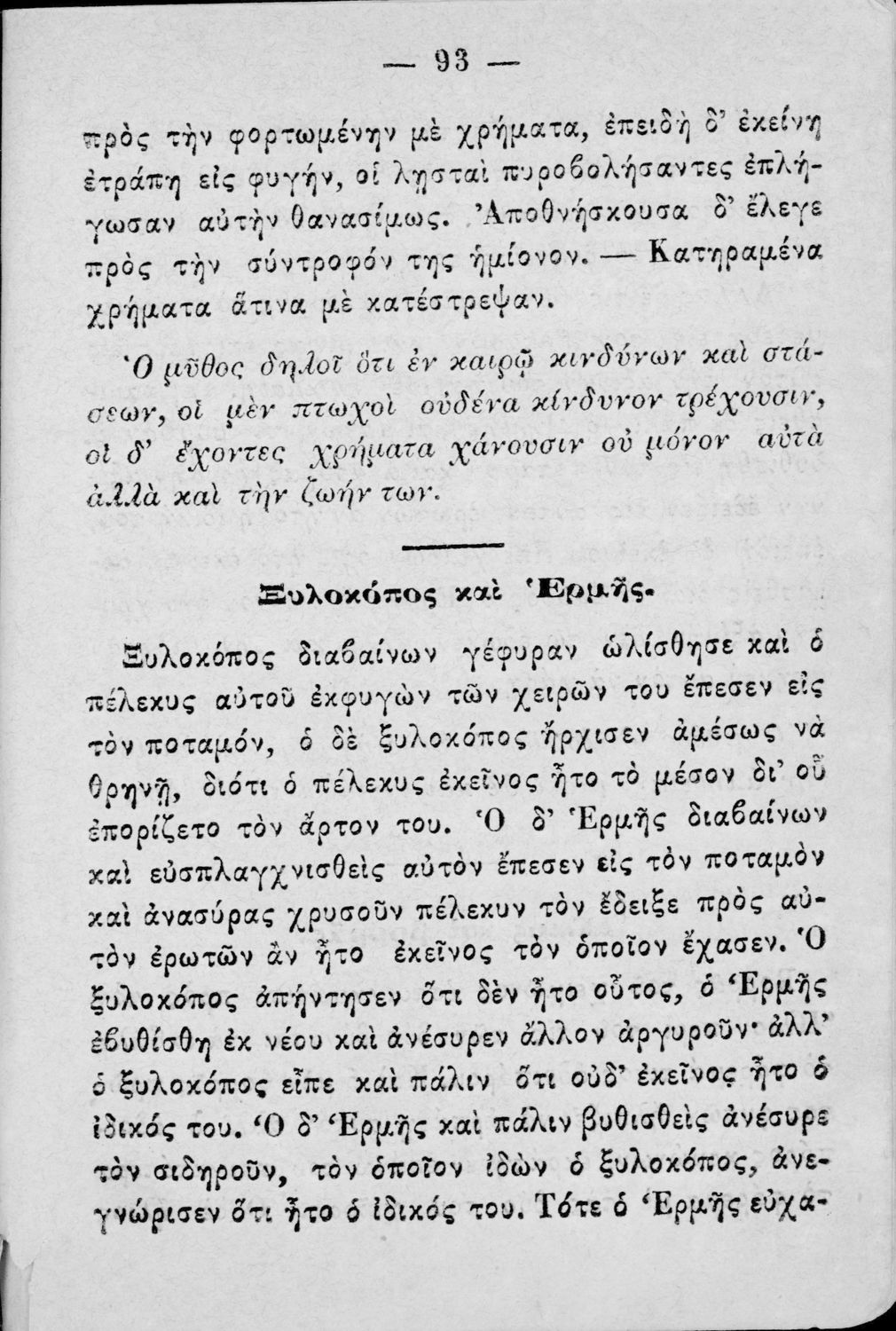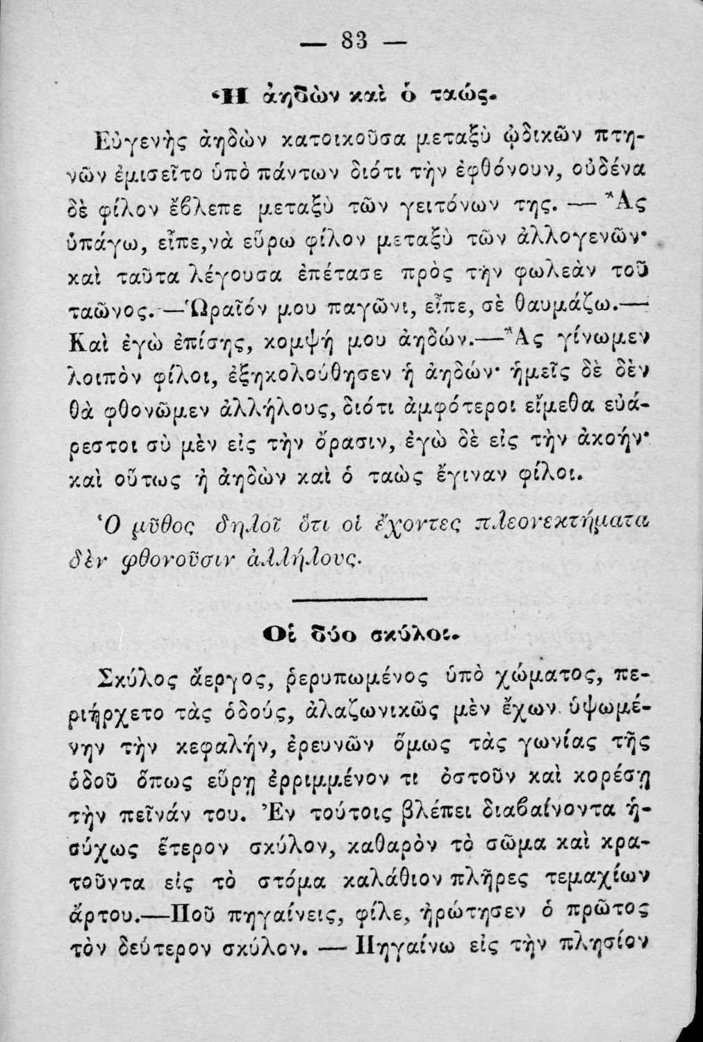 Βαθμίδα εκπαίδευσης: Πρωτοβάθμια Γλώσσα: Απλή καθαρεύουσα Παρουσίαση περιεχομένου: Μαθητικό βοήθημα Δημοτικού που περιλαμβάνει μύθους με ηθικά διδάγματα. |