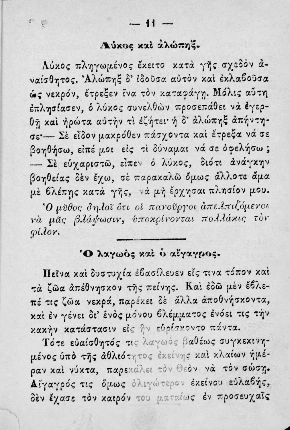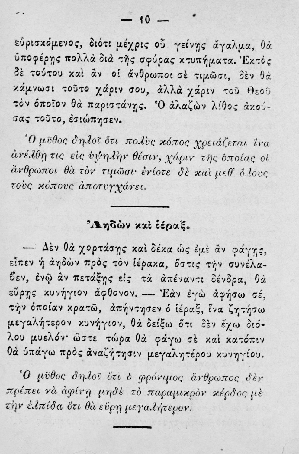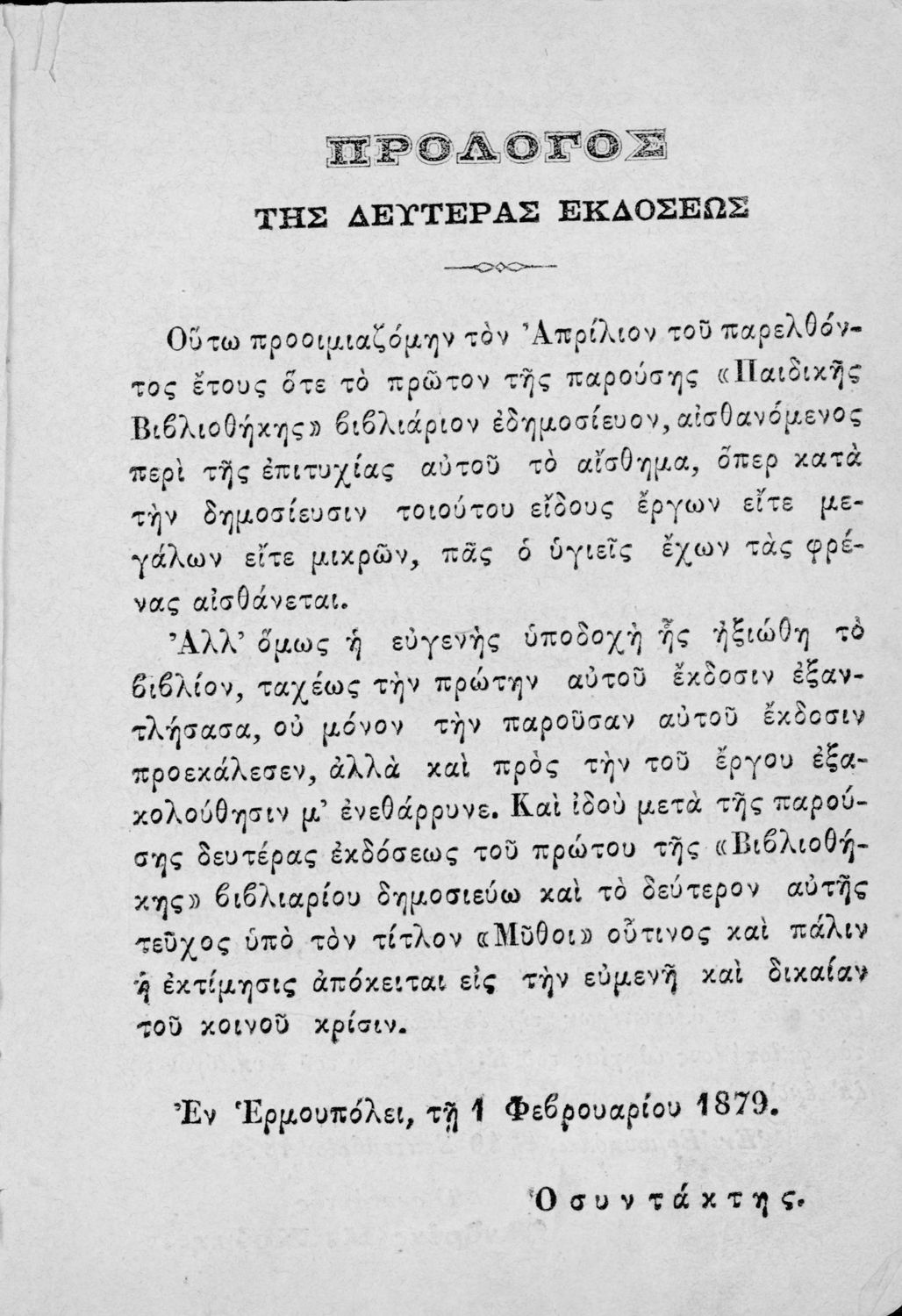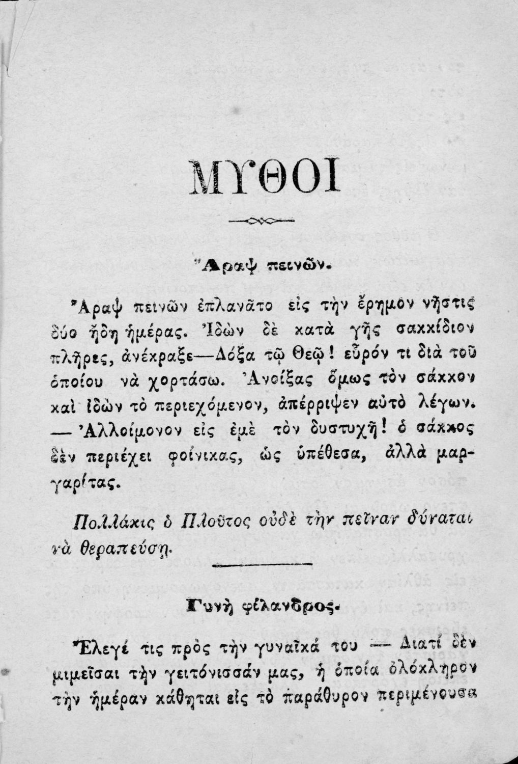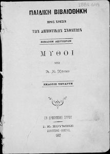 Βαθμίδα εκπαίδευσης: Πρωτοβάθμια Γλώσσα: Απλή καθαρεύουσα Παρουσίαση περιεχομένου: Μαθητικό βοήθημα Δημοτικού που περιλαμβάνει μύθους με ηθικά διδάγματα. |