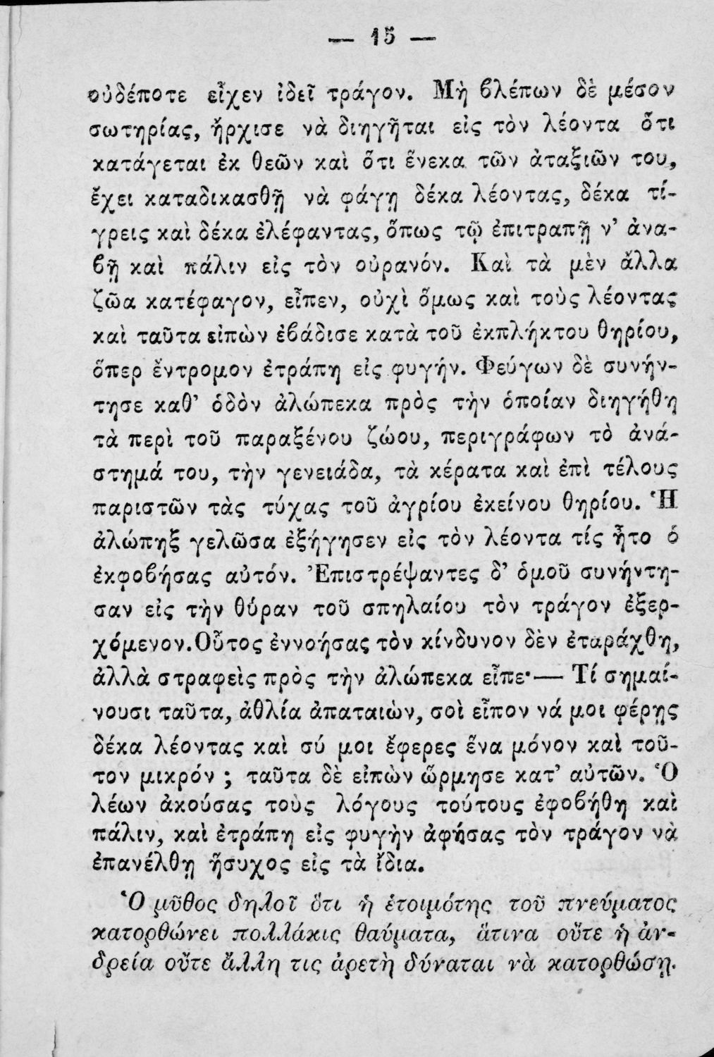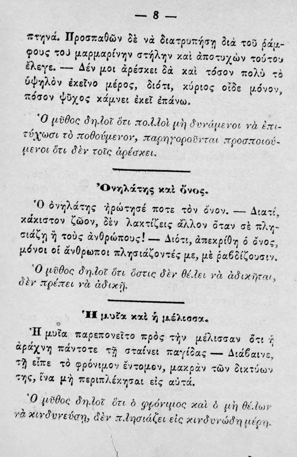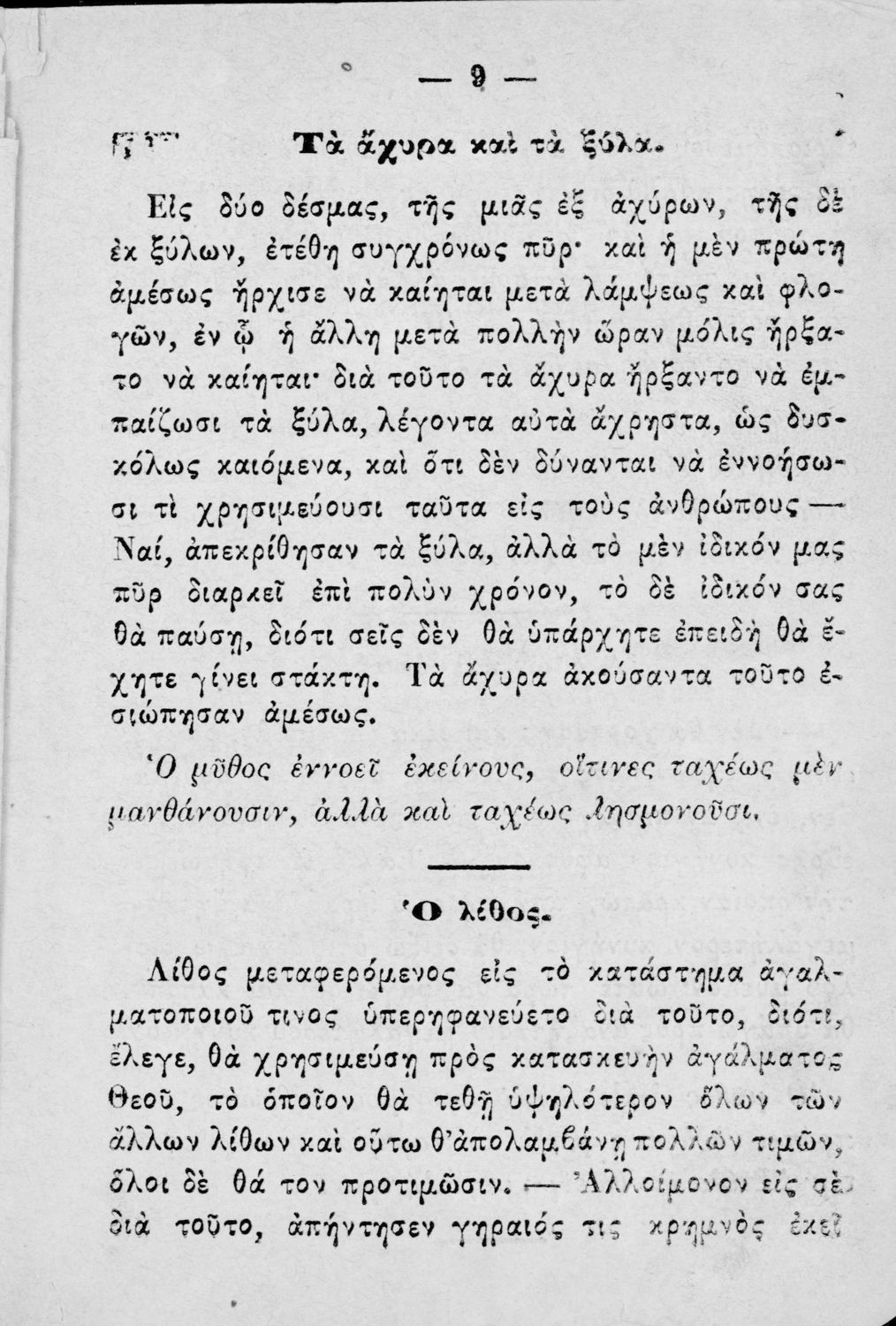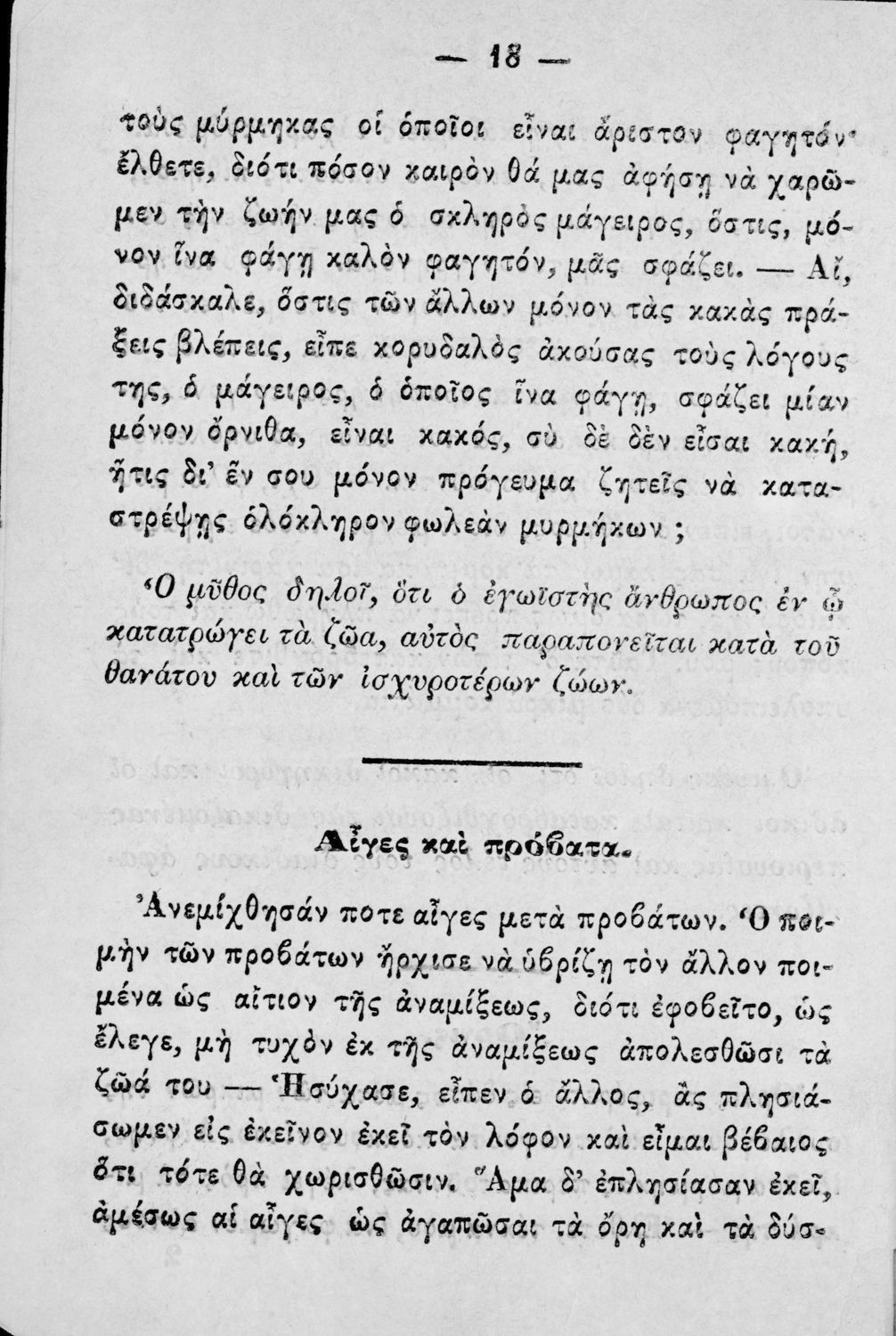 Βαθμίδα εκπαίδευσης: Πρωτοβάθμια Γλώσσα: Απλή καθαρεύουσα Παρουσίαση περιεχομένου: Μαθητικό βοήθημα Δημοτικού που περιλαμβάνει μύθους με ηθικά διδάγματα. |