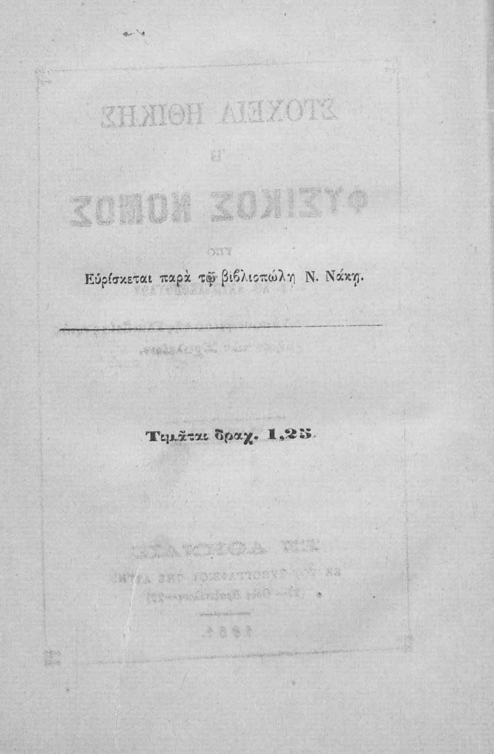 Τίτλος: Στοιχεία ηθικής ή Φυσικός νόμος, εγκρίσει του Υπουργείου της Παιδείας προς χρήσιν των σχολείων
